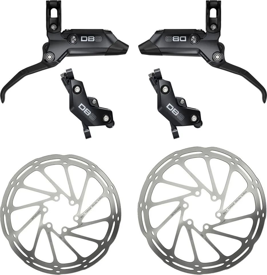 Prodám úplně novou přední a zadní kotoučovou brzdovou sadu SRAM DB8 Stealth + Centerline 200/200 mm. Nové, nejeté, sundané z nového kola. Mají 0 km.