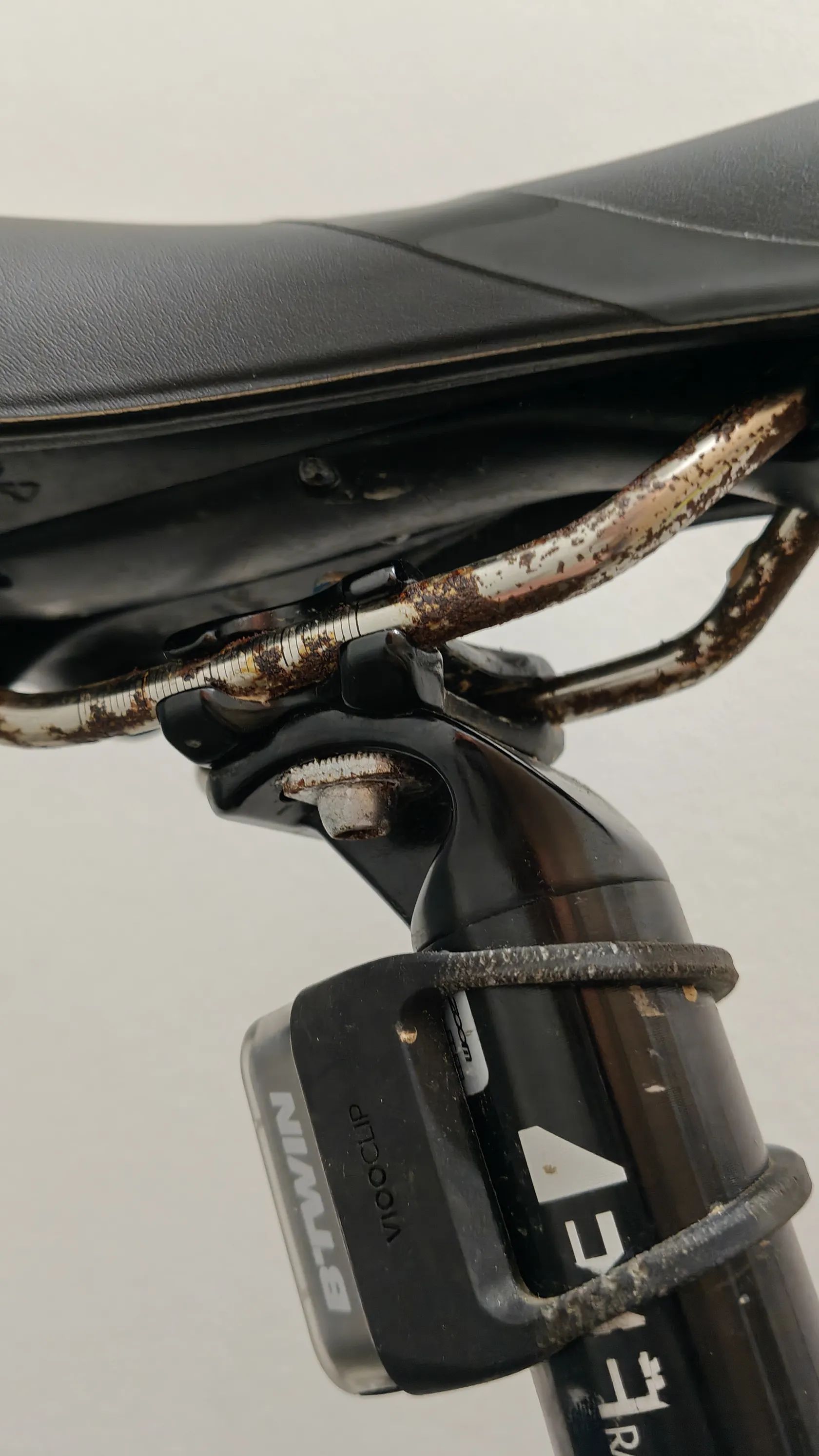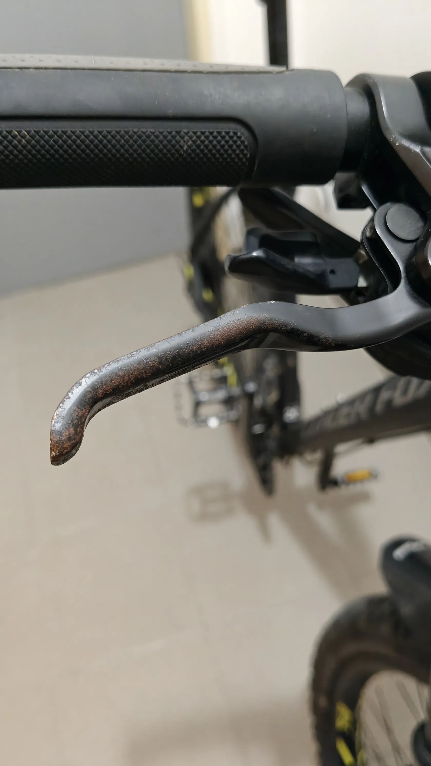 Narovinu říkám, že rozhodně není v TOP stavu a je tam potřeba poladit pár "bolestí", tady je výčet, co vím: aktuálně by to určitě chtělo udělat servis (min. seřídit přehazku + brzdy - levá bere až úplně ve spodu + asi vyčistit střed), po poslední roce, kdy jsem ho měl ve sklepě (kterej jak jsem zjistil je totálně vlhkej :( ) jsem si až nyní všiml, že kliky a úchyt sedla chytly povrchovou korozi (viz fotky) - jako asi to není úplná tragédie, ale bude to chtít pořešit + samozřejmě nějaké ty oděrky na rámu, klikách atd jsou také (ale opět asi nic fatálního - naprasklé nebo tak něco to určitě není).