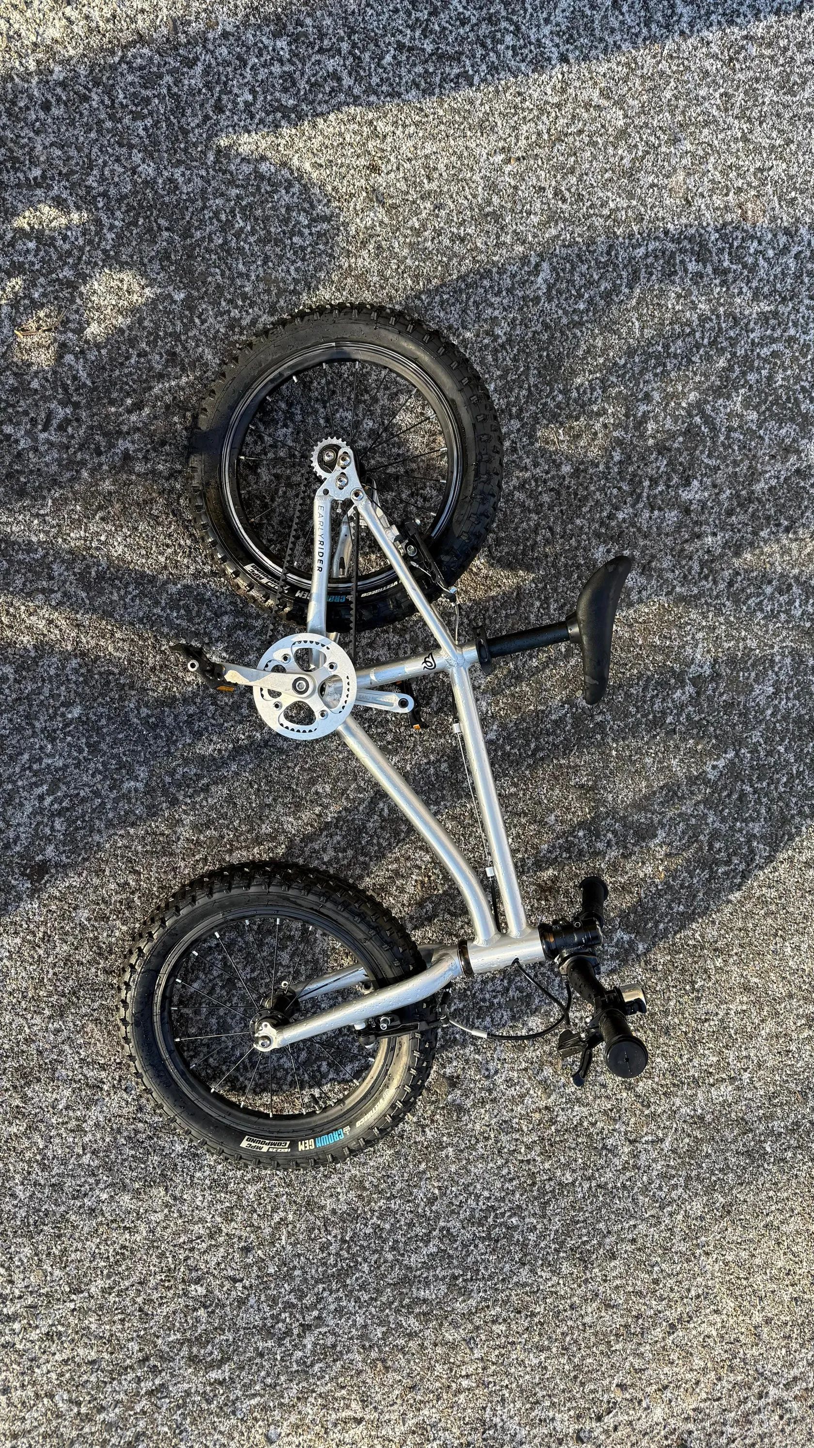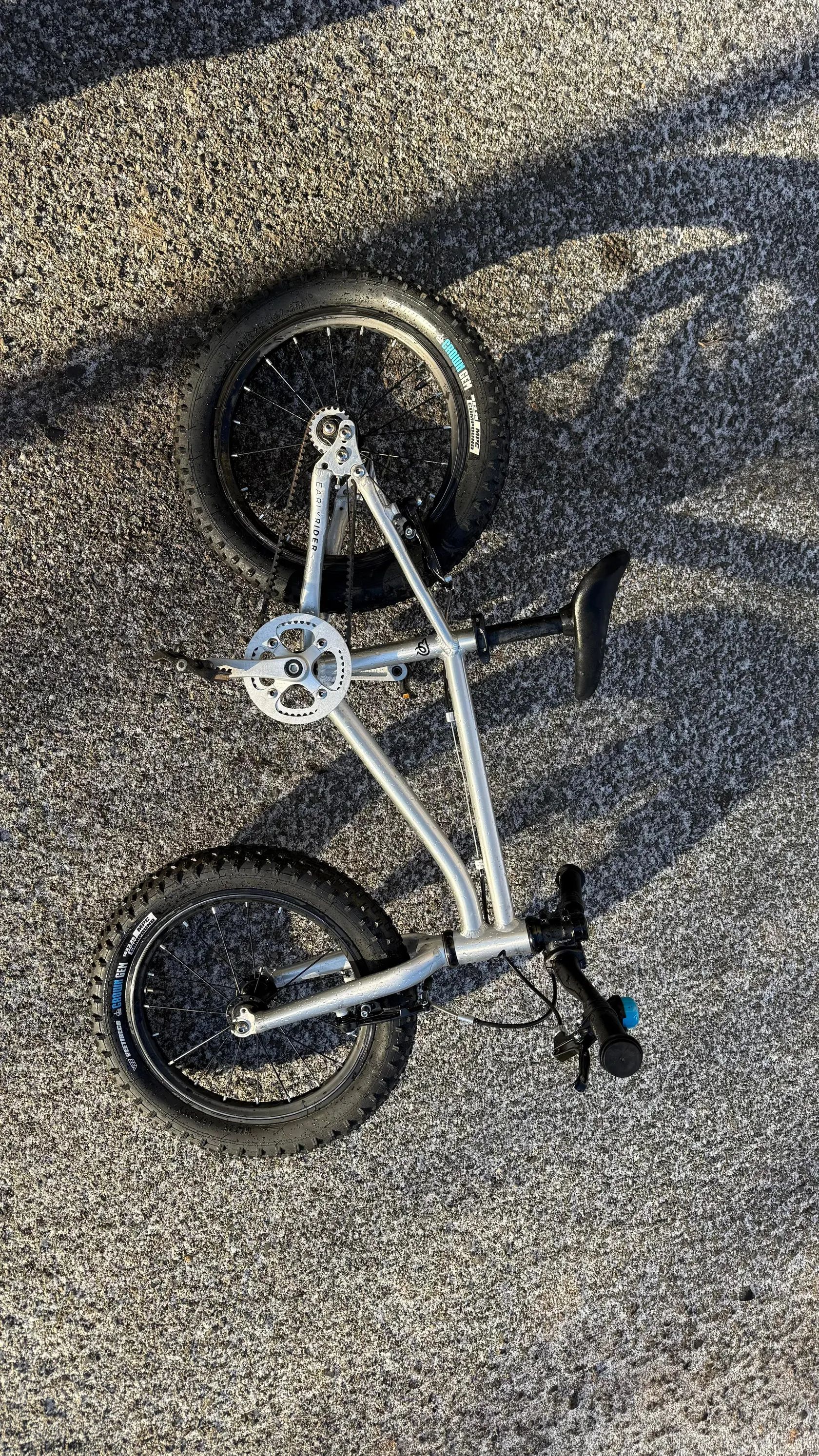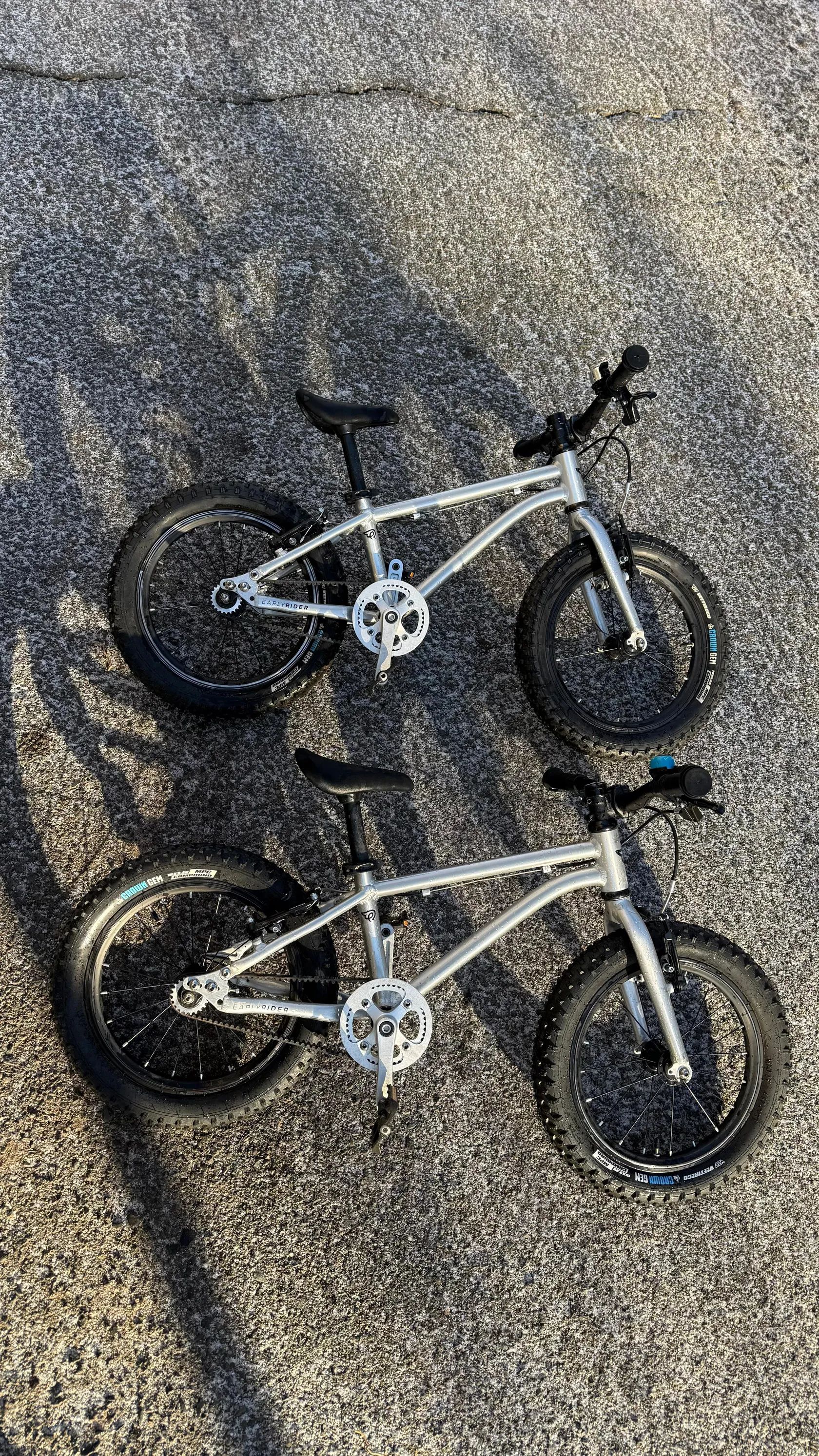 ℹ️ Základní informace: – 2× Early Rider Seeker 16” – 8.000 Kč / 1 ks – doporučený věk: cca 4–6 let (záleží na výšce a zkušenostech dítěte) – výška sedla: od cca 45 cm – hmotnost kola: cca 5,9 kg – širší pláště 2,25” → stabilní i v terénu – řemenový pohon místo klasického řetězu (minimální údržba, žádná mastnota na nohavicích)