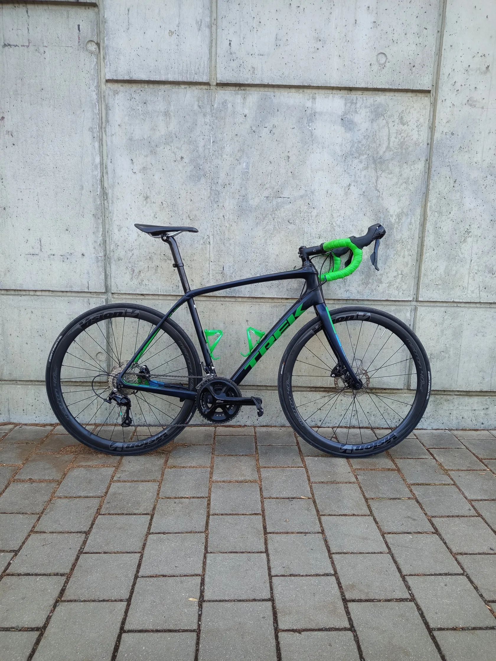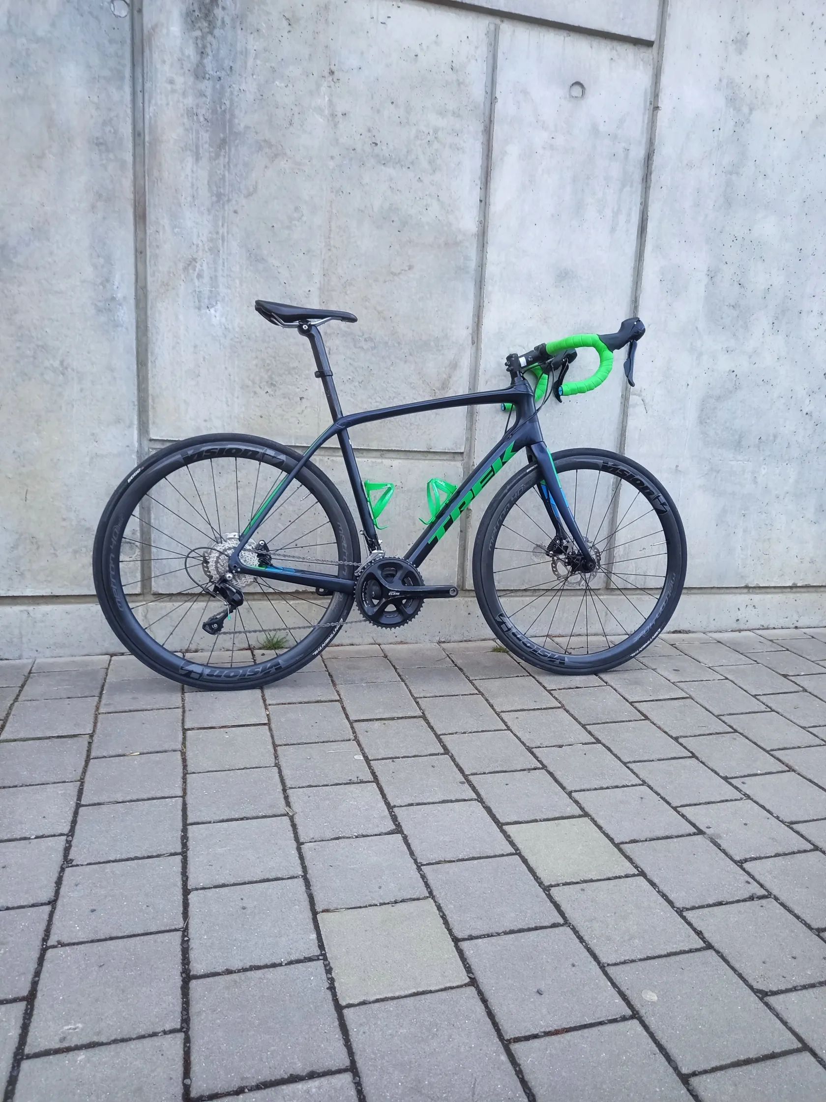 Kompletní sada Shimano 105 (mechanické řazení) – spolehlivá a přesná Kotoučové brzdy – jistý brzdný výkon za každého počasí Karbonový rám Trek – bez prasklin, strukturálně v pořádku Karbonová kola Vision Standardní silniční převody vhodné pro trénink i kopce
