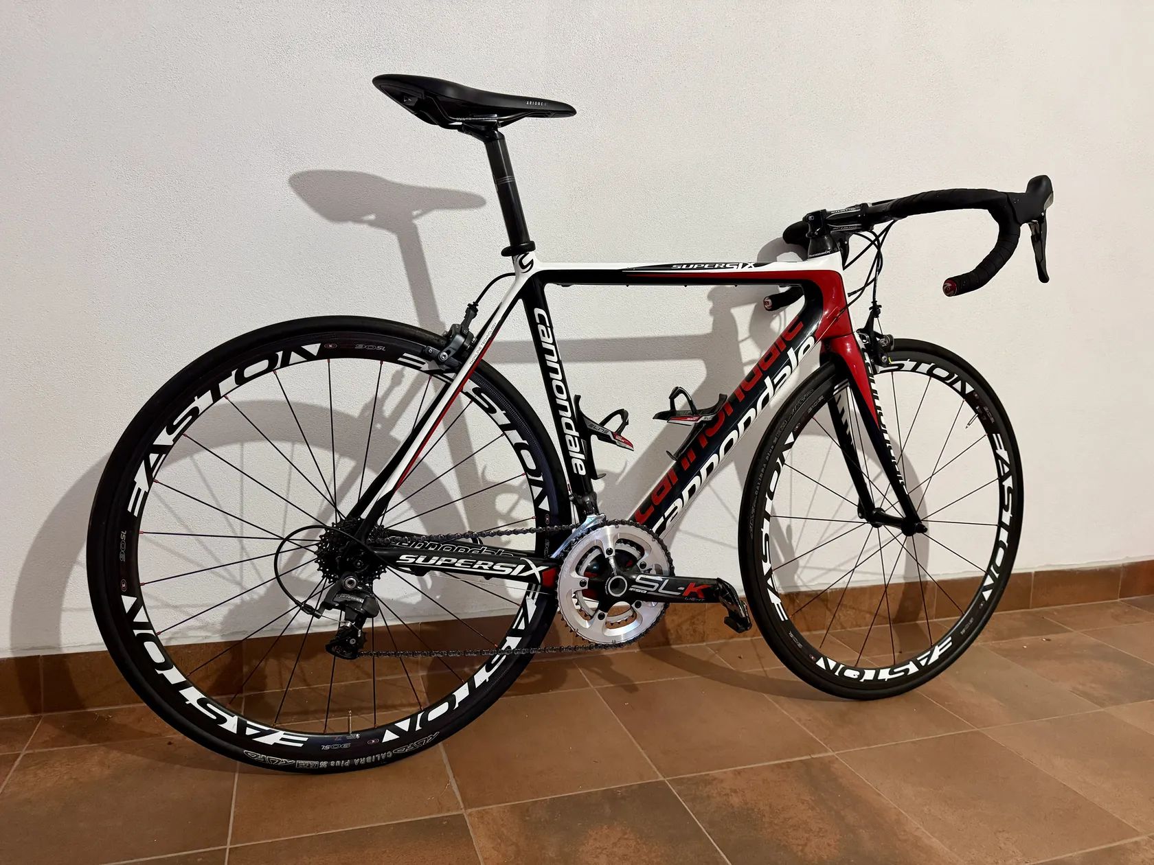 Prodám karbonové kolo Cannondale Supersix, velikost 54. Osobně mám 180cm. Osazení Shimano Ultegra, karbonové kliky FSA SLK 50/34, desetikolo 12-28, sedlo Fizik Arione R, představec a říditka Ritchey, karbonová kola Easton EC90 SL v top stavu, kolo nikdy nemělo havárii, nikdy nejezdilo v zimě a soli, na rám je doživotní záruka.