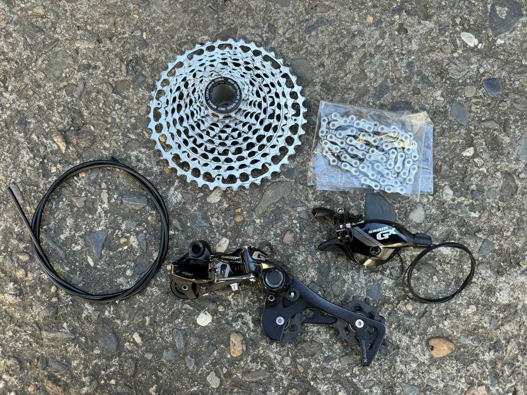 Prodám použitou sadu z dětského kola. Jedná se o přehazovačku GX, řazení GX, řetěz Sram a kazeta Sroad WSD 8011-1142-B1 s rozsahem 11-42 zubů. Vše je jeté dítětem 2 sezony a funkční, v hezkém stavu. Kazeta je zánovní. Nejlépe jako komplet, ale na dotaz mohu prodat i zvlášť. Uvedená cena je za kompletní sadu viz foto. Mohu předat osobně v Praze, nebo zašlu PPL po platbě předem.