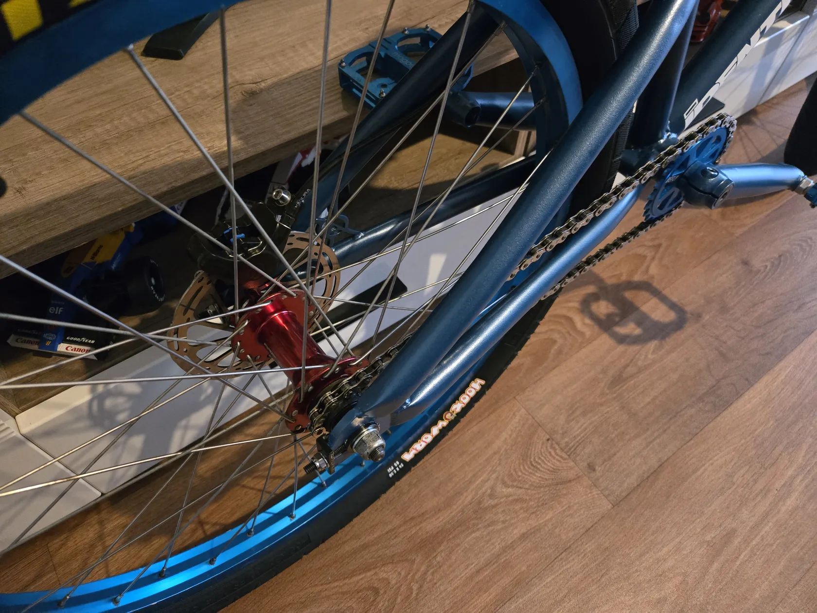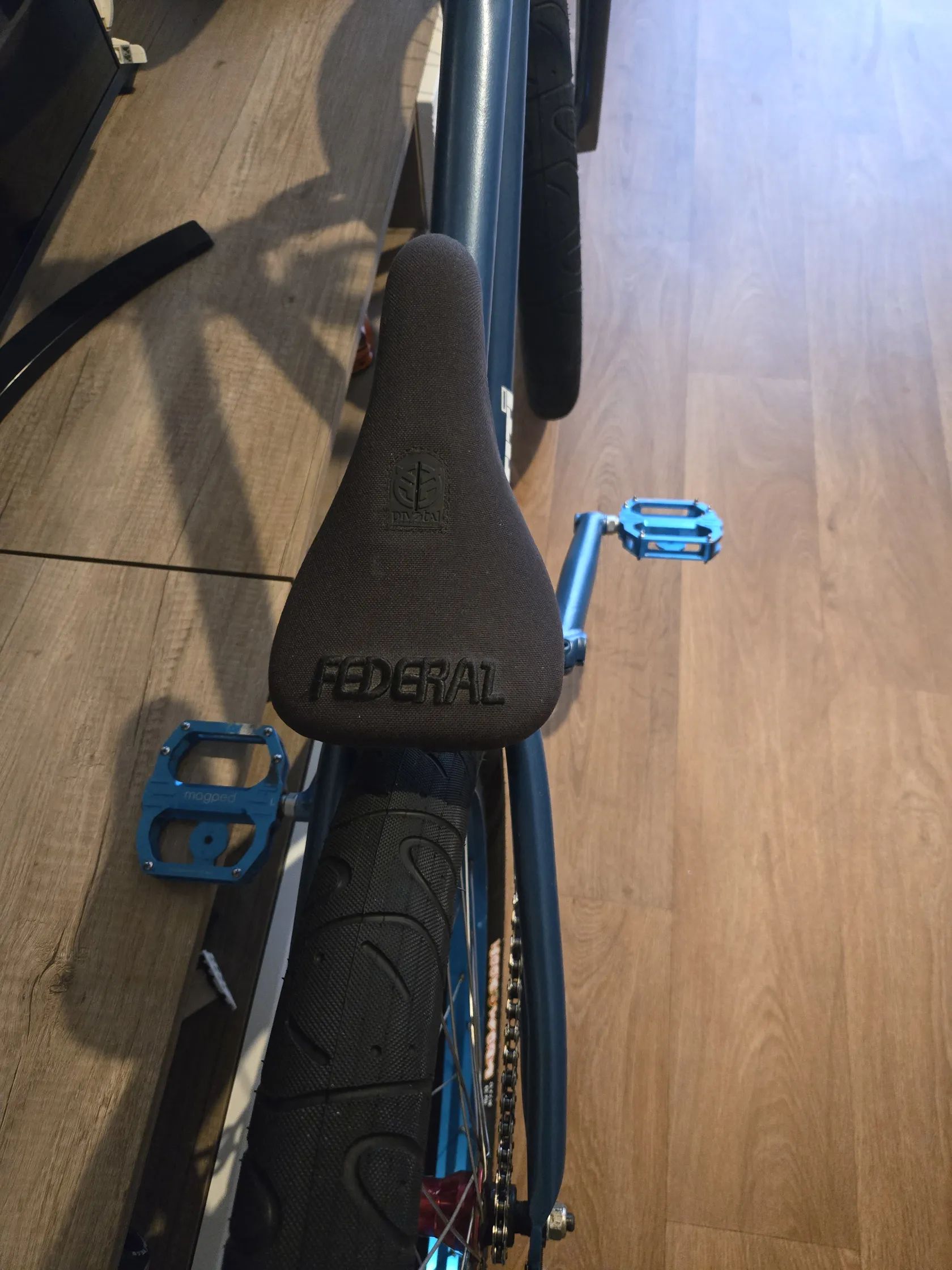 Sedlo Federal pivotal, záplety Aliation – běžné BMX/freestyle komponenty, zbytek částečně jetý