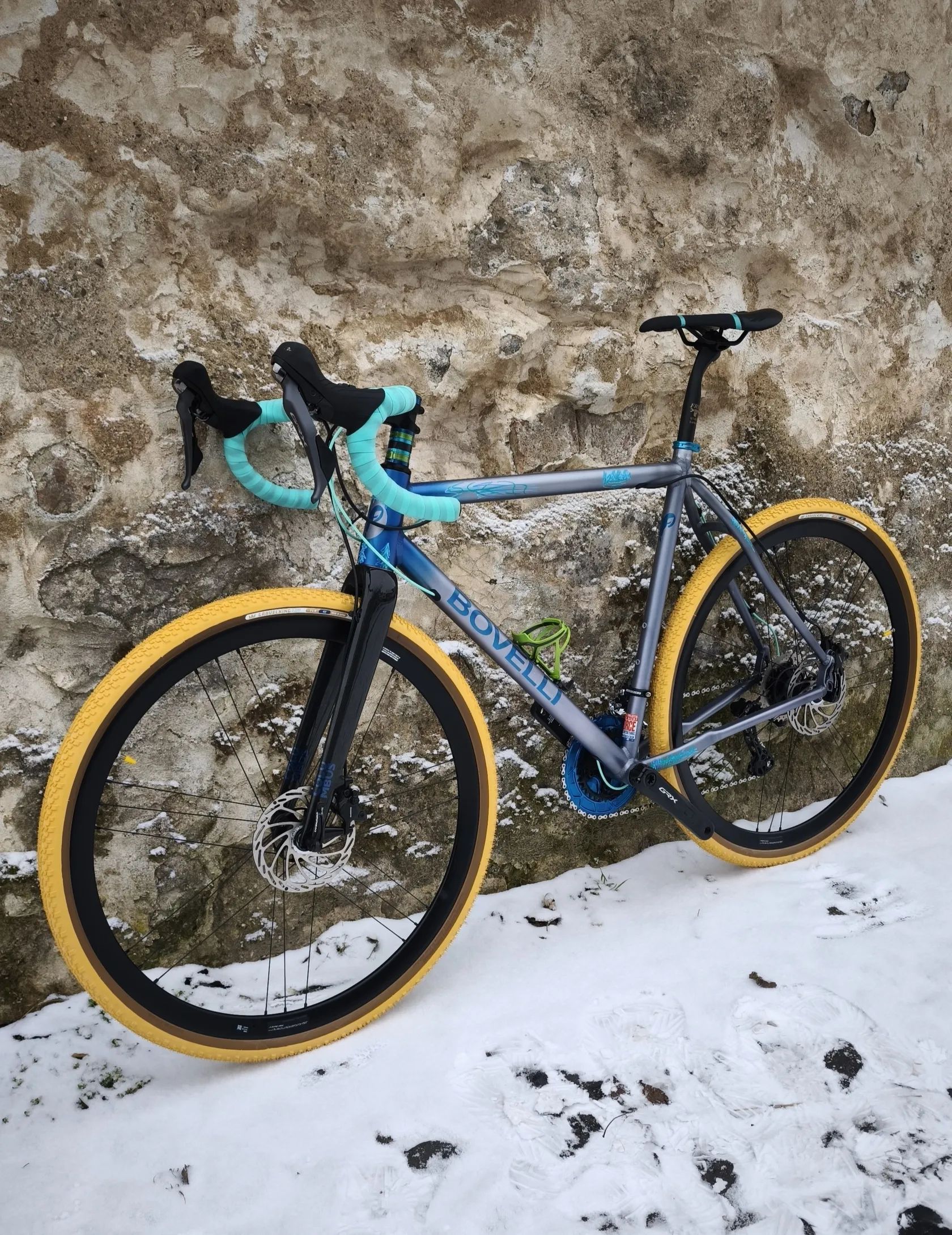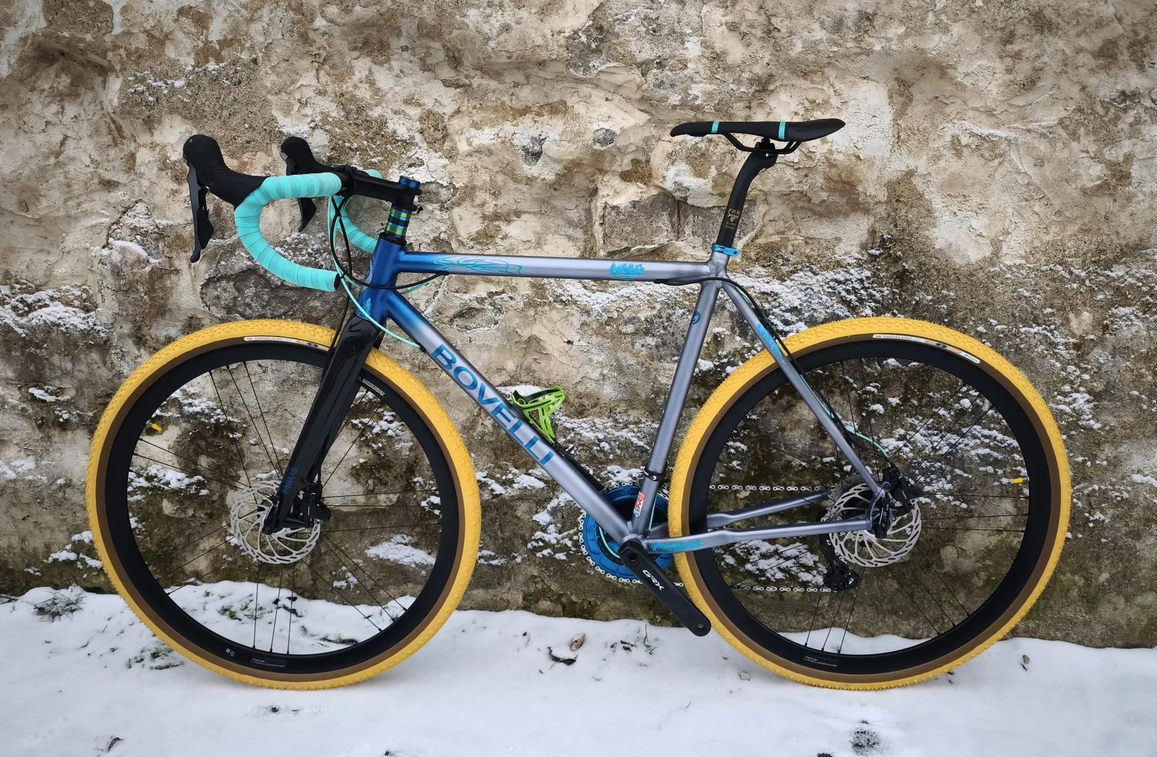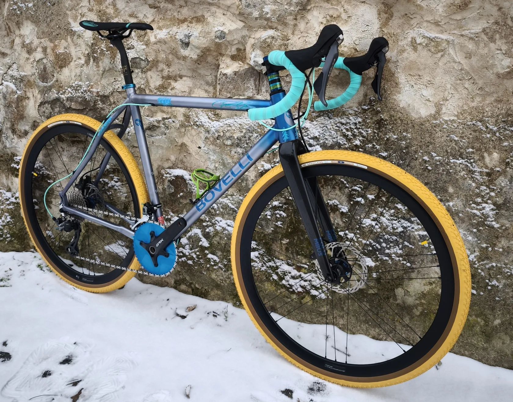 Alu Gravel BOVELLI postavený z italských trubek Dedacciai s karbonovou vidlicí Columbus. Váha 8,8kg. Pevné a lehké výplety Campagnolo na 130kg, sada Shimano GRX 810 2x11, kliky GRX 820 s převodníky Alugear 48/32, kazeta 11-34. Pláště Panaracer 40mm, představec a řidítka Deda Zero 100. Sedlo Selle Italia.