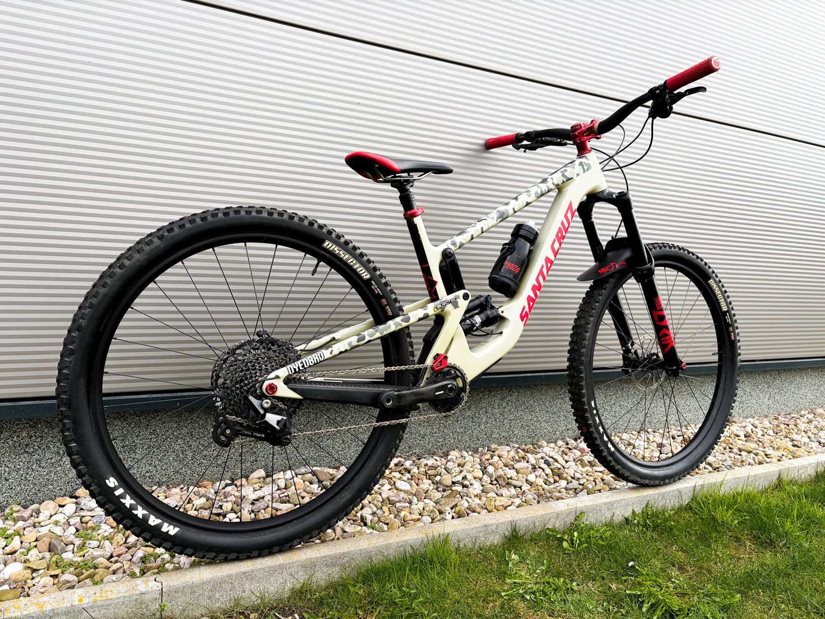 Vidlice i tlumič po velkém servisu (doložím fakturou), všechna ložiska v zadní stavbě vyměněna. Rám má kosmetiku z běžného používání, převážně na zadní stavbě - na kole se jezdilo, ale nemá žádné strukturální vady v karbonu. Rám je polepen ochrannou fólií Dyedbro.