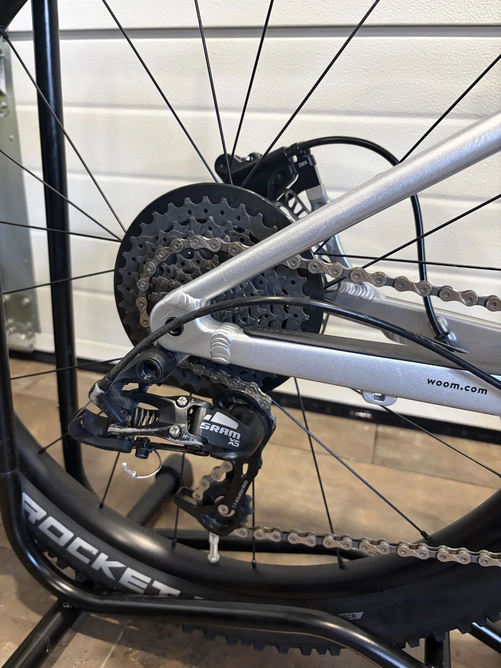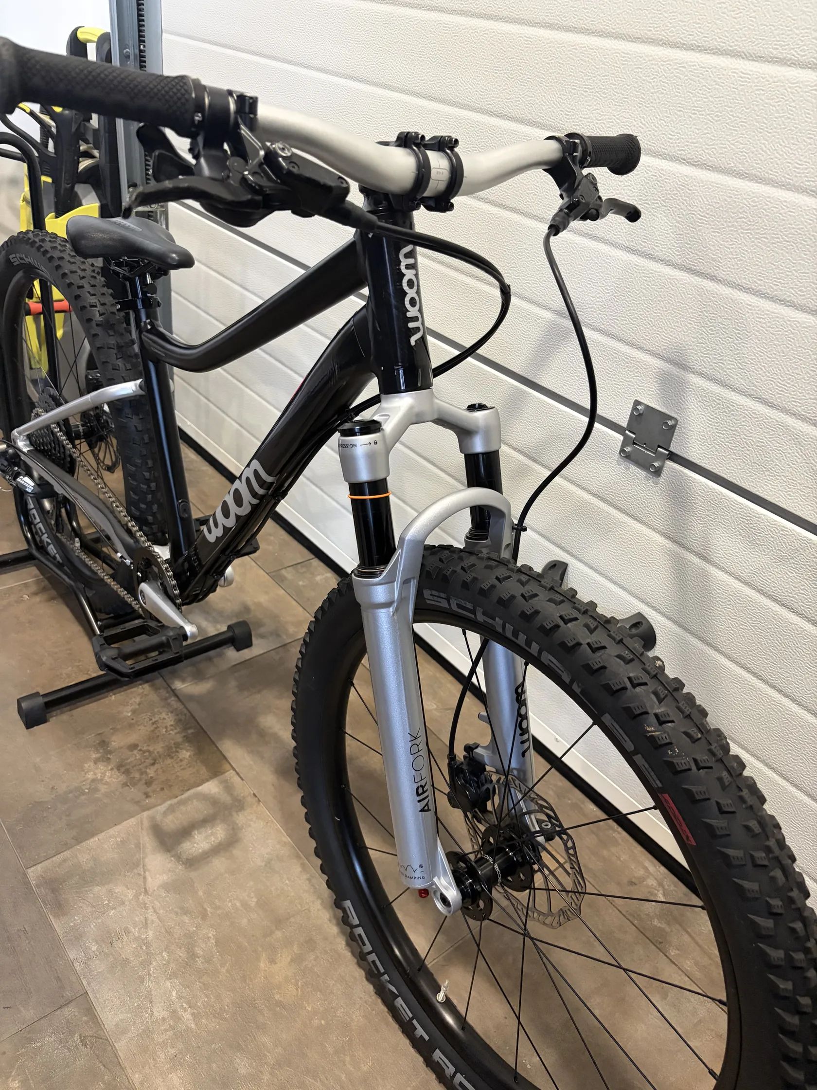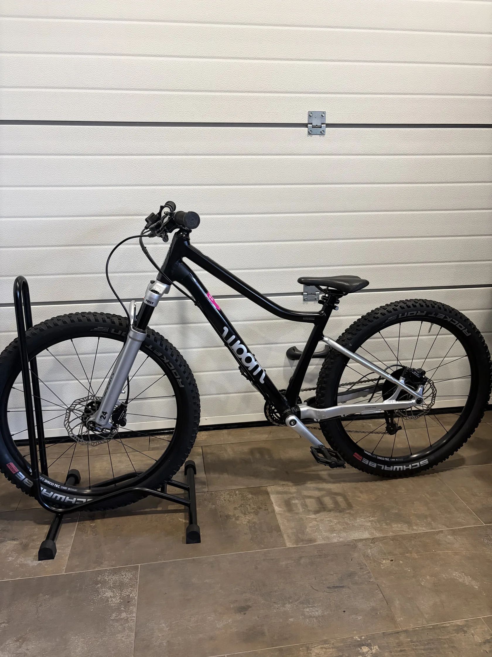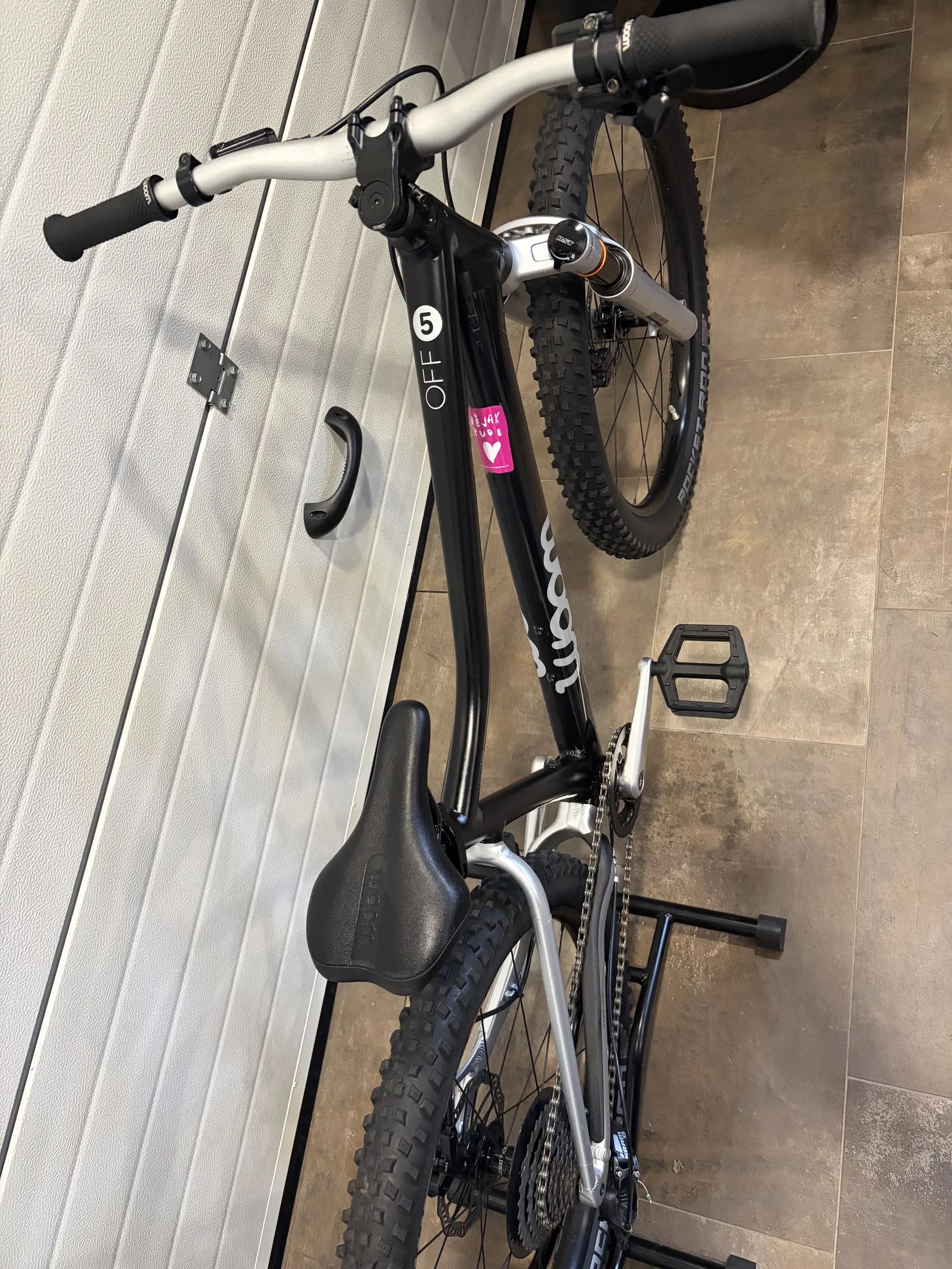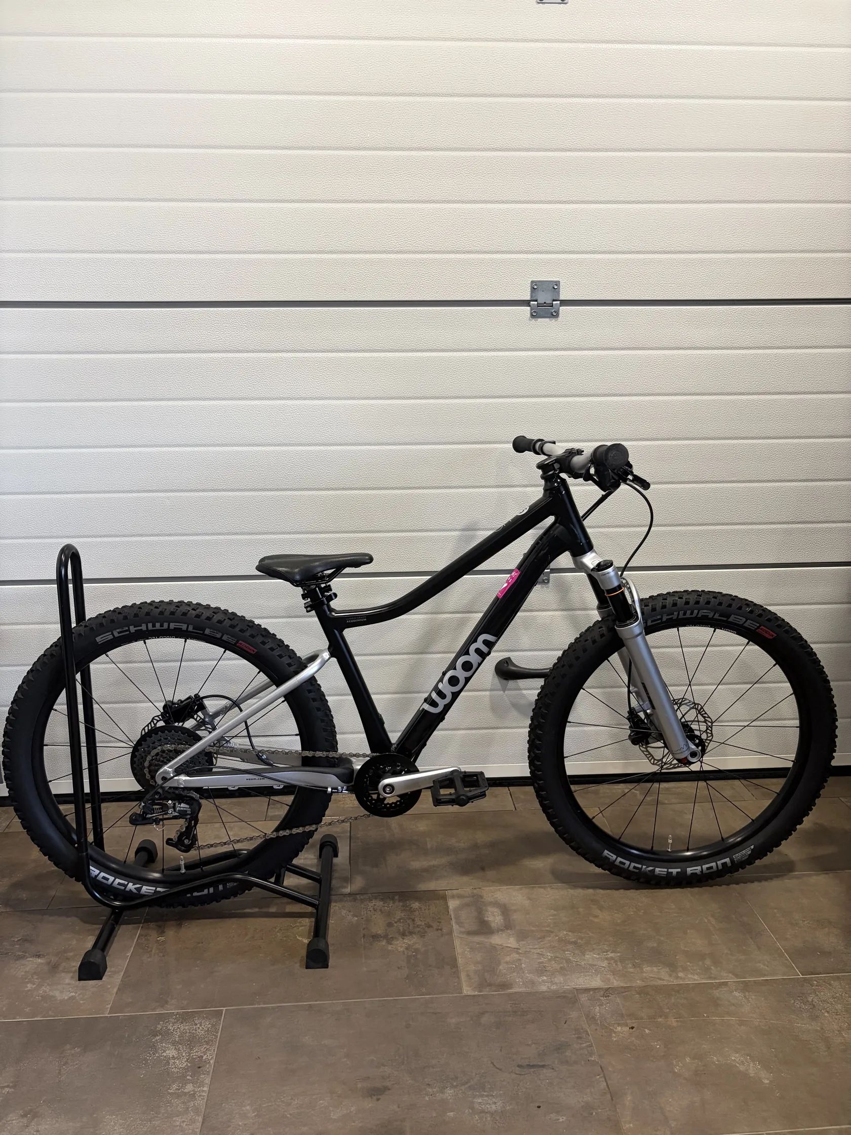 🔧 Specifikace: • Model: Woom 5 OFF AIR • Velikost kol: 24” • Doporučená výška dítěte: cca 125–145 cm • Rám: lehký hliníkový rám AA-6061 • Vidlice: vzduchová RST Aerial, nastavitelná dle hmotnosti dítěte • Převody: 1×9 • Řazení: microSHIFT • Kazeta: 11–36 zubů • Brzdy: hydraulické kotoučové brzdy (výborný brzdný účinek i pro menší ruce) • Pláště: Schwalbe Rocket Ron 24 × 2.25 • Hmotnost: cca 9 kg