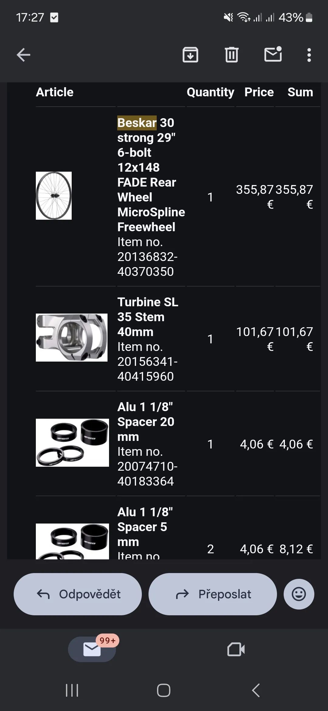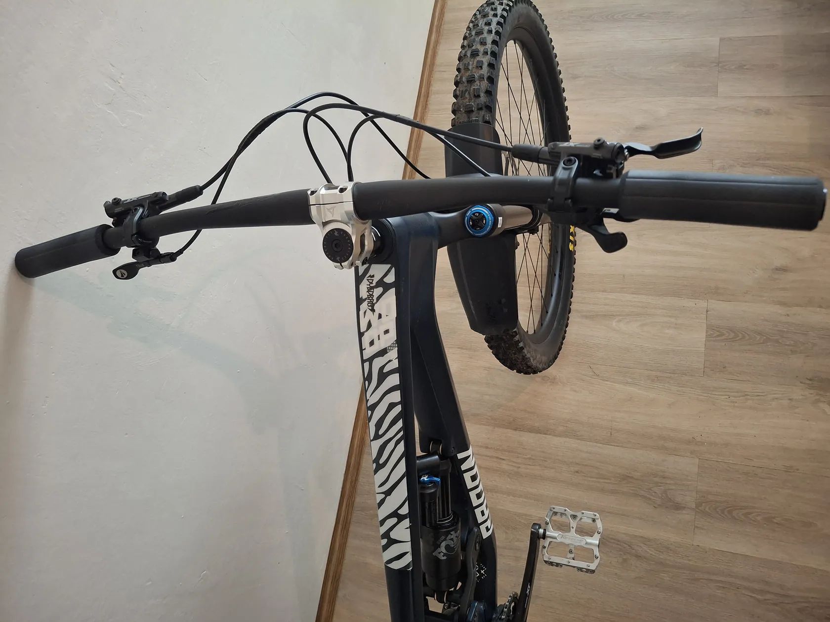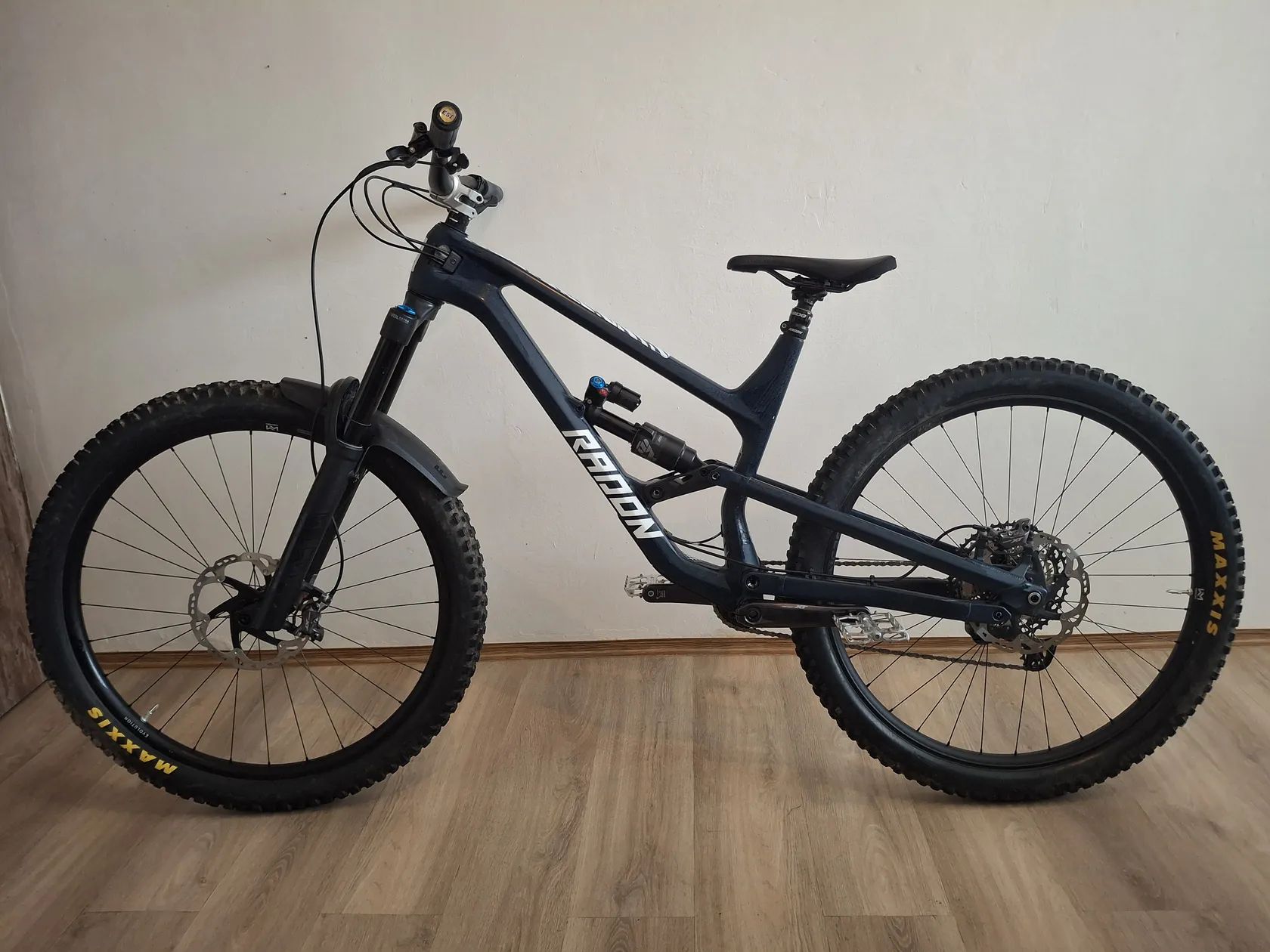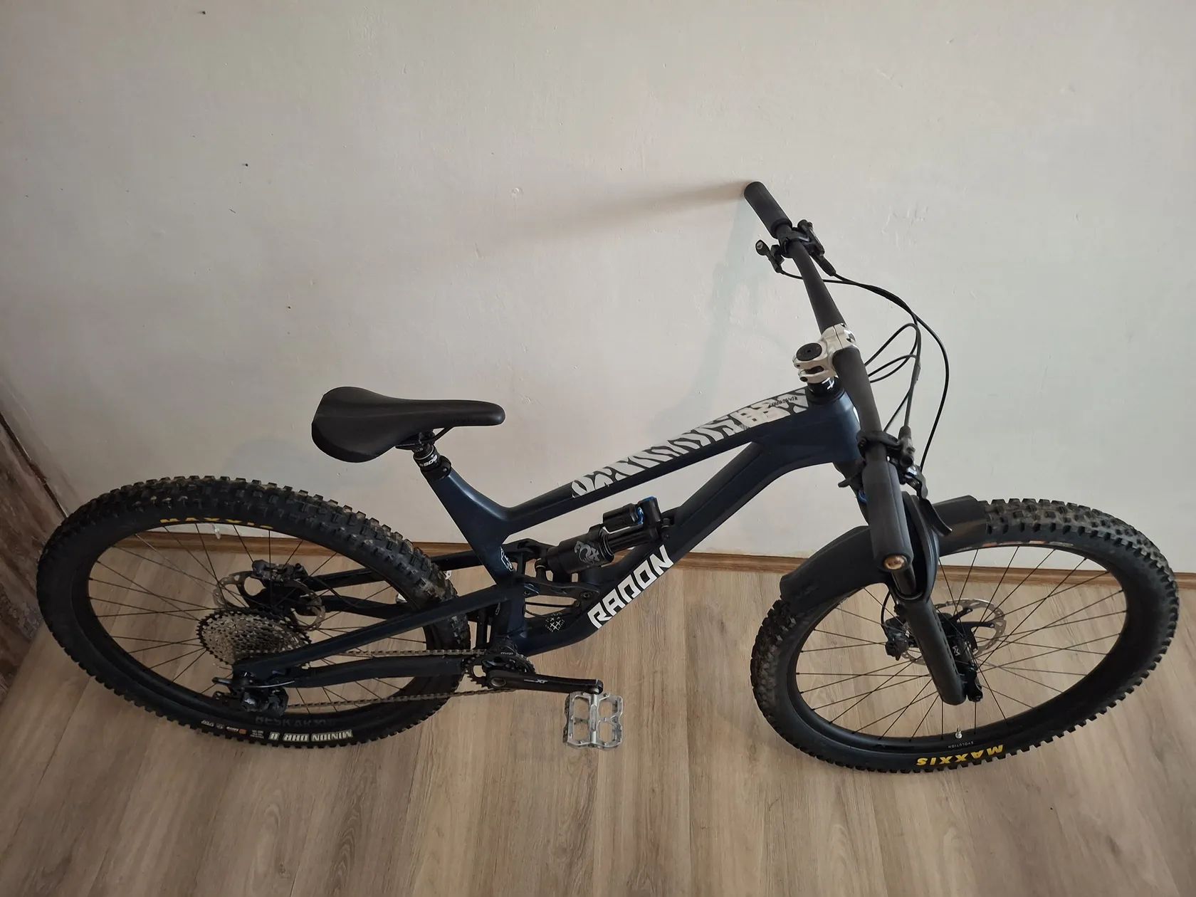 Prodám německého Radona Swoop 10.0 model 2024 velikost L, ve které se momentálně už nedá koupit. Přední rám je karbon a zadní stavba hliník. Zdvihy 170/170 mm. Na rámu je nálepka Dyedbro zebra na horní i dolní rámovce. Kolo je kupované letos na konci dubna za 2600€. Byl jsem na něm celkem 9x v bikeparku. Oproti základu jsem na něj kupoval zadní kolo NEWMEN Beskar 30 Strong za 350€, delší 200 mm teleskopickou sedlovku, představec RF Turbine, bezdušové pláště 2,6" Maxxis DHR a DHF, do zadního kola insert Vittoria Enduro, pedály Reverse, gripy ESI Chunky, originál FOX blatník. Ke kolu dám navíc náhradní patku přehazovačky. Výbava v základu je Shimano XT brzdy + hazka + kliky + střed, SLX kazeta + páčka. Vidlice FOX 38 Performance ELITE GRIP 2 170mm, tlumič FOX Float X2 Performance, přední výplet NEWMEN Evolution SL.A 30, náboje FADE, sedlo DSG BelAir, řidítka RF. Na ten zdvih je celkem lehké. Misky hlávka se dají otočit a upravit tím úhel hlavy 65-63,5°. Má nějaké oděrky od kamínků na rámu a škrábanec na spodní noze vidlice viz foto. Bude chtít akorát seřídit přehazku, nové brzdové destičky, servis vidle ani tlumiče jsem zatím nedělal. Prodávám kvůli přechodu na 27,5". Se vším, jak je, mě vyšlo na cca 80 tis. Po dohodě můžu i poslat v krabici od jiného kola.
