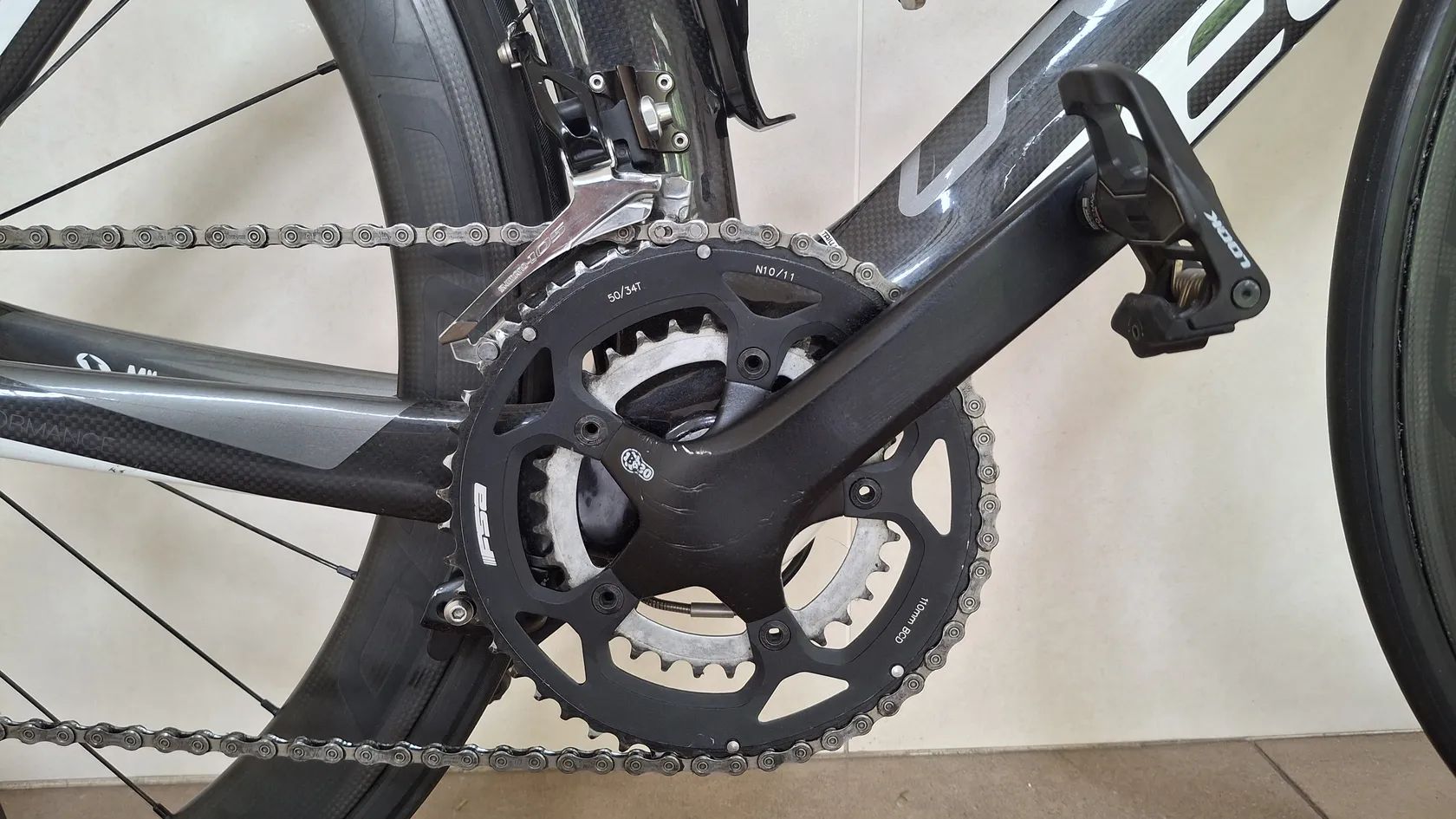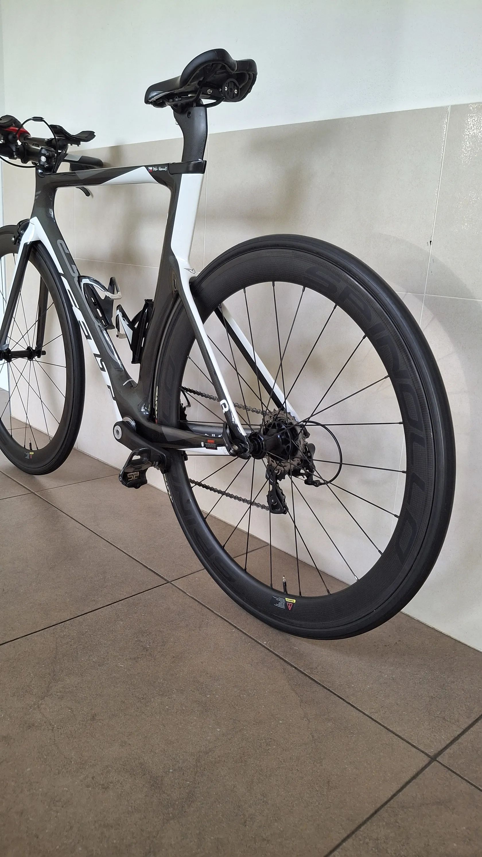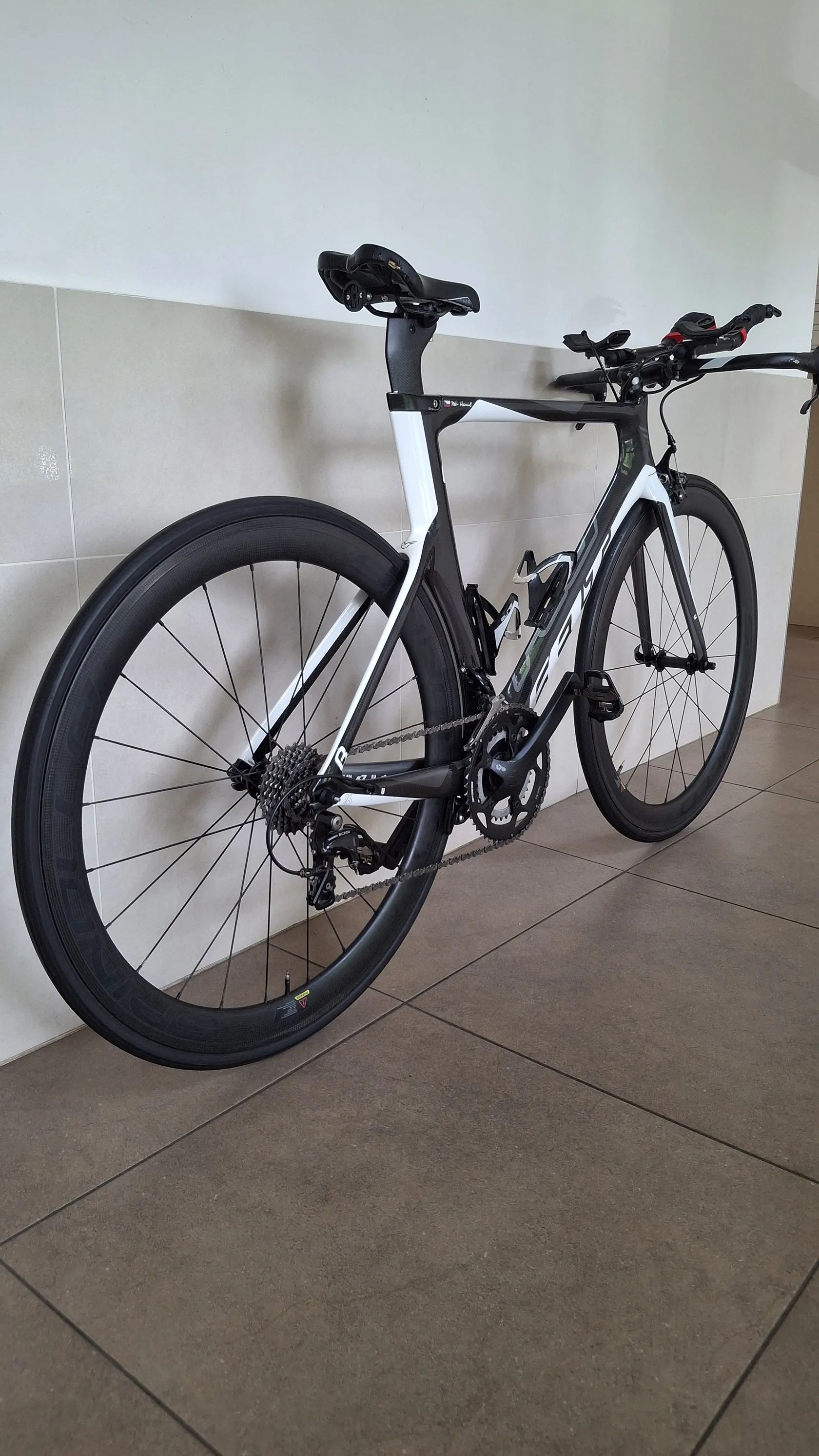 Výbava: * Galusková karbonová kola Spinollo, ráfek 50mm * Řazení microShift TT Shimano 105, 11s, 11-28 * Kliky FSA 170cm, převodníky 50/34, Pedály Look Keo * Představce Devox Tri * Držák na Garmin na představci a pod sedlem na Varia radar * Celková hmotnost celého kola 8,8Kg