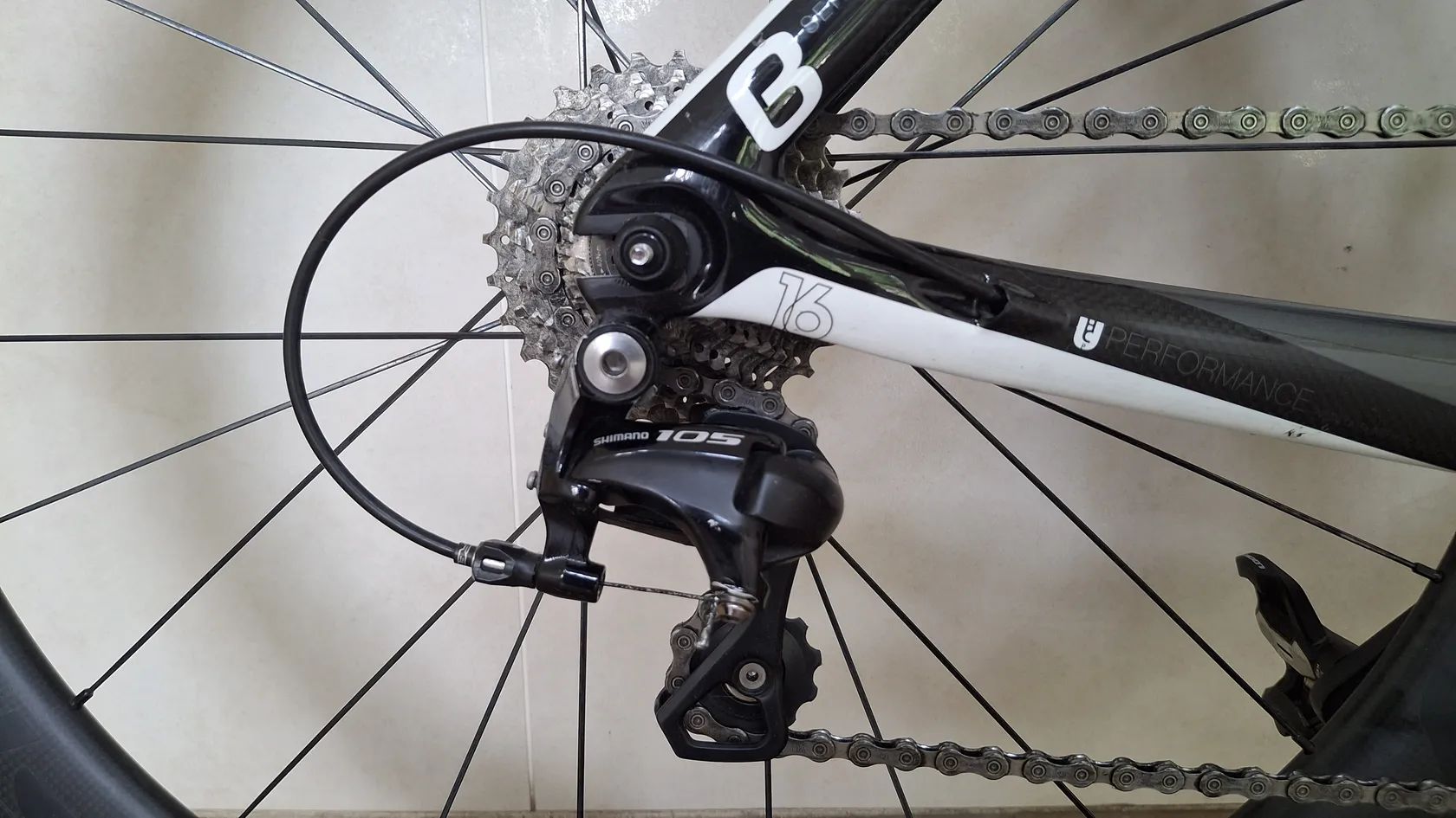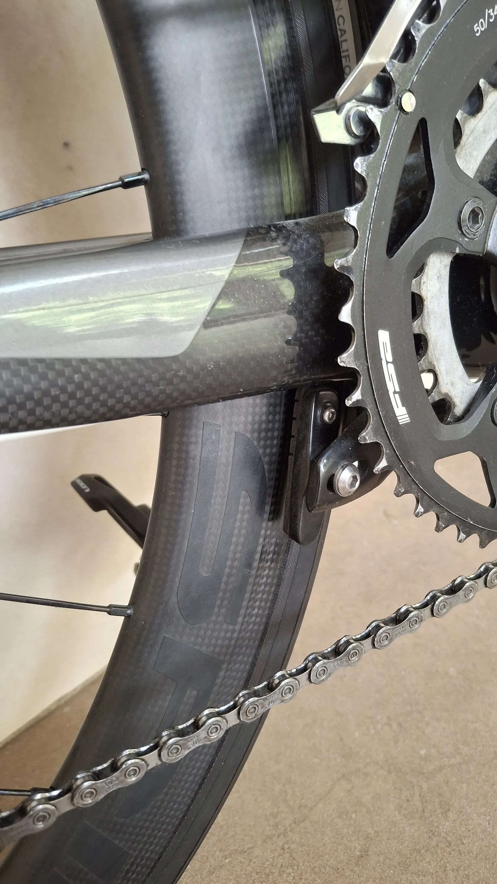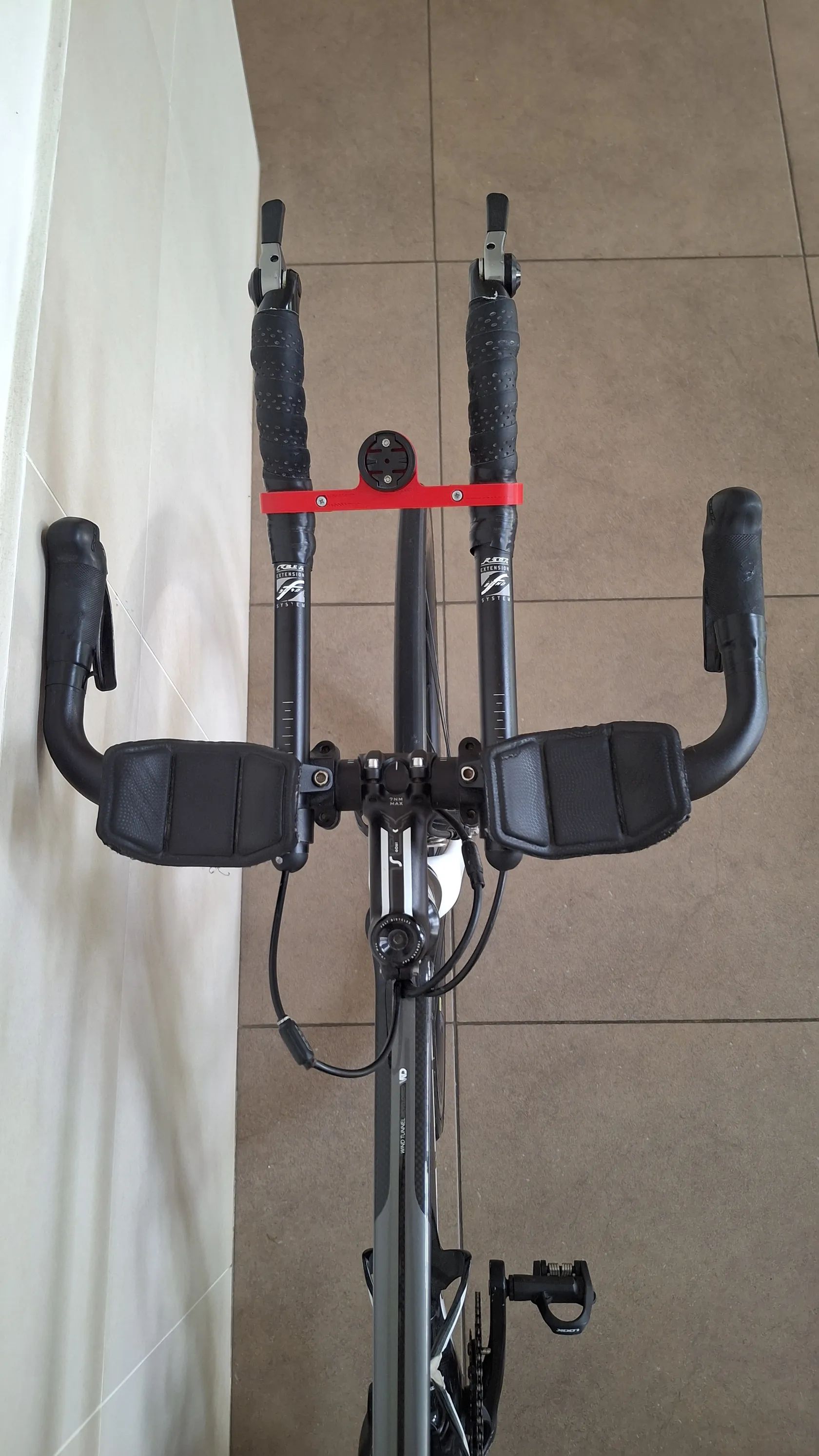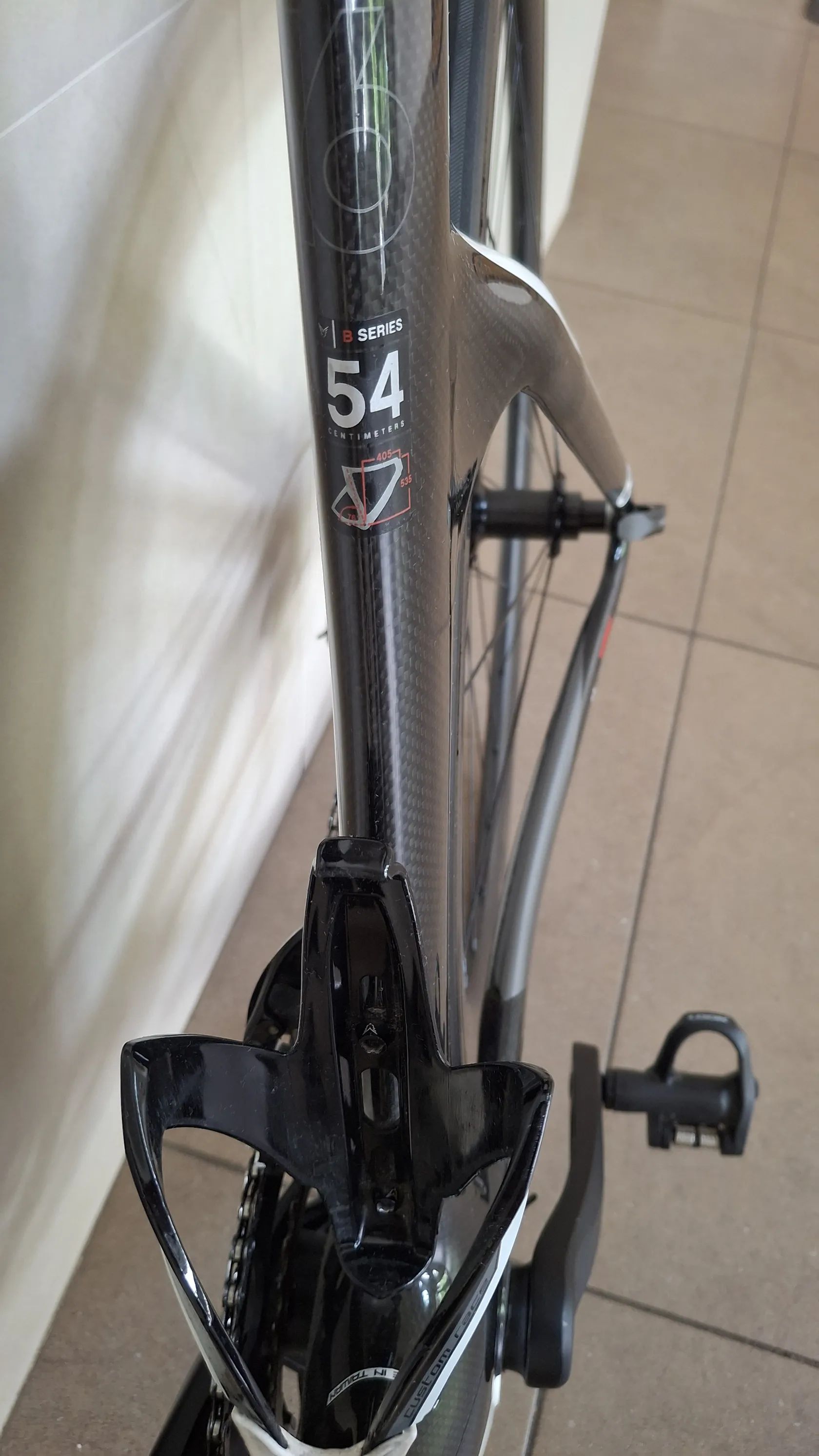 Výbava: * Galusková karbonová kola Spinollo, ráfek 50mm * Řazení microShift TT Shimano 105, 11s, 11-28 * Kliky FSA 170cm, převodníky 50/34, Pedály Look Keo * Představce Devox Tri * Držák na Garmin na představci a pod sedlem na Varia radar * Celková hmotnost celého kola 8,8Kg