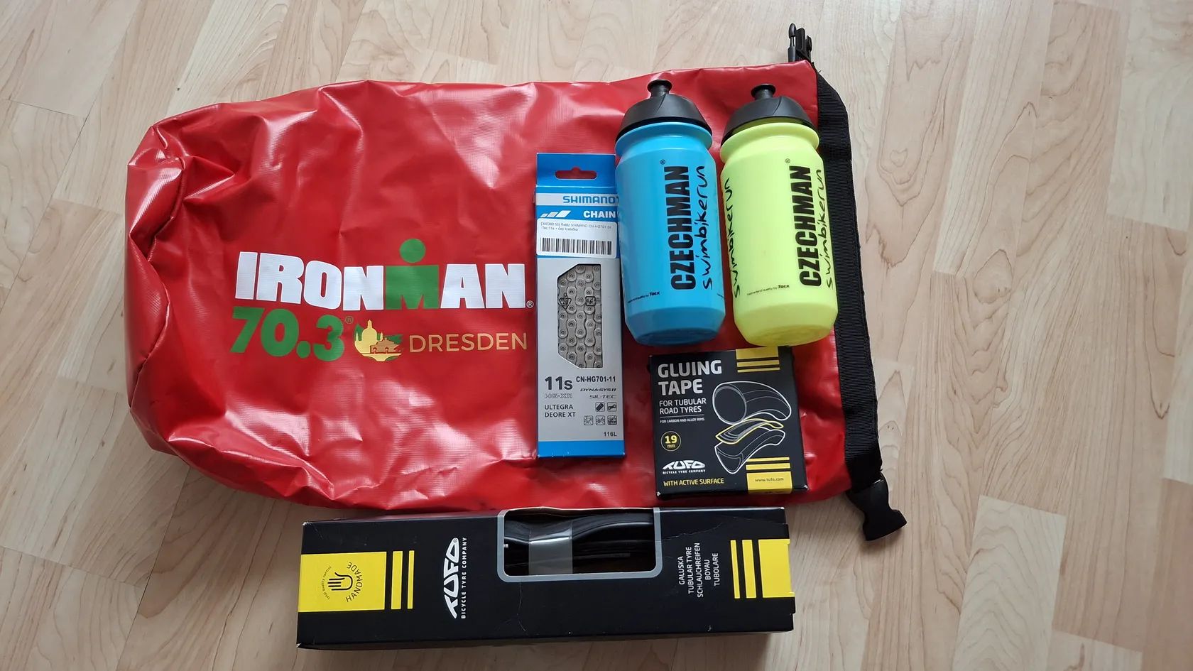 Jako dárek přidám nový řetěz, galusku Tufo Hi Composite carbon 25mm, lepcí pásku do ráfku, dva bidony Czechman a TRI batoh Ironman vše viz foto.