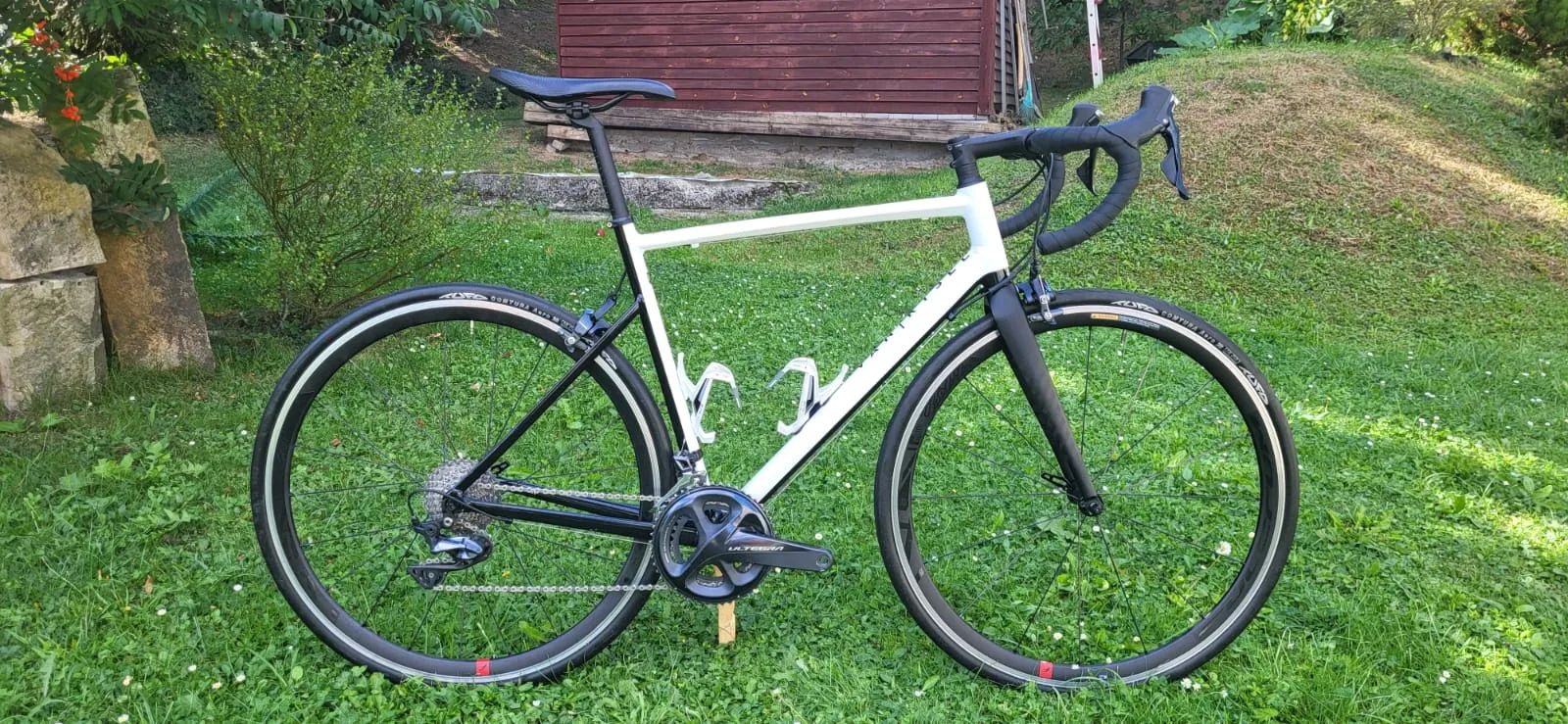 Velikost 56 / L. Rám hliníkový. Komplet na mechanické Shimano Ultegra. Na kole se jezdilo od roku 2020 do 2024 (podzim). Koupil jsem si nové a tohle prodávám až teď. Pravidelně a pečlivě jsem se o kolo staral (čištění, výměna a servis komponentů). Zánovní lanka, bovdeny, pláště, na kterých se jezdilo 6 měsíců. Nové ložiska v nábojích. Řetěz je OK. Pláště TUFO 28mm (jezdilo se na nich 6 měsíců). Na fotce lze vidět dvě poškozená místa laku na rámu, když mi roztržený řetěz urval převodník (nahrazeno novým Ultegra převodníkem). Prodávám bez pedálů. Prodávám s košíky.