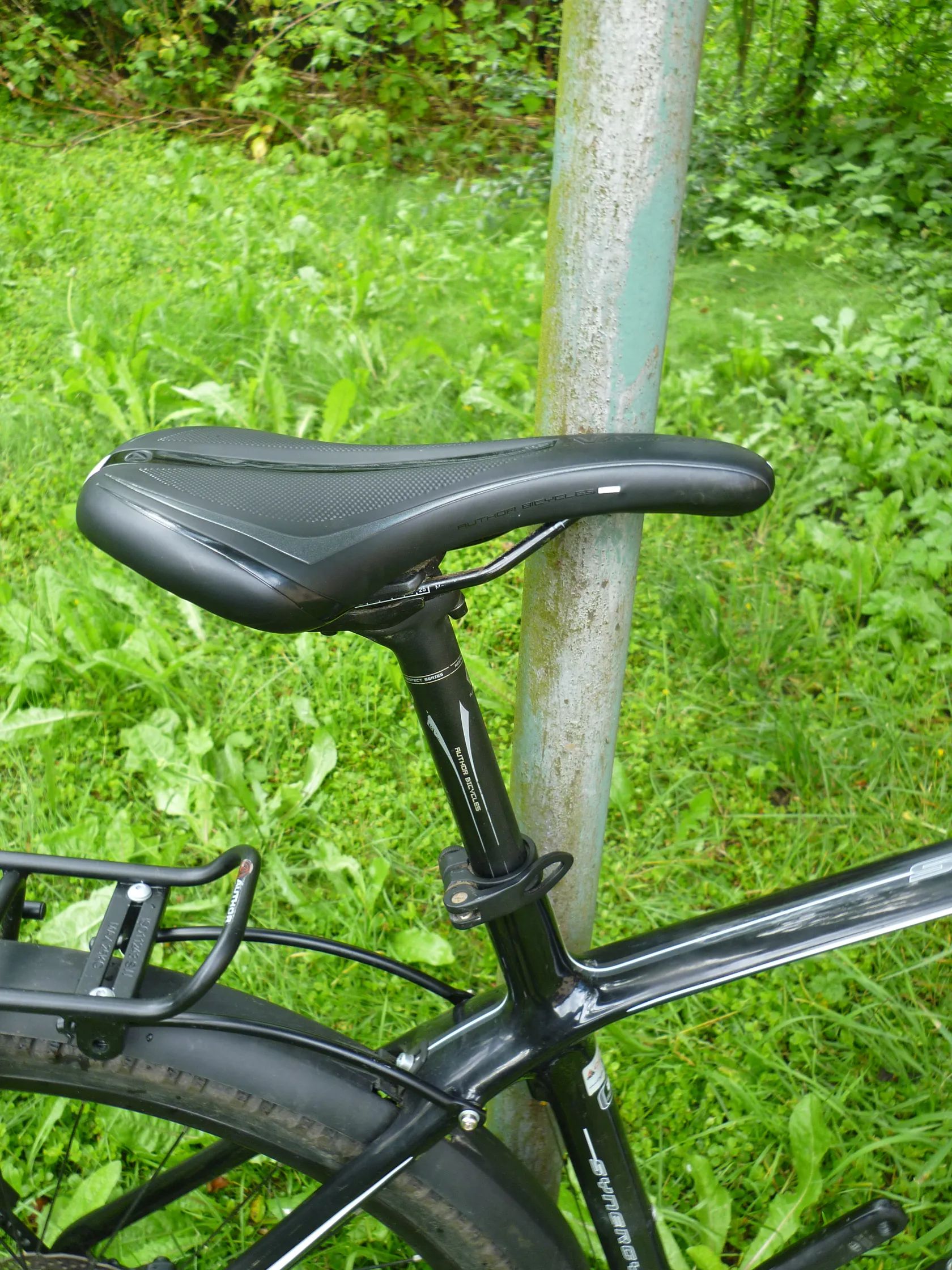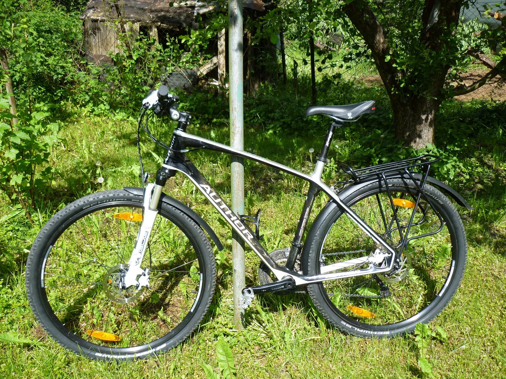 Prodám krosové karbonové kolo Author Synergy, velikost 20´´, na postavu 170-185 cm. Kola 28-29´´, vzduchová odpružená vidlice RST Vogue, přehazovačka Shimano XT, převodník Shimano Deore, brzdy kotoučové hydraulické Tektro Gemini, pláště zcela nové Schwalbe Smart Sam 1,75´´ (47 mm) - lze nasadit i širší (samozřejmě i užší), navíc blatníky a nosič. Barva černá s bílou. Na kole jsou nyní řídítka- vlaštovky; v případě zájmu mohu vyměnit za původní rovná 680 mm. Nejsou na něm pedály, mohu nabídnout zcela nové SPD nášlapné. Kolo má velmi málo najeto, rám je bez oděrek, pouze jedna malá - asi velikosti 1 Kč mince - je na zadní stavbě. Pravidelný servis. Kolo je vhodné na vyjížďky v terénu i po cyklostezce, na kondiční trénink i amatérské závody, ale i např. na dojíždění do práce. Je velmi pohodlné, tlumivé a lehké. PC 47900 Kč.