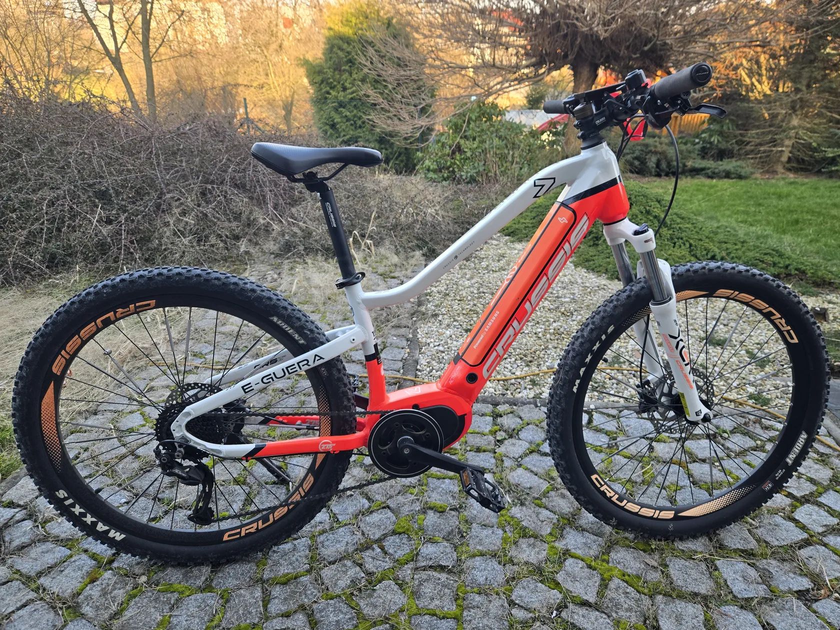 Prodám dámské horské 27,5“ kolo Crusis e-Guera 7.7 ve velikosti S 15'. modelový rok 2022 s nájezdem jen 1271 km. Kolo má oproti původním komponentům vzduchovou vidlici Sr Santour. Ve srovnání s pružinovou vidlicí výrazně zvyšuje komfort jízdy. motor: Bafang M400, 80 Nm baterie: 620 Wh (dojezd dle terénu a stupni přípomoci až 100 km) přehazovačka: Shimano Alivio řazení: Shimano brzdy: hydraulické kotoučové Shimano Příslušensrvi: kovový stojánek, držák na láhev. Vše 100% funkční a připravené k používání. Par oděrek na rámu z převozu na cyklonosici. Baterie 100%. V případě zájmu pište nebo volejte, ráda zodpovím jakékoli dotazy. Pouze osobni vyzvednuti Petřvald u Karvine.