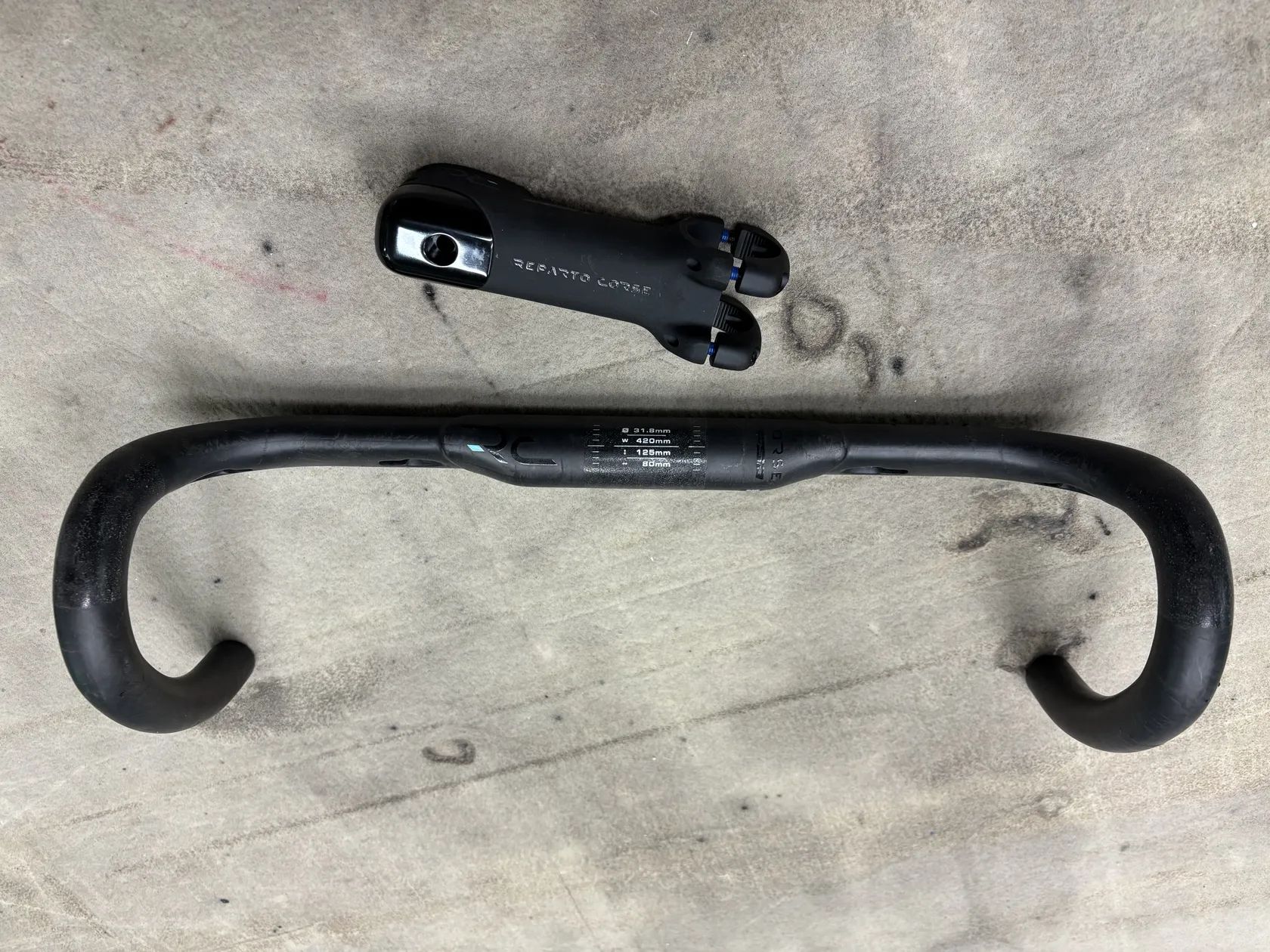 Řidítka a představec pro vnitřní vedení sundané z nového kola Bianchi Specialissima. Řidítka šířky 42cm, představec délky 10cm.