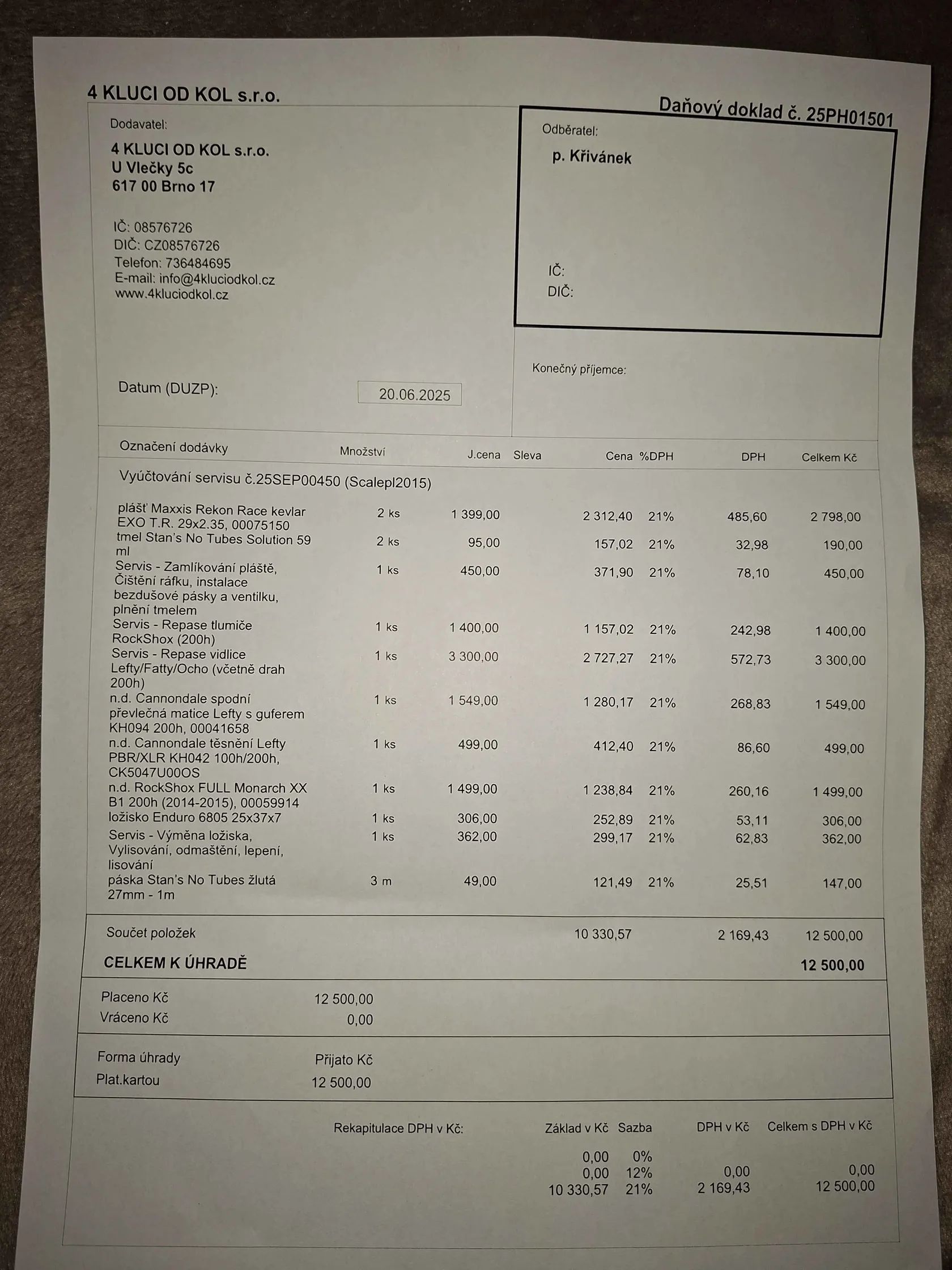Prodám horské kolo Cannondale Scalpel vel. S. Brzdzy Shimano xt. Přehazovačka Sram XX1. 20.6.2025 byly dělány repase tlumiče i vidlice, nová převlečná matice Lefty s guferem, nové ložisko a nové pláště Maxxis Rekon Race kevlar. Cena servisu 12 500 kč. Přikládám také kopii faktury. Po servise najeto maximálně 100 km.