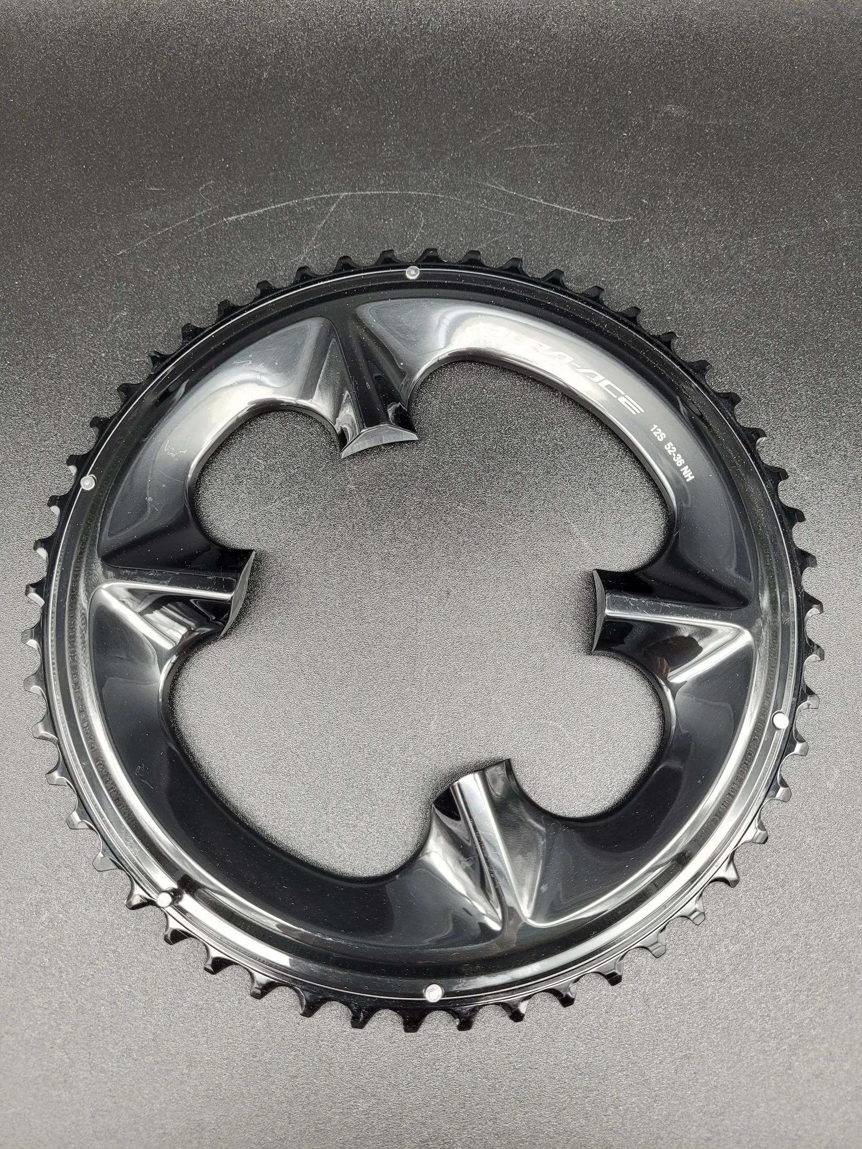 Prodám nové převodníky pro 12s Shimano DuraAce, velký 52, malý 36. Převodníky jsou sundané z nového kola, nikdy nejeté. Nicméně mají od manipulace/skladování kosmetické vady, běžným pohledem bez detailního zkoumání není vidět, viz foto.