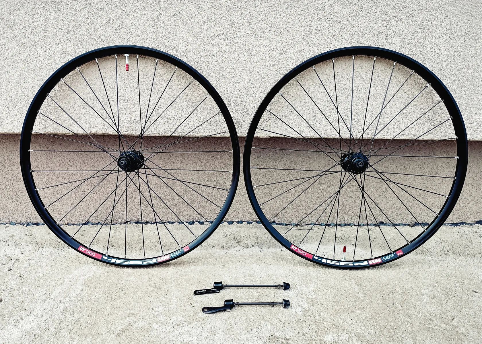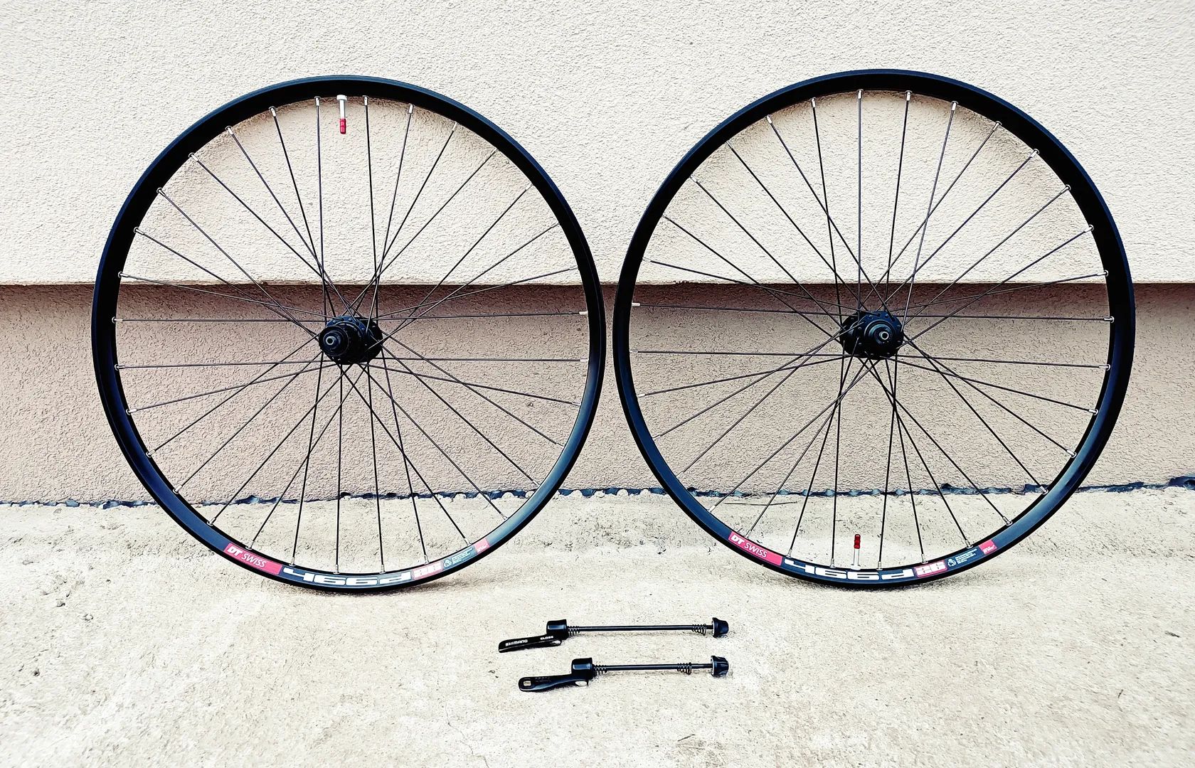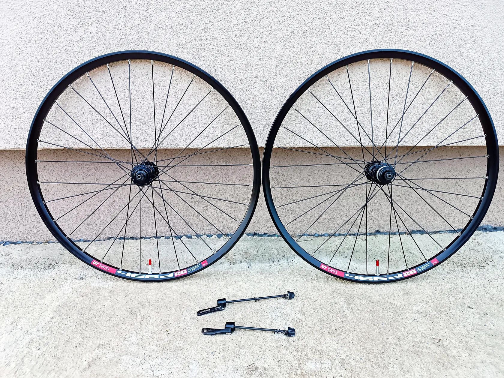 Prodám v krásném technickém ale i vizuálním stavu komplet zapletená 26" kola. Náboje Shimano Slx. Ráfky DT SWISS 446D. Ořech 8-11 Speed kazata. Jsou bezdušové, bezdušové veltilky v ceně. 9 mm rychloupínáky. Můžu poslat poštou.