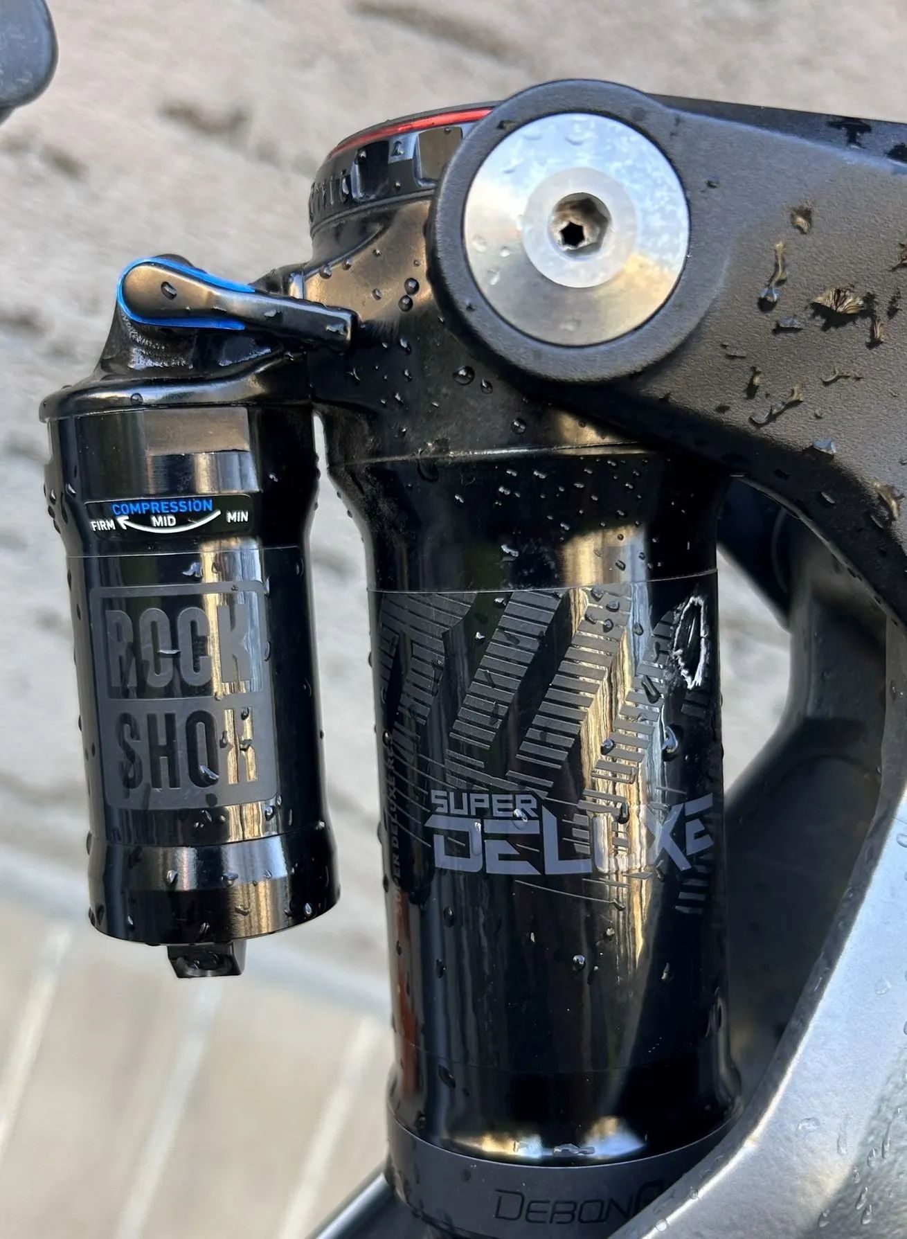 Odpružení RockShox Lyrik RC 150 mm vpředu a RockShox Super Deluxe RC3 Debonair vzadu – sportovní / vyšší třída pro enduro použití.