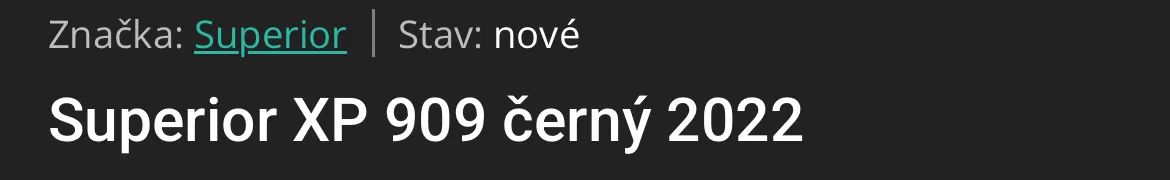 Superior XP 909 (2022) – černá – Koupeno 2024, v záruce Prodám sportovní horské kolo Superior XP 909 v elegantní matně černé barvě. Přestože jde o modelový rok 2022, kolo bylo zakoupeno jako nové v létě roku 2024. Je tedy v provozu pouze krátce, je ve vynikajícím stavu a stále v platné záruce. Jedná se o lehké a rychlé kolo na kvalitním hliníkovém rámu, které je díky své geometrii ideální na XC trasy, lesní cesty i delší výlety. Hlavní přednosti a výbava: • Rám: Alu X6 Ultralite – špičkový lehký hliník s vnitřním vedením kabeláže. • Vidlice: Vzduchová RockShox Judy Silver TK (zdvih 100 mm) s uzamykáním z řídítek – funguje hladce, nastavitelná na váhu jezdce. • Pohon: Shimano 1x12 (přehazovačka SLX, řazení Deore) – moderní systém s velkým rozsahem pro těžké výjezdy i rychlé sjezdy. • Brzdy: Hydraulické kotoučové Shimano MT410 – spolehlivý brzdný účinek. • Kola: 29" ráfky Stars J25D s plášti Schwalbe Rapid Rob. Stav kola: Kolo je velmi zachovalé, pravidelně čištěné a promazávané. Vše funguje precizně, řazení je přesné a brzdy ostré. Díky nákupu v roce 2024 je kolo prakticky zánovní, bez nutnosti jakýchkoliv investic. Kolo prodávám včetně dokladu o koupi pro případnou reklamaci. Cena: 19.900Kč (při rychlém a solidním jednání možná mensi dohoda) Lokalita: Osobní předání a vyzkoušení po domluvě. V případě zájmu mě kontaktujte skrze formulář níže nebo telefonicky.