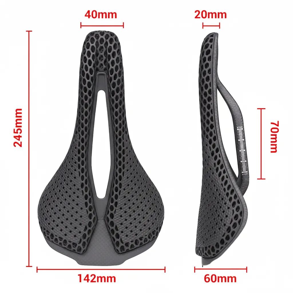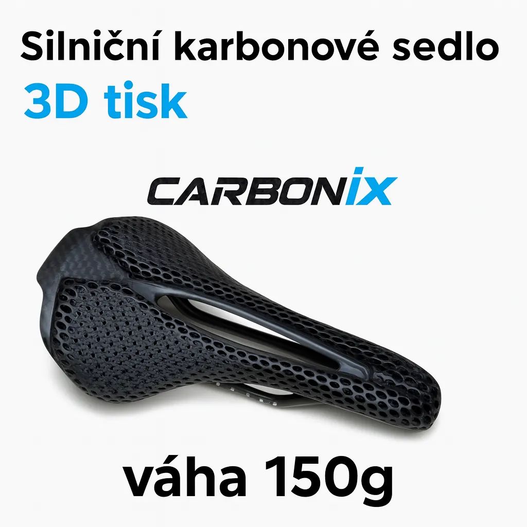 🚴 Carbonix Aero 1.0 – 3D tištěné Ultra lehké karbonové silniční sedlo s plástvovou konstrukcí pro maximální pohodlí a ventilaci. Krátký nos zabraňuje odírání stehen, široká zadní část zajišťuje stabilní přenos síly. Vyrobeno v ČR z karbonových vláken Toray T700+T800.
