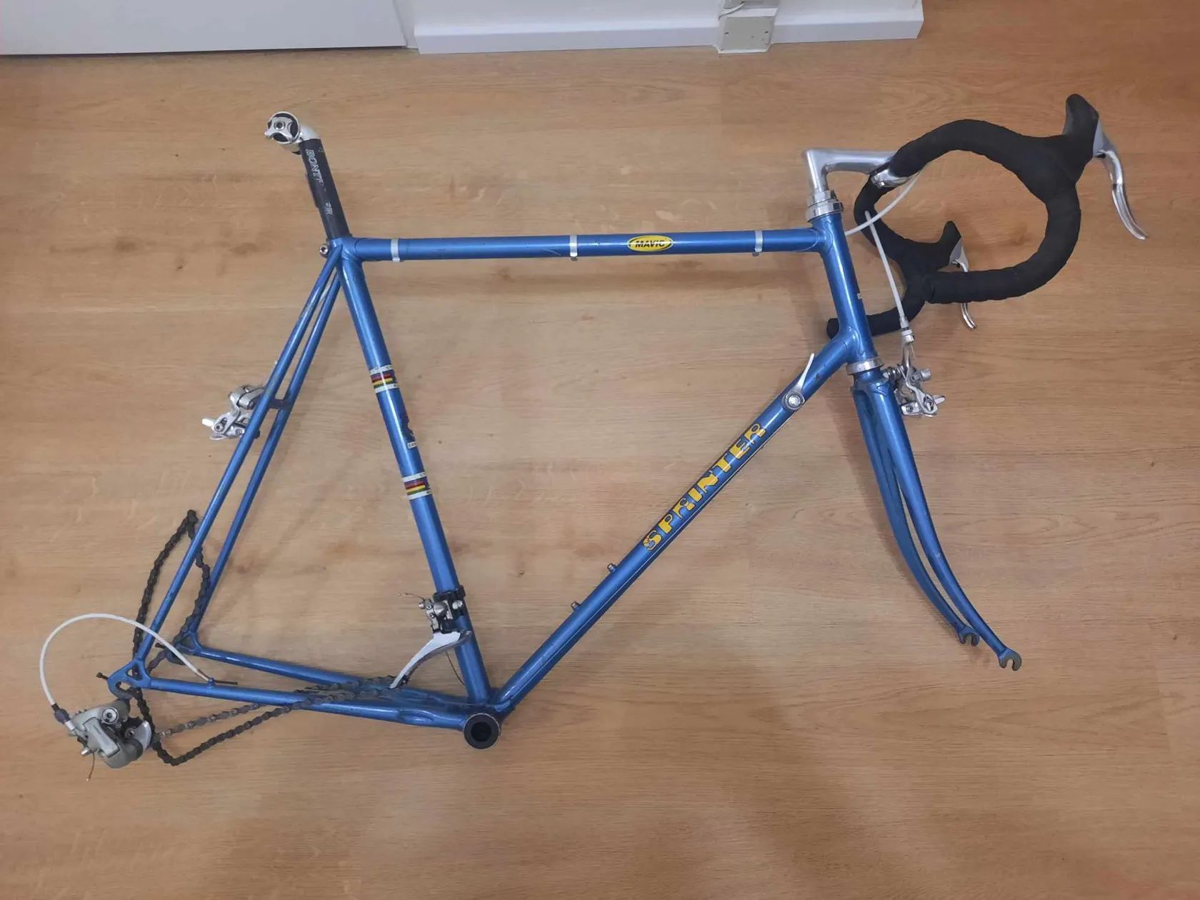 Ahoj, prodám silniční rám Sprinter. Tenkostěnná ocel, na poklepání jen zvoní a je lehoučký. Velikost 56cm. Osazeno tím, co je na obrázku.