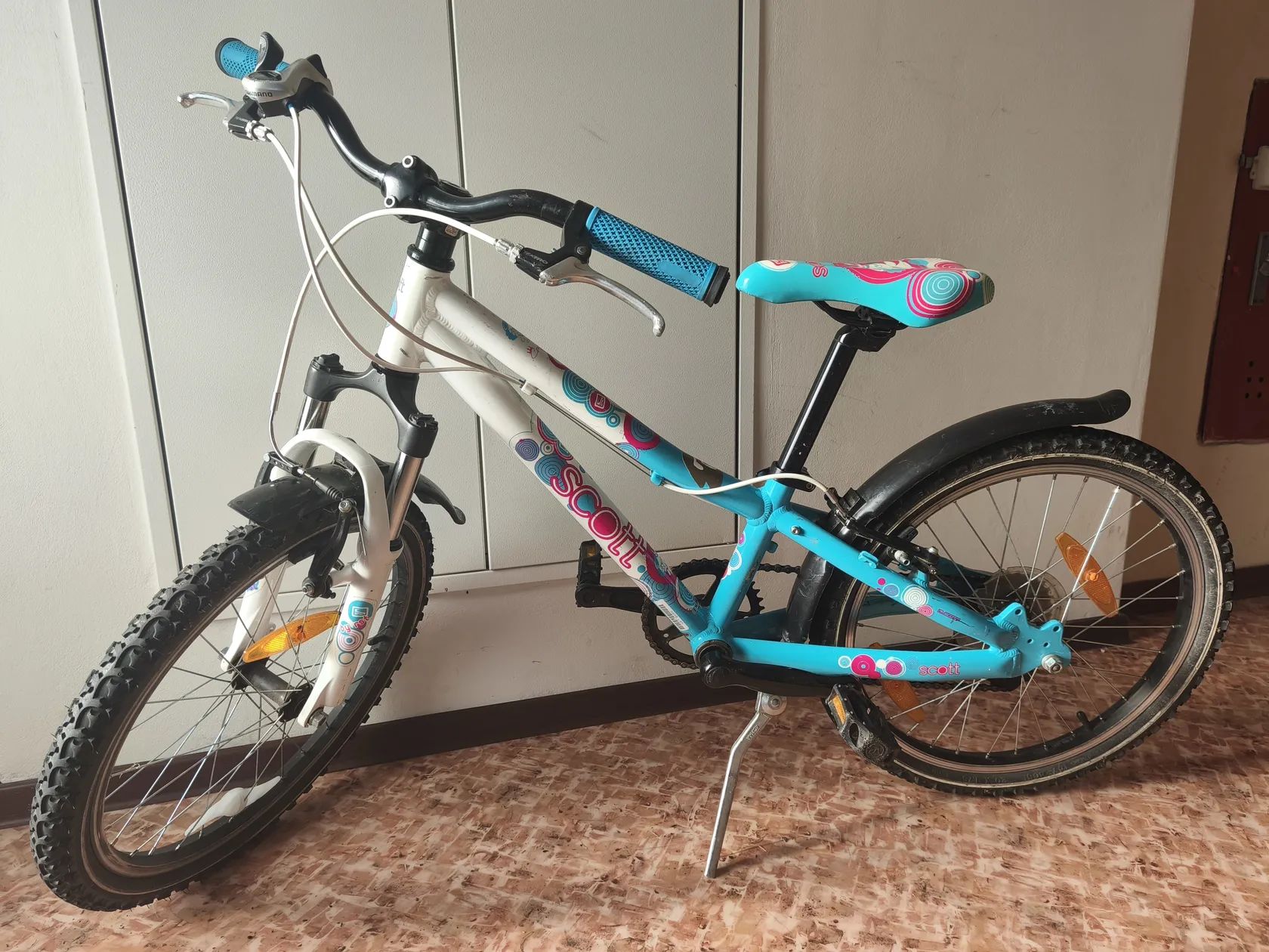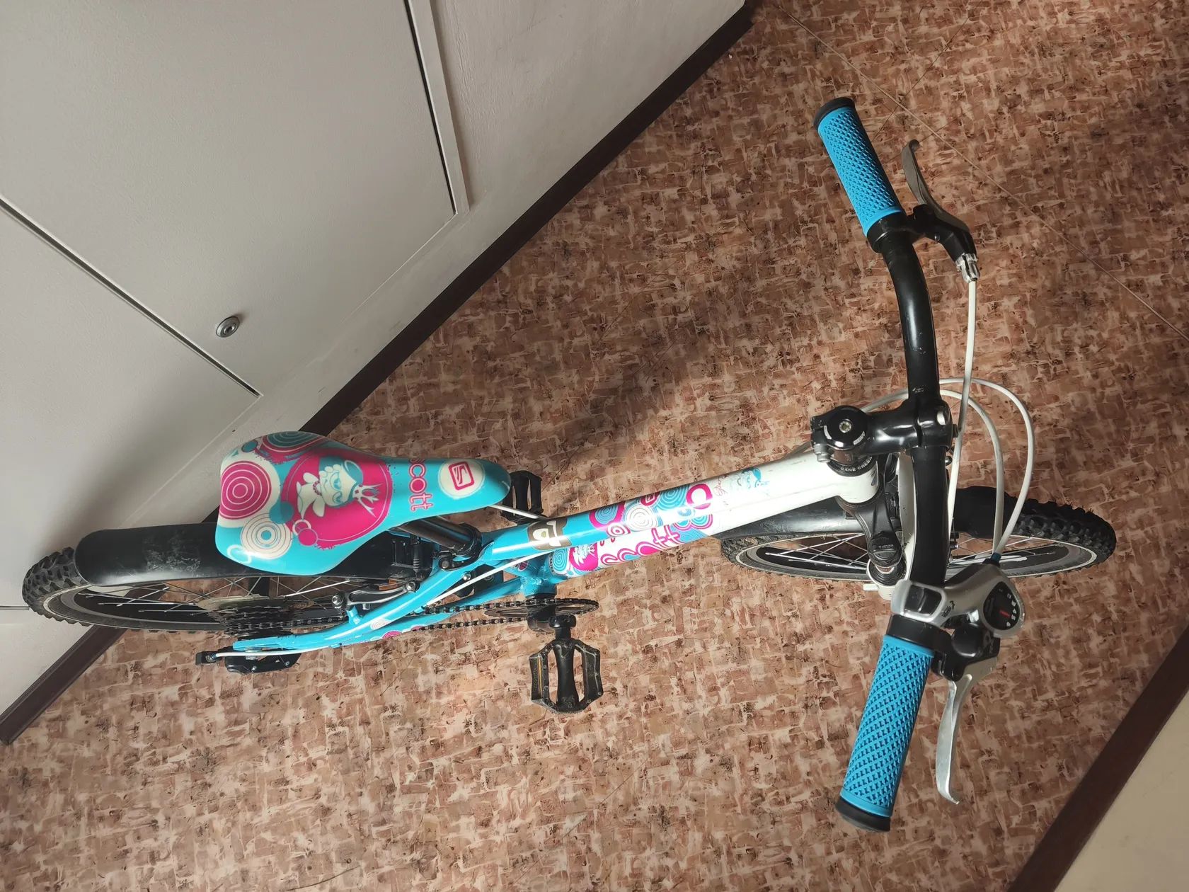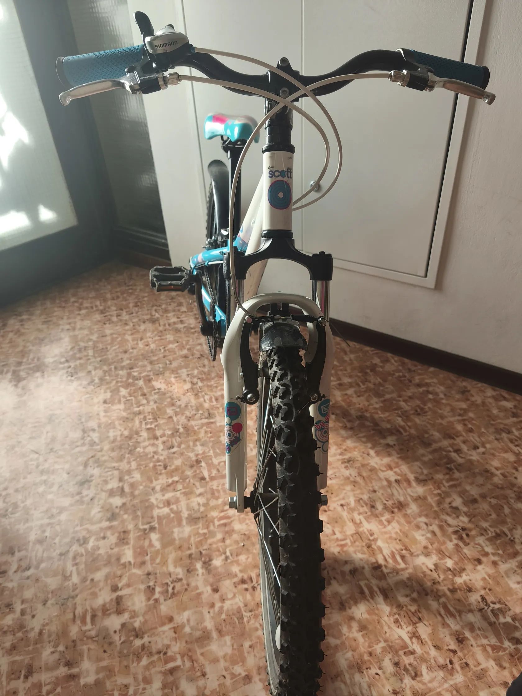 Dívčí kolo Scott Contessa. Nové páčky přehazovačky (místo původního quick-shiftu) pro slabší dívčí prsty. Mechanicky ve výborném stavu, drobné oděrky.