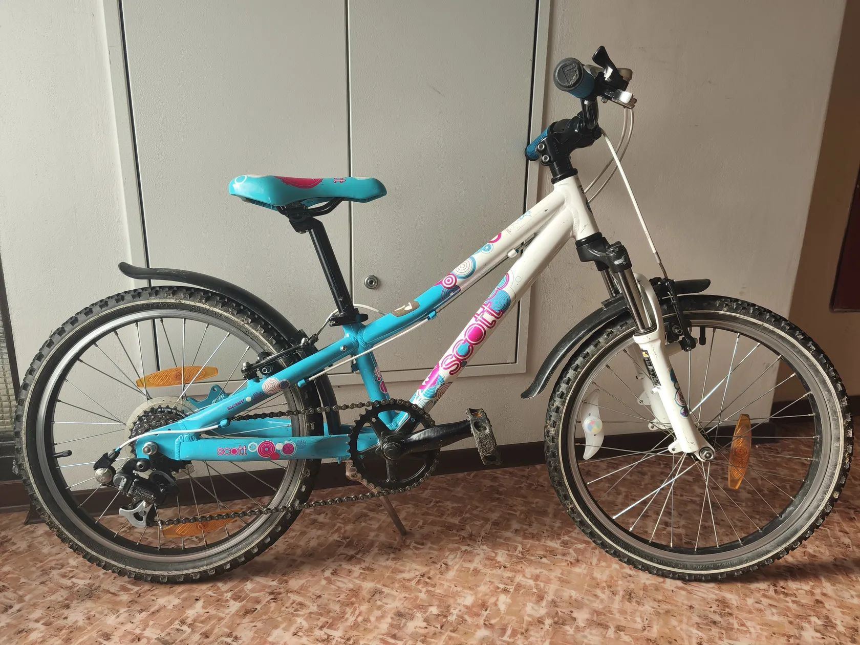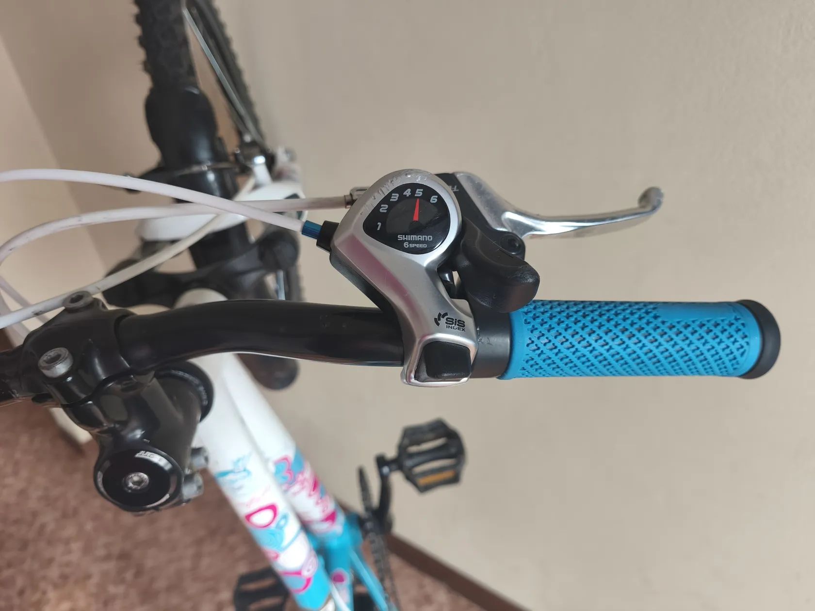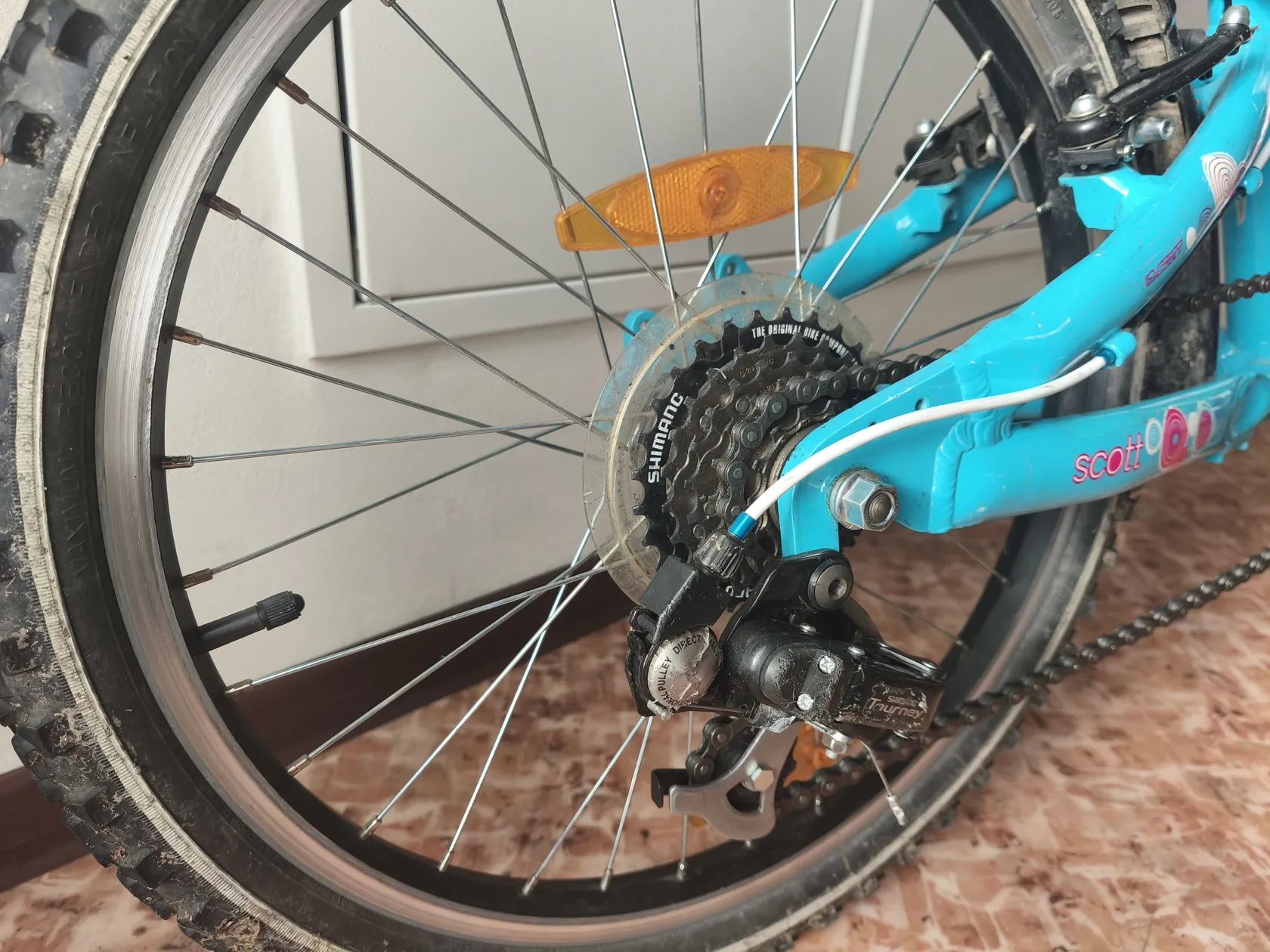 Dívčí kolo Scott Contessa. Nové páčky přehazovačky (místo původního quick-shiftu) pro slabší dívčí prsty. Mechanicky ve výborném stavu, drobné oděrky.