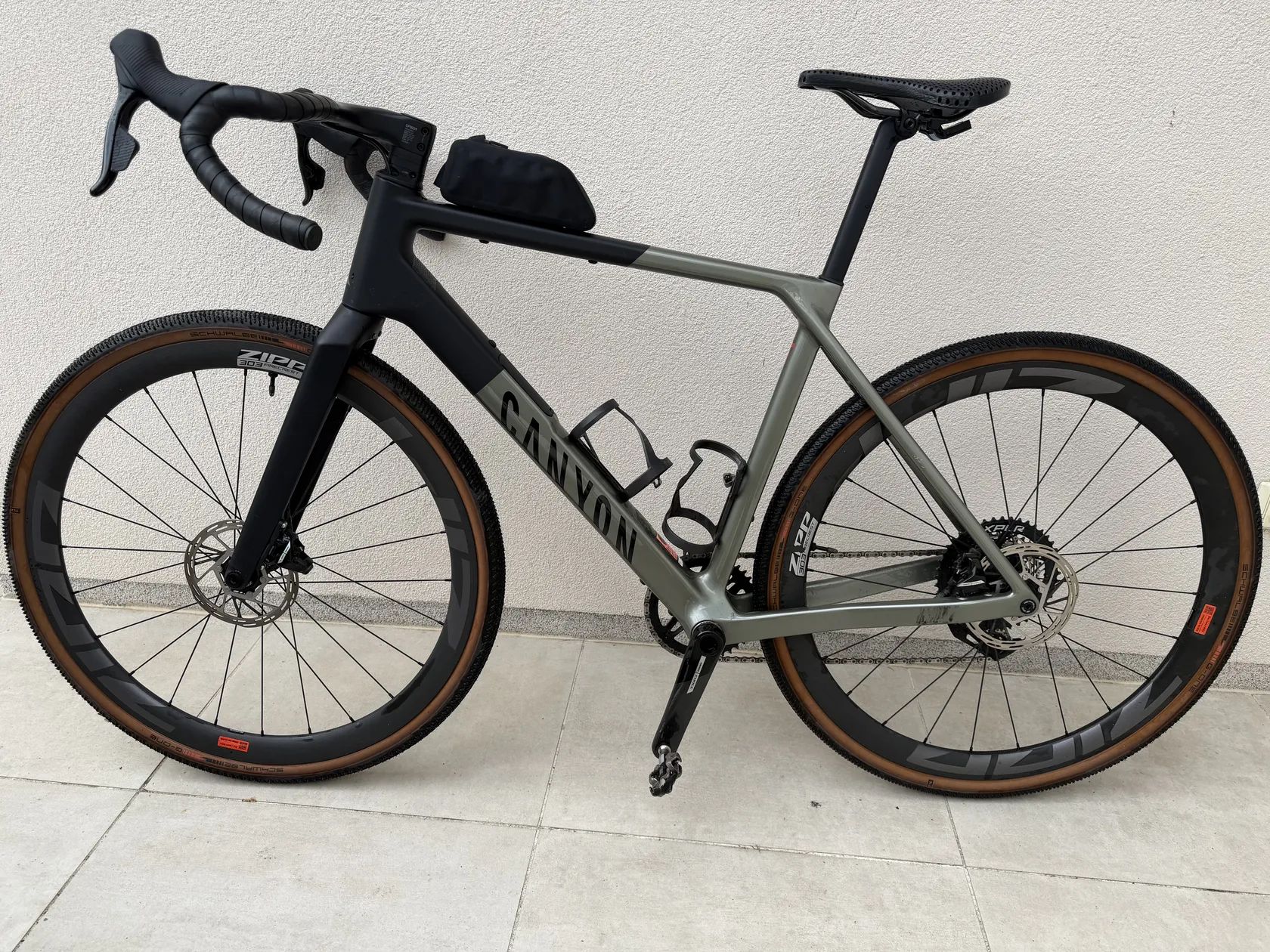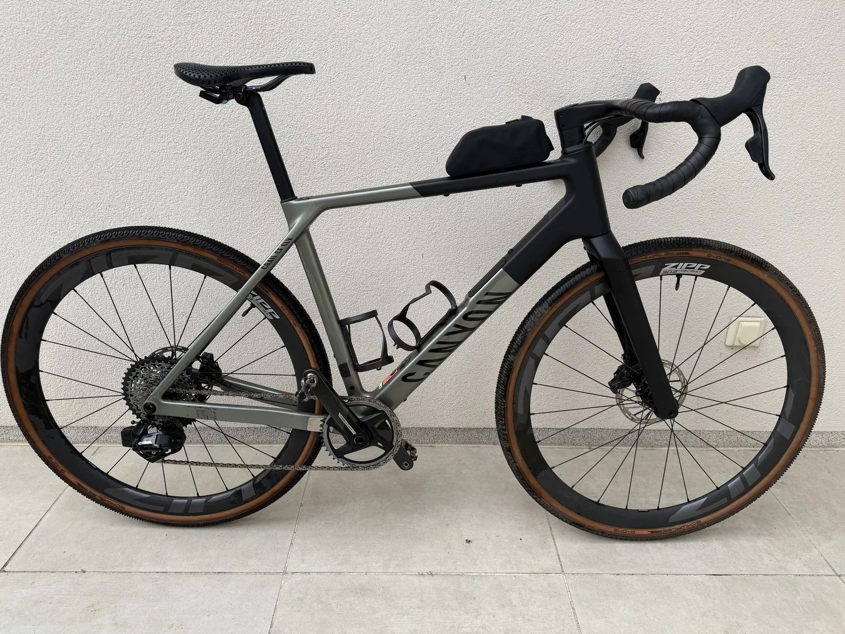 rám Canyon Grail CF SLX, vidlice Canyon FK0117 CF Disc, bezdrátové řazení SRAM Force XPLR AXS 12 speed, kazeta SRAM Force XPLR XG-1271 10-44, brzdové páky a brzdy SRAM Force AXS HRD D2, kola Zipp 303 Firecrest Hookless, pláště Schwalbe G-One R 40 mm 40 mm, kokpit Canyon Cockpit CP0039, sedlo Fizik Vento Argo X3 (na obr. první zprava, případně kterékoliv z těch čtyř) sedlovka Canyon SP0072. Hmotnost výrobce je 8,14 kg pro velikost M pedály Shimano PD-M9100 Canyon GEAR GROOVE Computer Mount Canyon LOAD FidLock QuickLoader Canyon Top Tube Bag