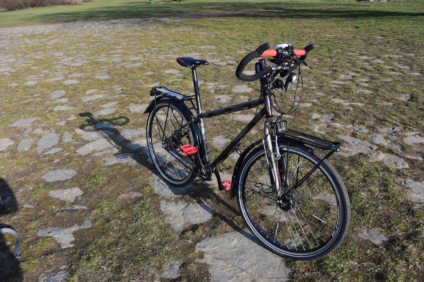 Nabízím expediční kolo s minimem údržby, s řemenovým pohonem , s dynamem v předním náboji, s excentrem v ose pedálů, dělenou pravou zadní patkou, osvětlení svítí i po zastaveni kola-kondenzátory, s převodovkou v zadním náboji a páčkovém 8 rychlostním řazení, kola jsou obuta do plášťů Schwalbe Maraton Plus s nejvyšší ochranou proti průrazu, kolo je minimálně použité. Ke kolu jsou v ceně veškeré brašny- 6ks.