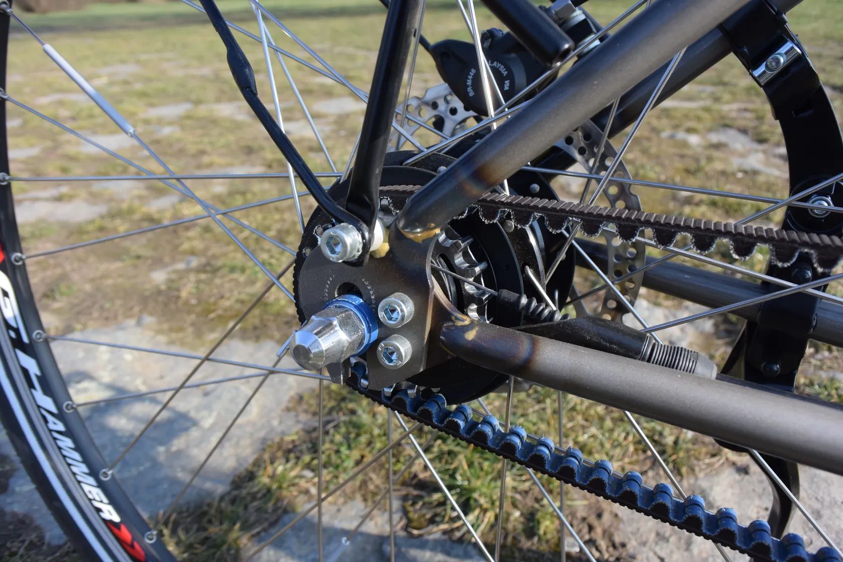 Excentr v ose pedálů a dělená pravá zadní patka – usnadňuje napínání řemenu a montáž/demontáž