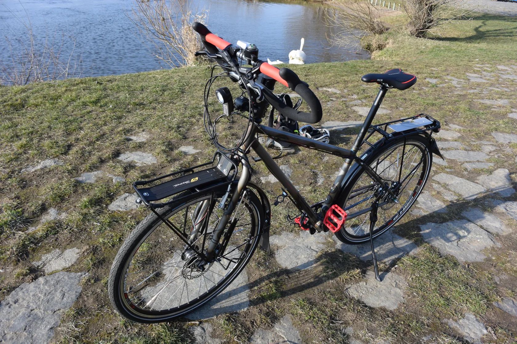 Dynamo v předním náboji + osvětlení s kondenzátory – světla svítí i po zastavení, vhodné pro dálkové cestování