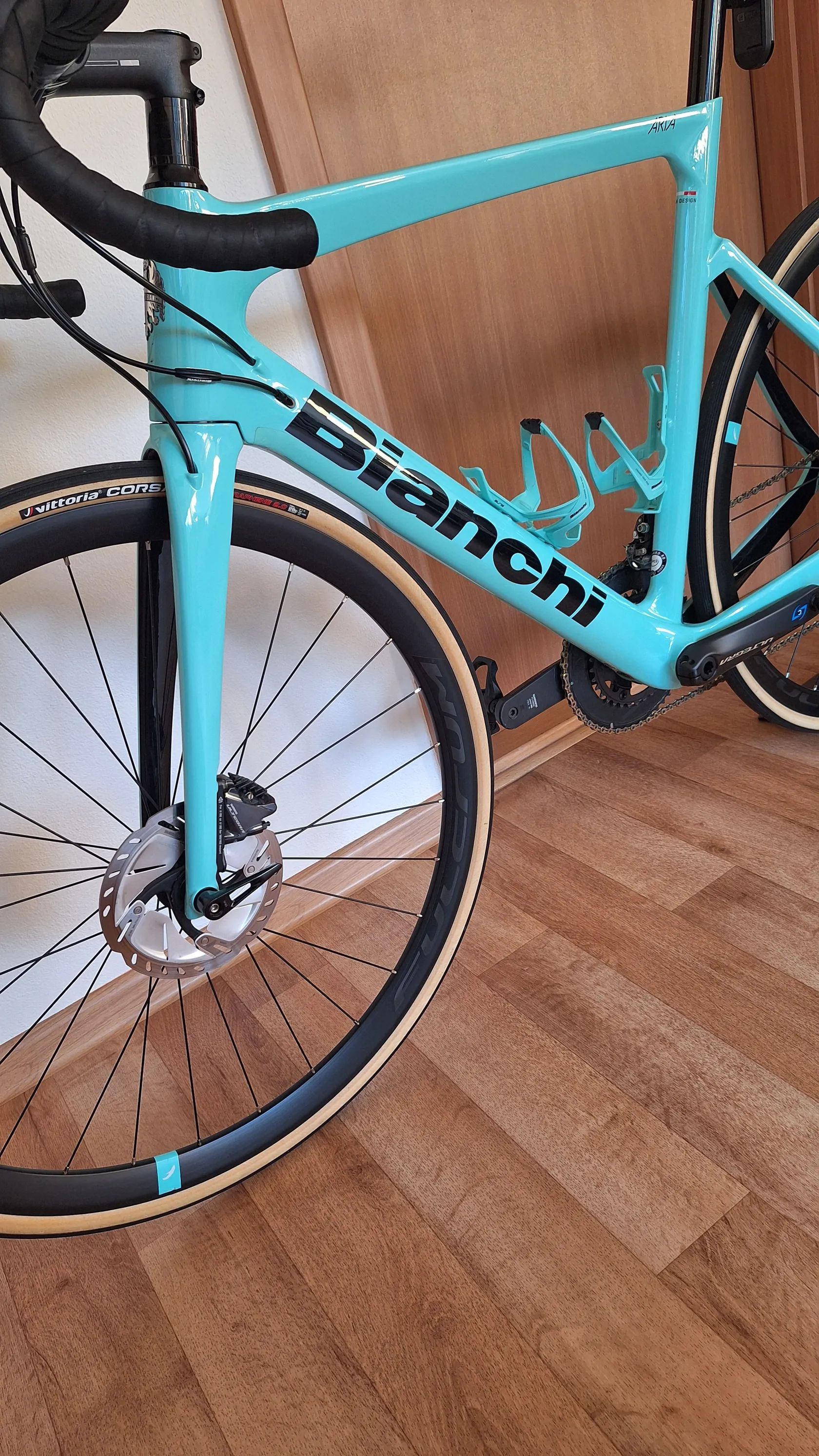 Prodám Bianchi Aria Disc na Shimanu Ultegra. Kolo jsem kupoval nové v Cyklobest Brno, jsem první majitel. Doklady ke kolu mám. Kolo je jak nové, prodávám z důvodu pořízení nového Bianchi Oltre. Nastal čas se posunout o kategorii výše :-) Kolo jsem ihned po dovezení domů polepil fólií, spodní rámová trubka komplet délka plus exponovaná místa. Měnil jsem pláště za světlé (Vittoria Corsa) a uvnitř jsou ultralehké Reveloop Race duše, 39g každá duše. Moje váha je 76 kg, takže žádná extra zátěž.