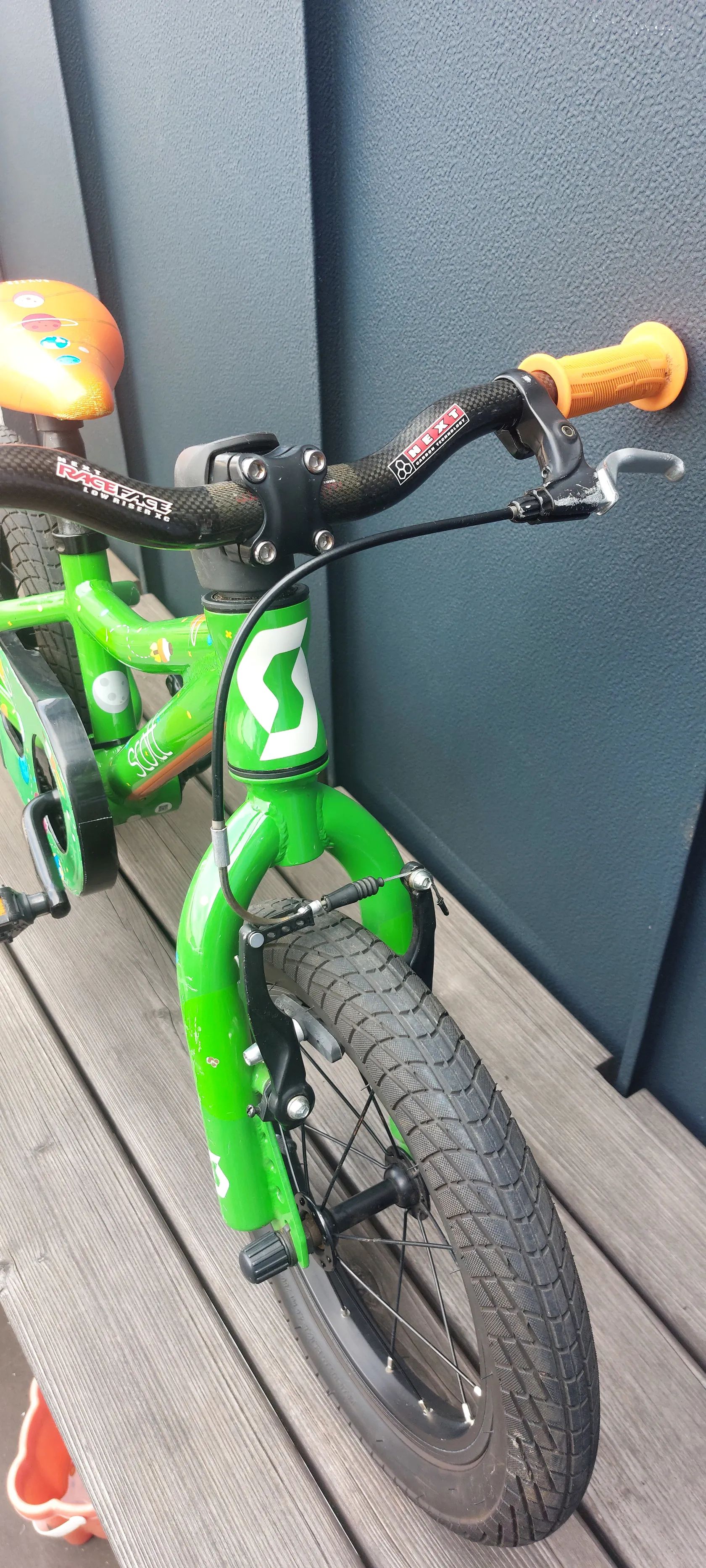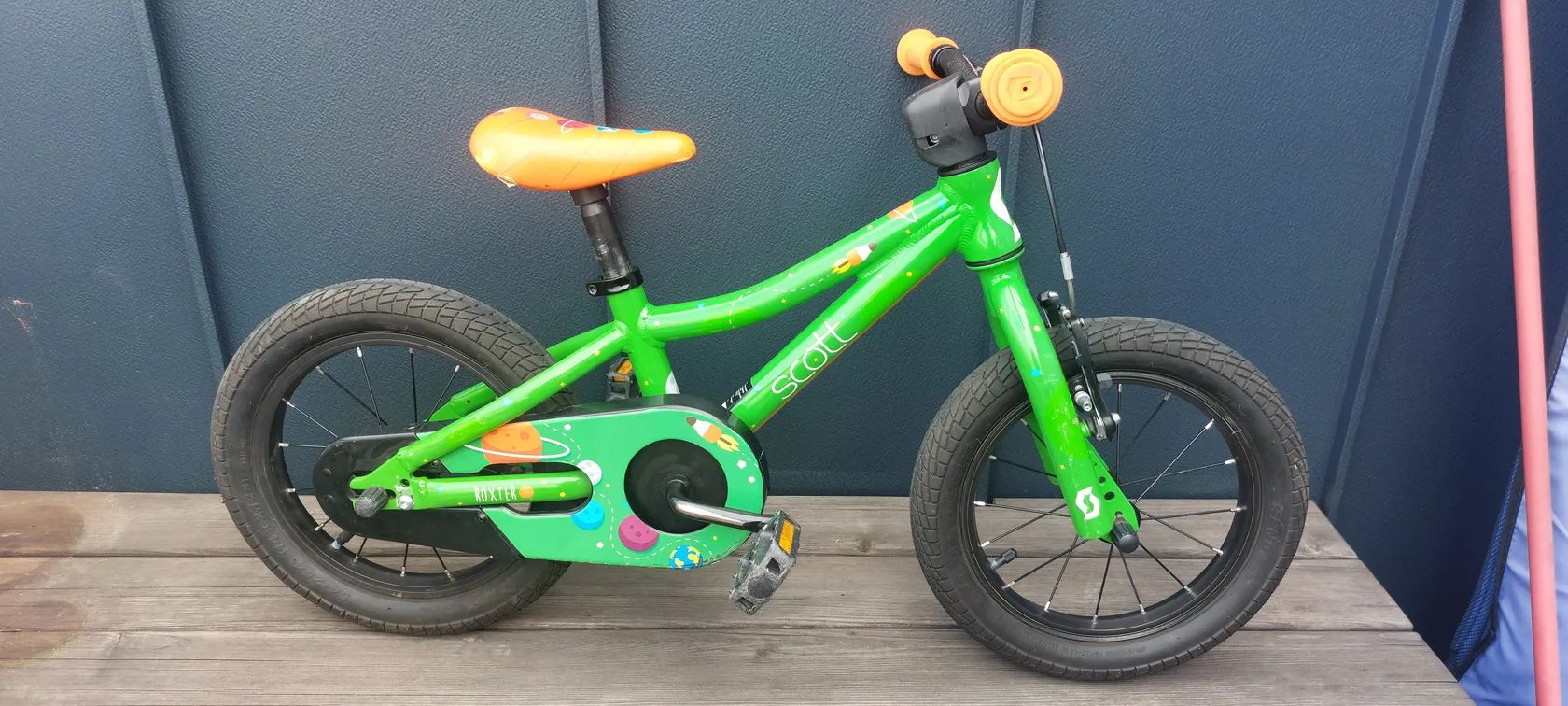 Dětské kolo Scott 14". Karbonové řídítka. Váha 6kg. Prasklý kryt řetězu, na funkci nemá vliv. Vše zohledněno v ceně.