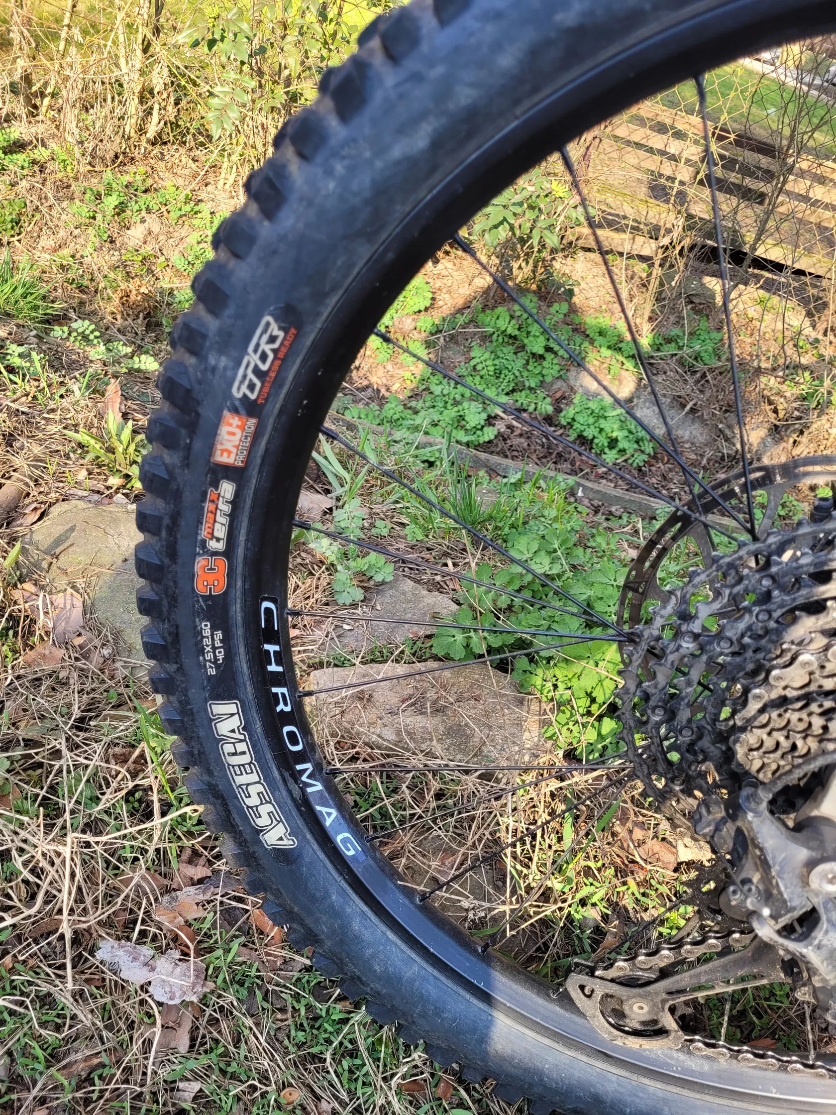 Zadek custom výplet (náboj Novatec, ráfek Chromag, vložka Tubolight) – robustní řešení pro tvrdší zacházení.
