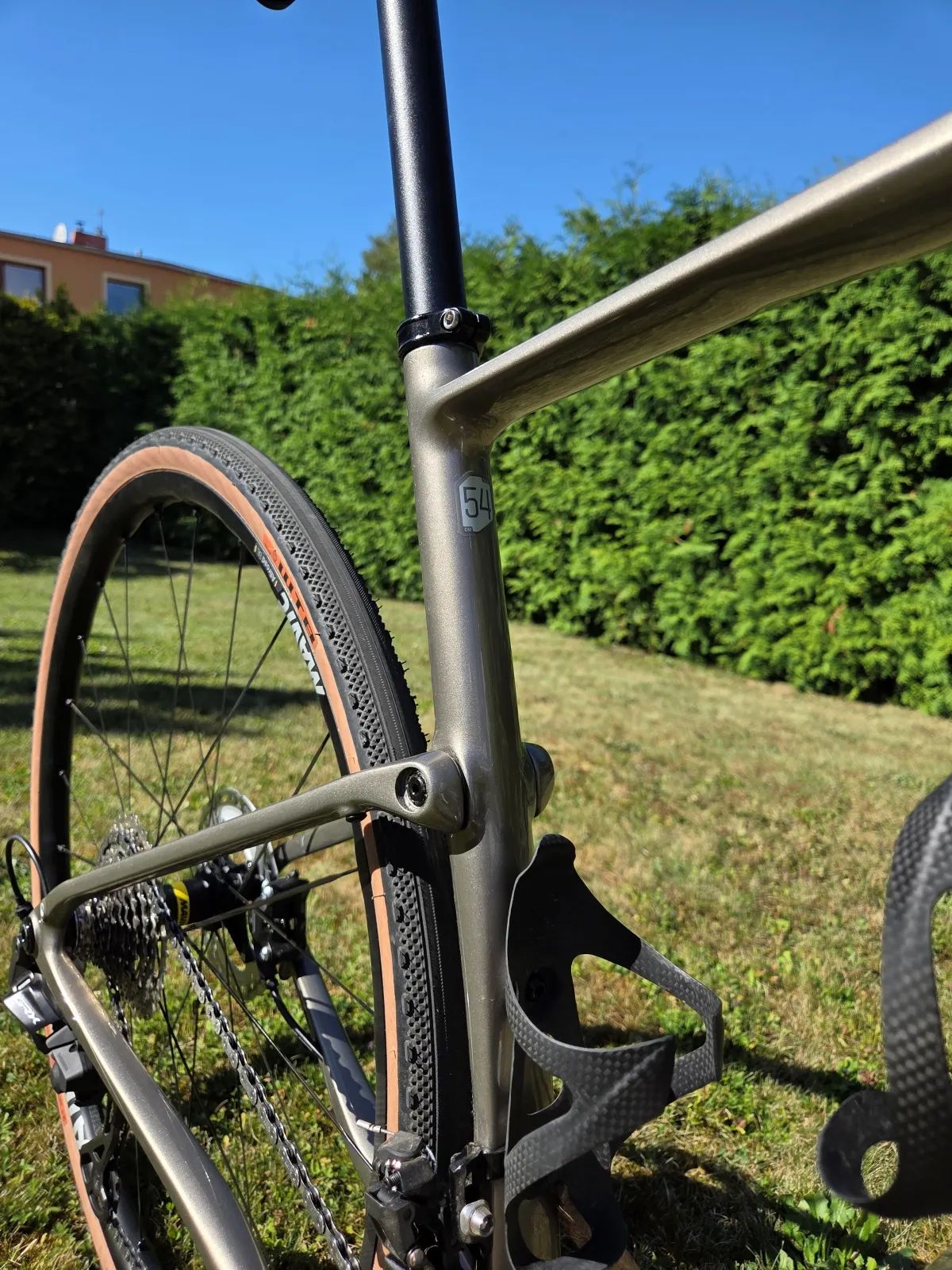 Hlavní přednosti a vylepšení: Zapletená kola: Mavic Allroad SL (výměna za základní těžká kola – obrovský rozdíl v dynamice). Obutí: Bezdušový systém (Tubeless) na pláštích WTB Byway TCS Fast Rolling gravel plášť kevlar Tanwall, 34-622 – vyšší komfort, nižší valivý odpor a ochrana proti defektu. Brzdy: Osazeno lepšími kotouči Shimano RT-MT800, 160 mm pro precizní brzdný účinek. Pedály: V ceně jsou nášlapné pedály Shimano SPD PD-M520 (standardně se prodává bez nich). Ochrana: Od prvního dne nalepena ochranná fólie na spodní rámové trubce.