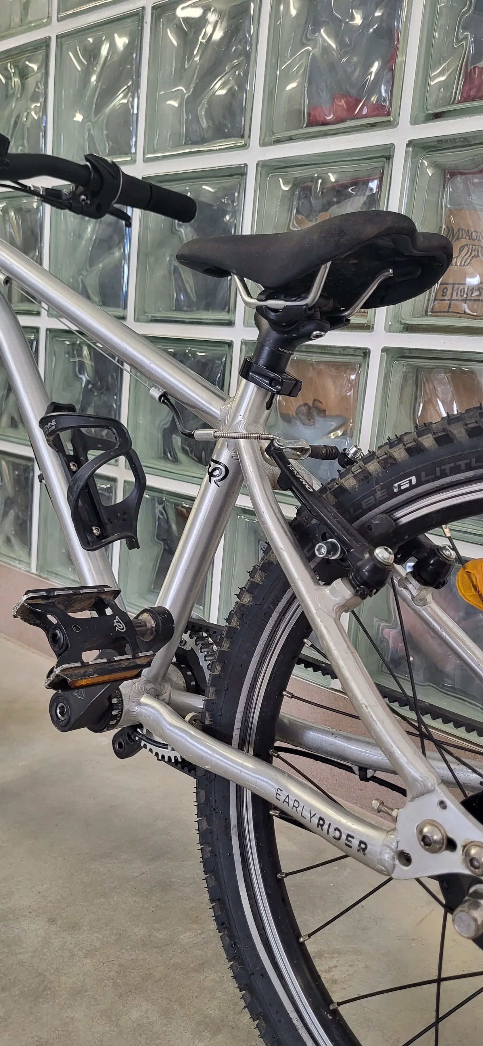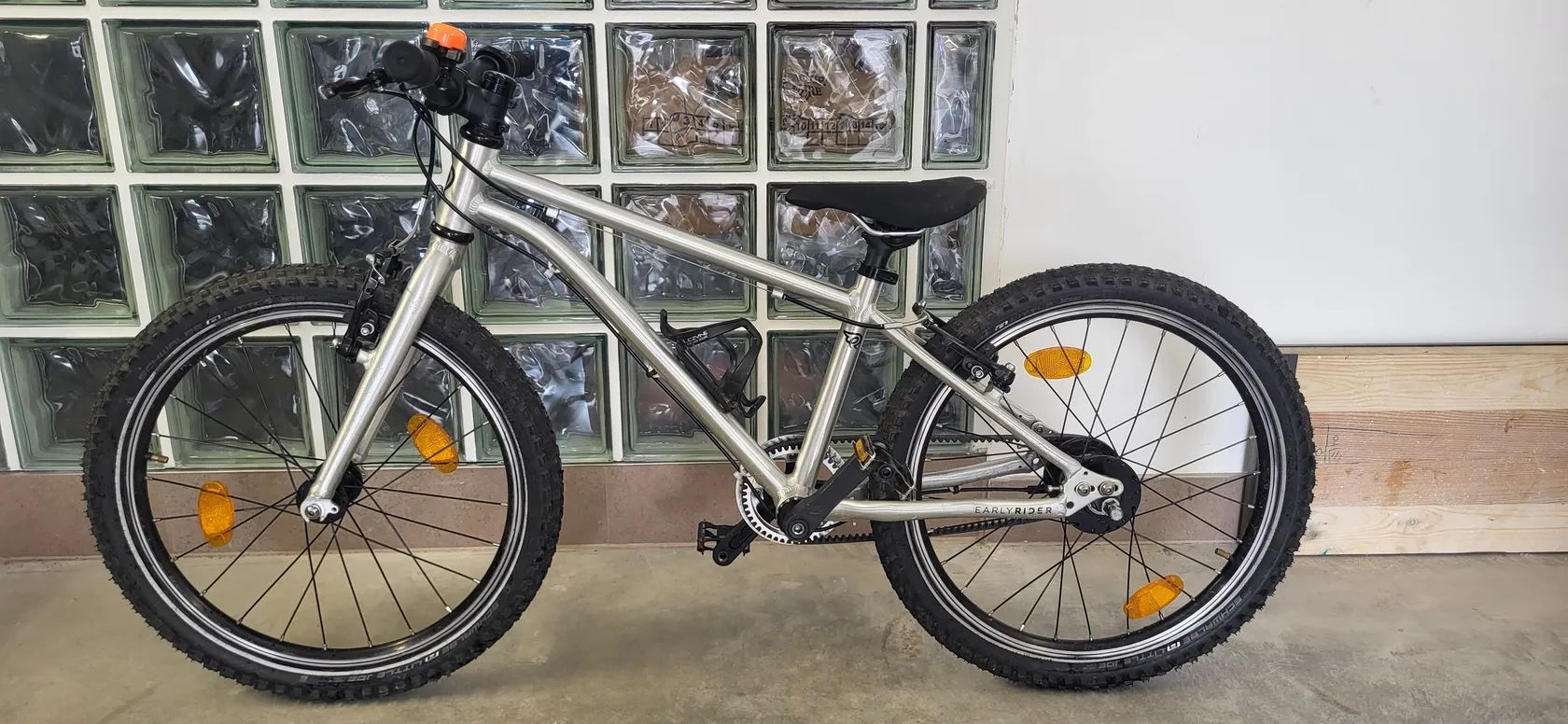 Lehké dětské 20" kolo, plně funkční, pár kosmetických drobností. Bezúdržbový (a čistý) pohon na řemen. Nasazeny nové pláště Schwalbe Little Joe, lite skin, kevlar (pro lepší a bezpečnější jízdu na nezpevněném povrchu). Zvonek a košík na lahev součástí. Neposílám. K předání Brno západ.