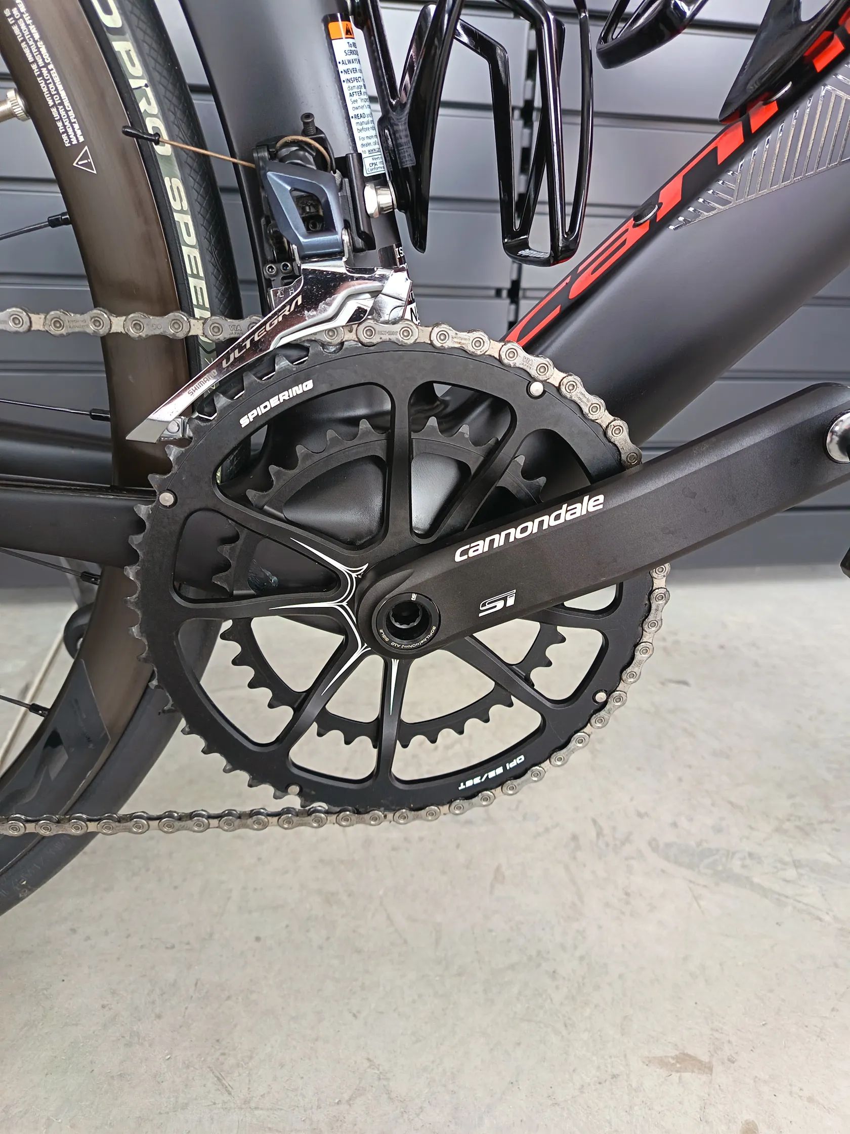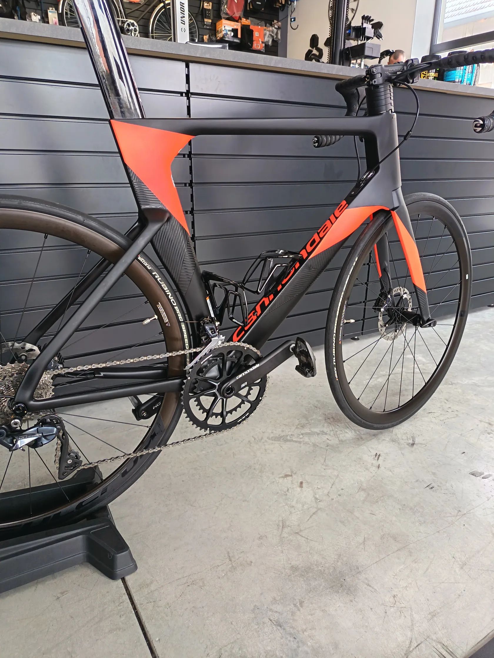 Technické informácie: Rám : SystemSix, Ballistec Carbon, Di2 ready, SAVE, BB30, flat mount, Speed Release thru-axle Vidlica : SystemSix, Ballistec Carbon, SAVE, Speed Release thru-axle Kľuky : Cannondale HollowGram Si, BB30 w / OPI Spidering, 52/36 zubov Stredové zloženie : Cannondale Alloy PressFit30 Prehadzovačka : Shimano Ultegra GS Prešmykač : Shimano Ultegra Radiace páčky : Shimano Ultegra Hydro disc, 2x11 Kazeta : Shimano 105, 11 rýchlostí, 11-30 zubov Reťaz : Shimano 105 Brzdy : Shimano Ultegra Hydro kotúčové, kotúče RT81 160/140 mm Brzdové páky : Shimano Ultegra Hydro disc Ráfiky : Fulcrum Racing 400 DB, Alloy Clincher, výška profilu 35 mm Náboje : Fulcrum Racing 400 DB, 12x100 mm predné, 12x142 mm zadný Drôty : Fulcrum, Double-butted, Stainless, Bladed Plášte : Vittoria Rubino Pro Speed 23c, 700x26 mm Riadidlá : Vision Metron 4D Flat, UD Carbon Predstavec : Vision Trimax OS, 2014 Alloy, 3D Forged Hlavové zloženie : Tapered, 1-1 / 8 "upper, 1-1 / 4" lower bearing Sedlo : prológ Dimension, Tirox lyžiny Sedlovka : Cannondale KNOT, Carbon, 330mm Farba : Čierna / červená