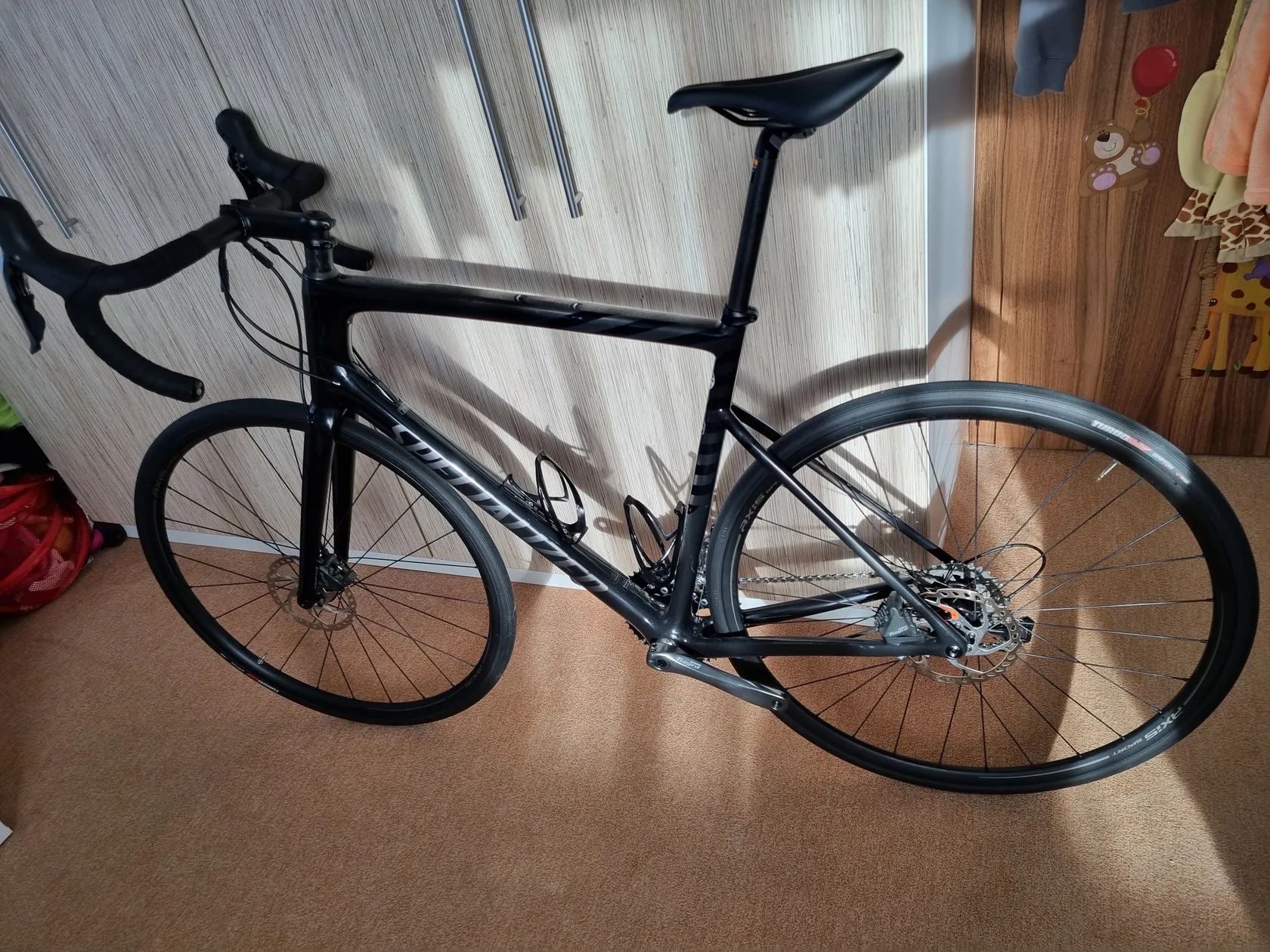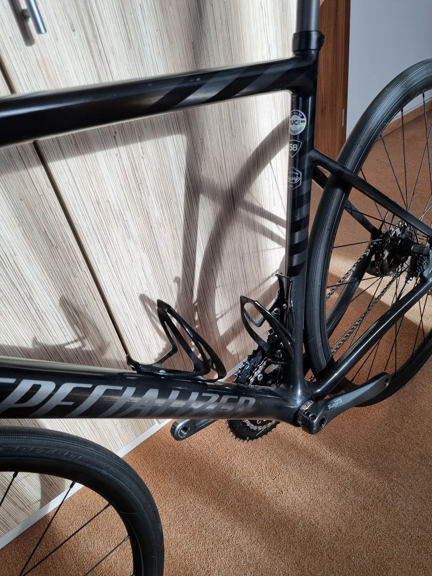 Málo jeté silniční kolo Specialized Tarmac SL6 Sport, vel. 58 (kolo je spíše menší). Osazeno Shimano Tiagra 2×10. Vše v pořádku, téměř nové, jen odřenina na pravé klice od řetězu. Původní pláště nesjeté. PC 68tis. Nastaveno na 185 cm, vhodné od 180 cm.