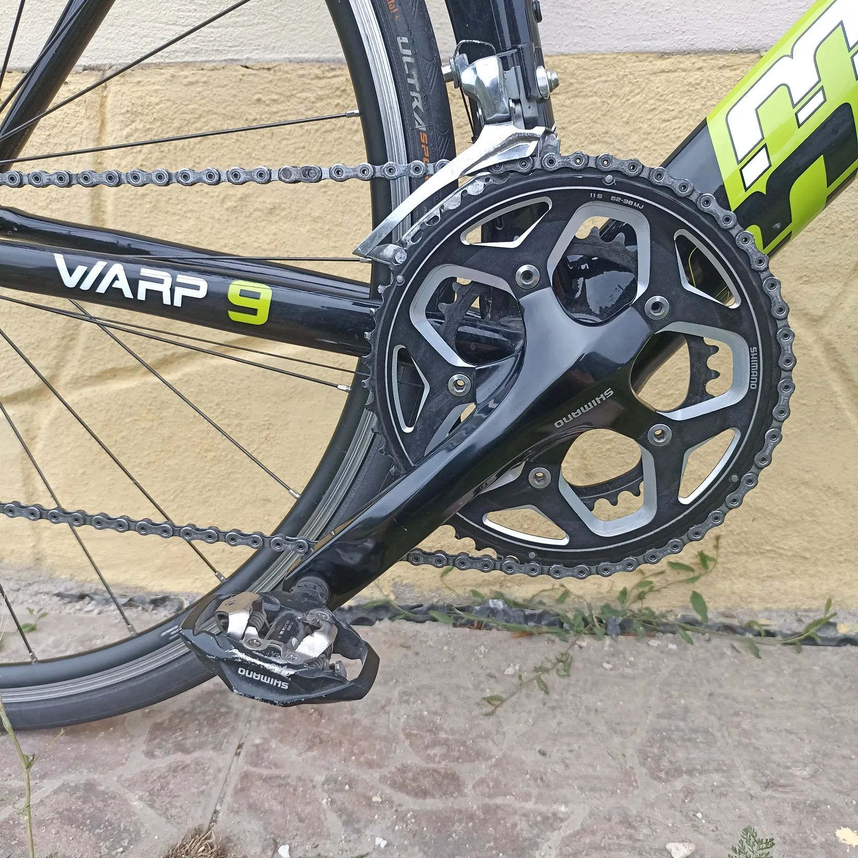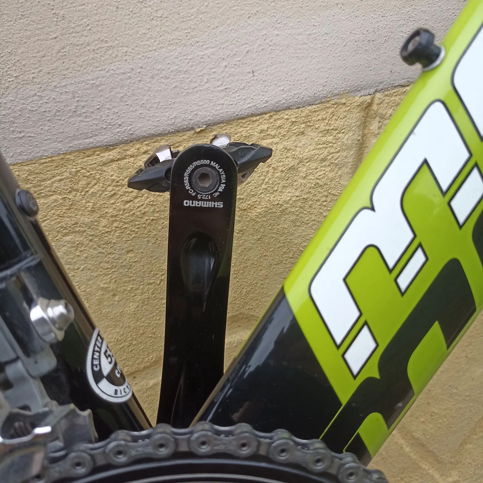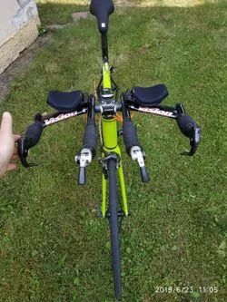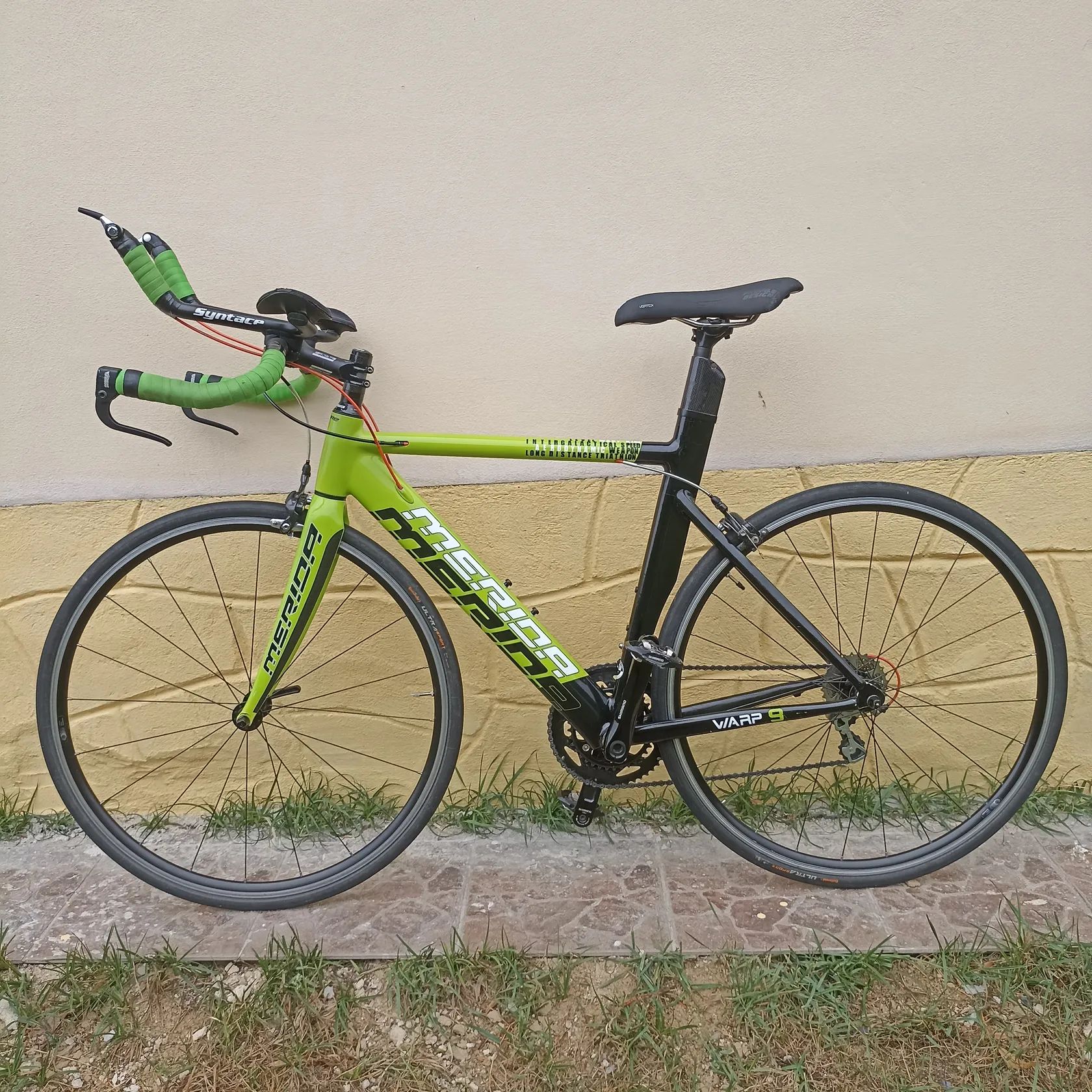 Starší, ale funkční kolo ideální pro začátky v triatlonu. Nyní nastaveno pro jezdce 172cm. Kliky Shim. 172,5cm, převodník 52-36, kazeta 10s 11-28. Karbonová vidlice, představec FSA, řidítka Syntaxe, páčky Prof. Design., TT sedlo Vertex (titan). Kola Shimano 622x15c s náboji Sh.WH-R500 a pláště Continental ultra sport 25mm. Jede hezky. Škrábance a oděrky jsou, ale není bourané nebo svařované..