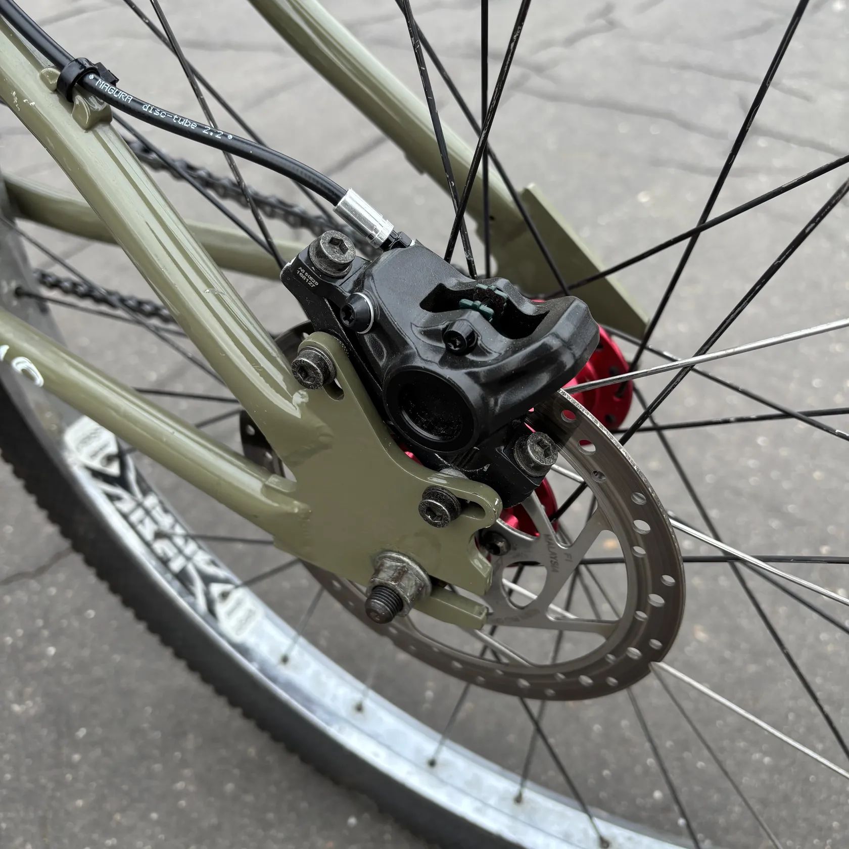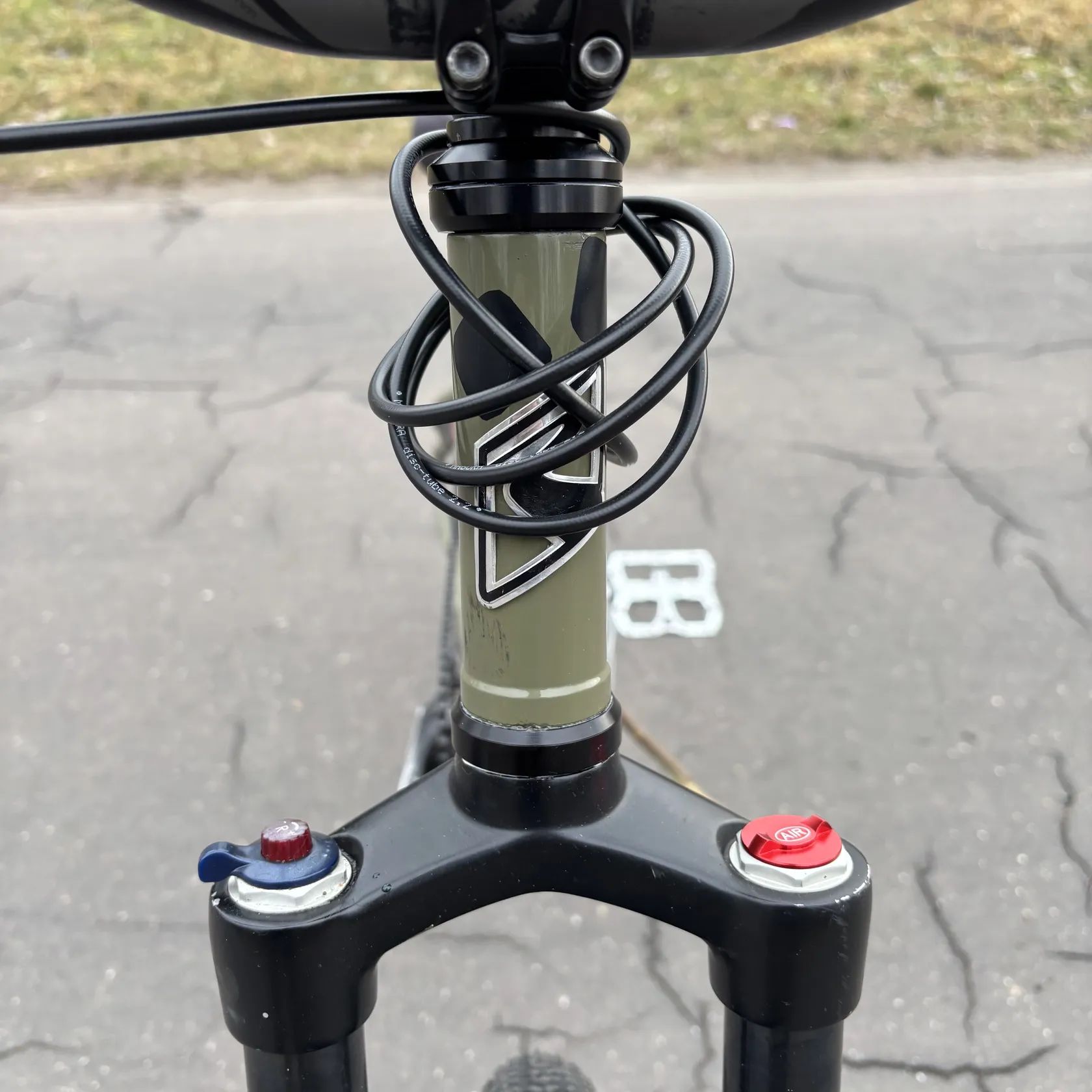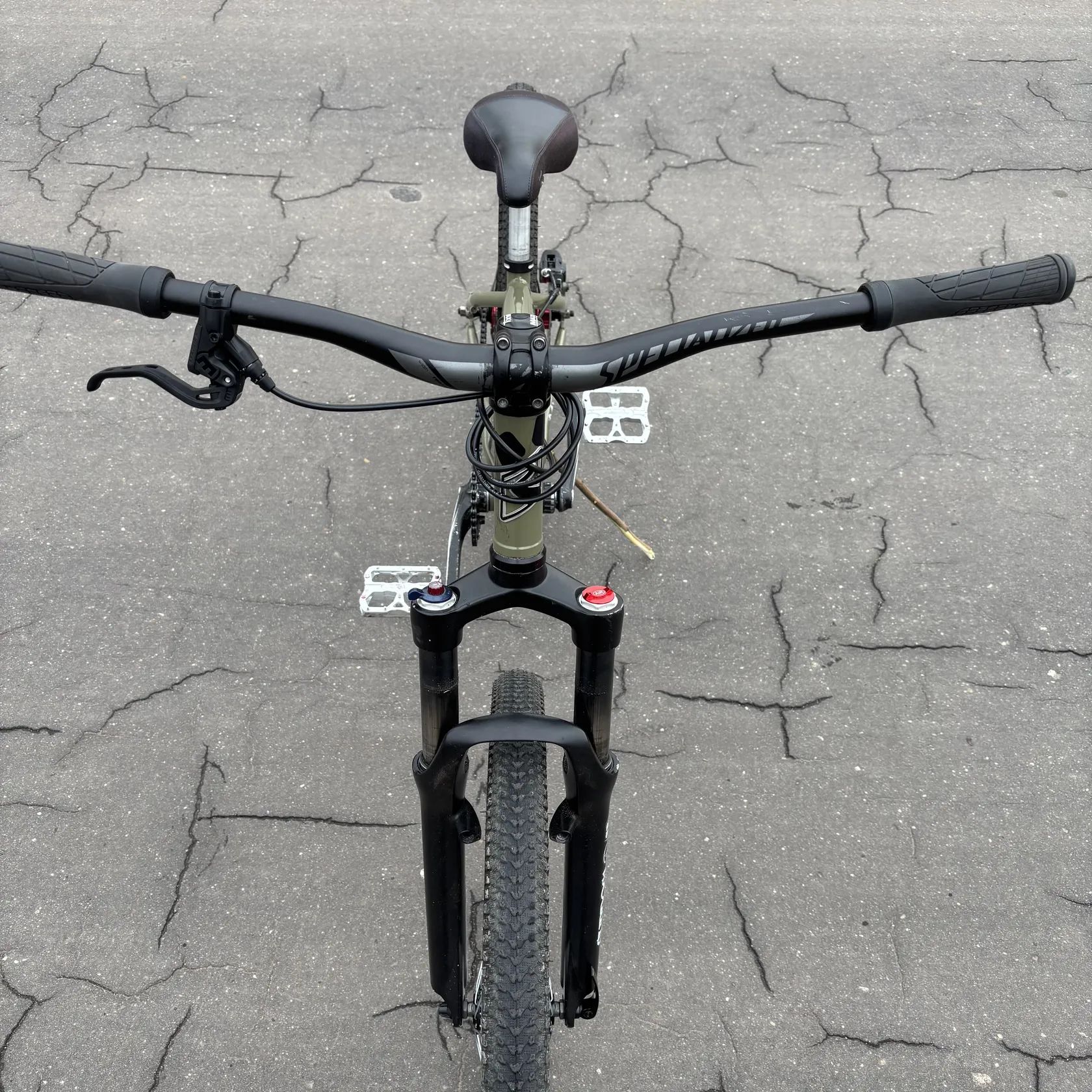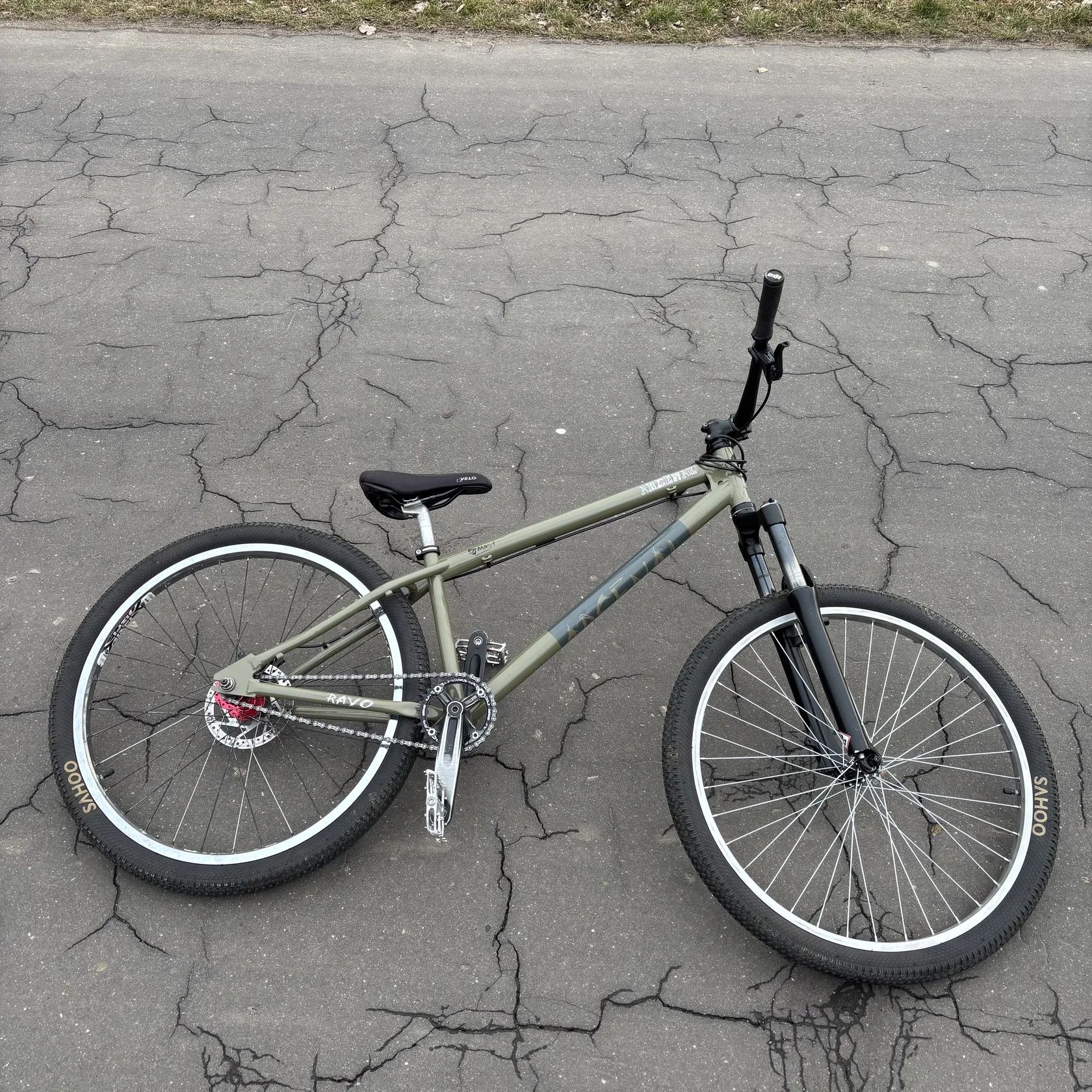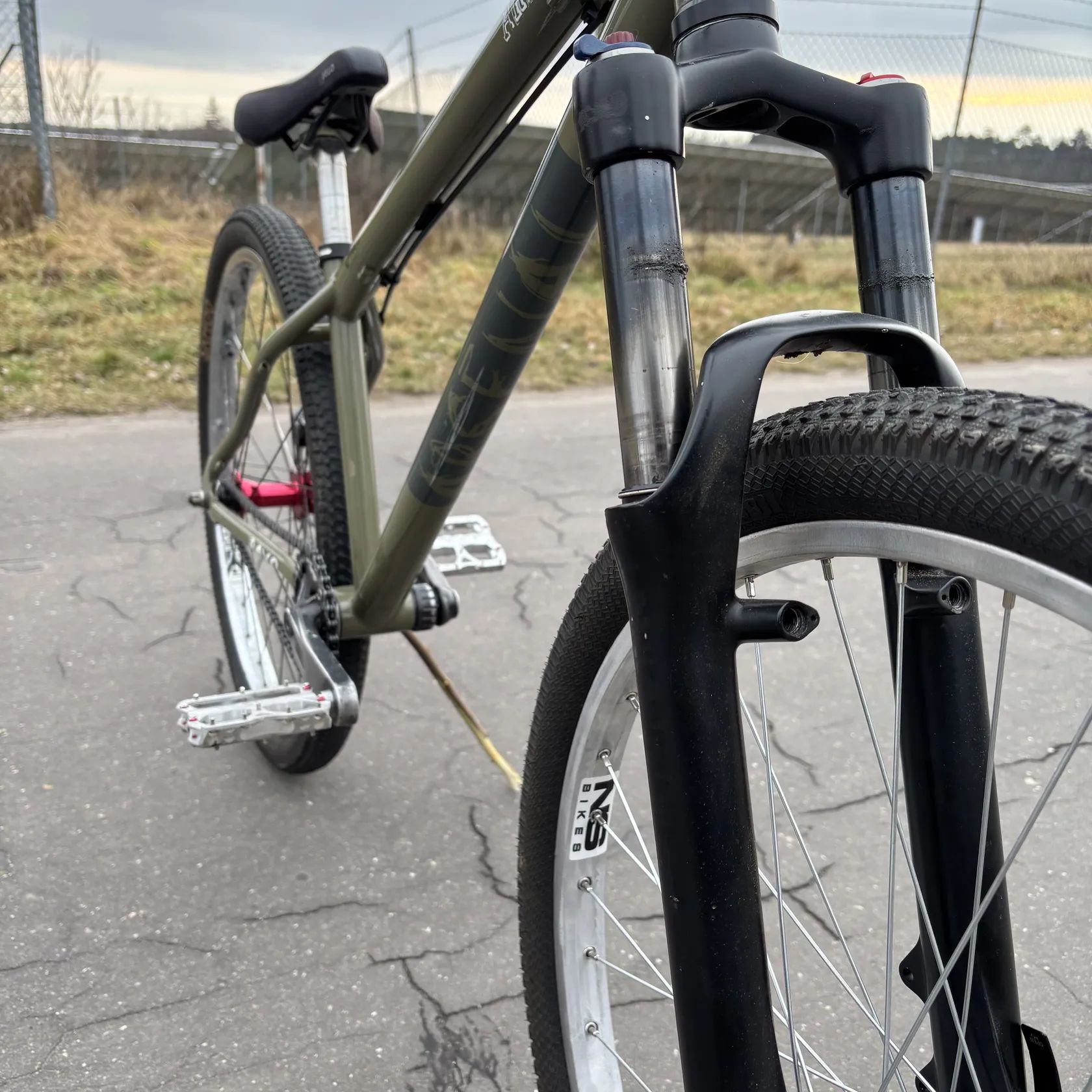 Komponenty: Nová hydraulická brzda magura MT2 Vzduchová vidlice suntour (s regulací odskoku a komprese) + nové hlávko MAX1 (zapouzdřené ložiska) Pedály Reverse Escape (podřenější ale na stříbrné to nejde vidět, PC 2200,-) Kliky Hussfelt Howitzer + nový narrow-wide převodník 32 zubů Řídítka a představec specialized Nový přední náboj force Pláště sahoo 2,1 palce Gripy ergon Sedlo Velo BMX Zadní náboj Raptor BMX