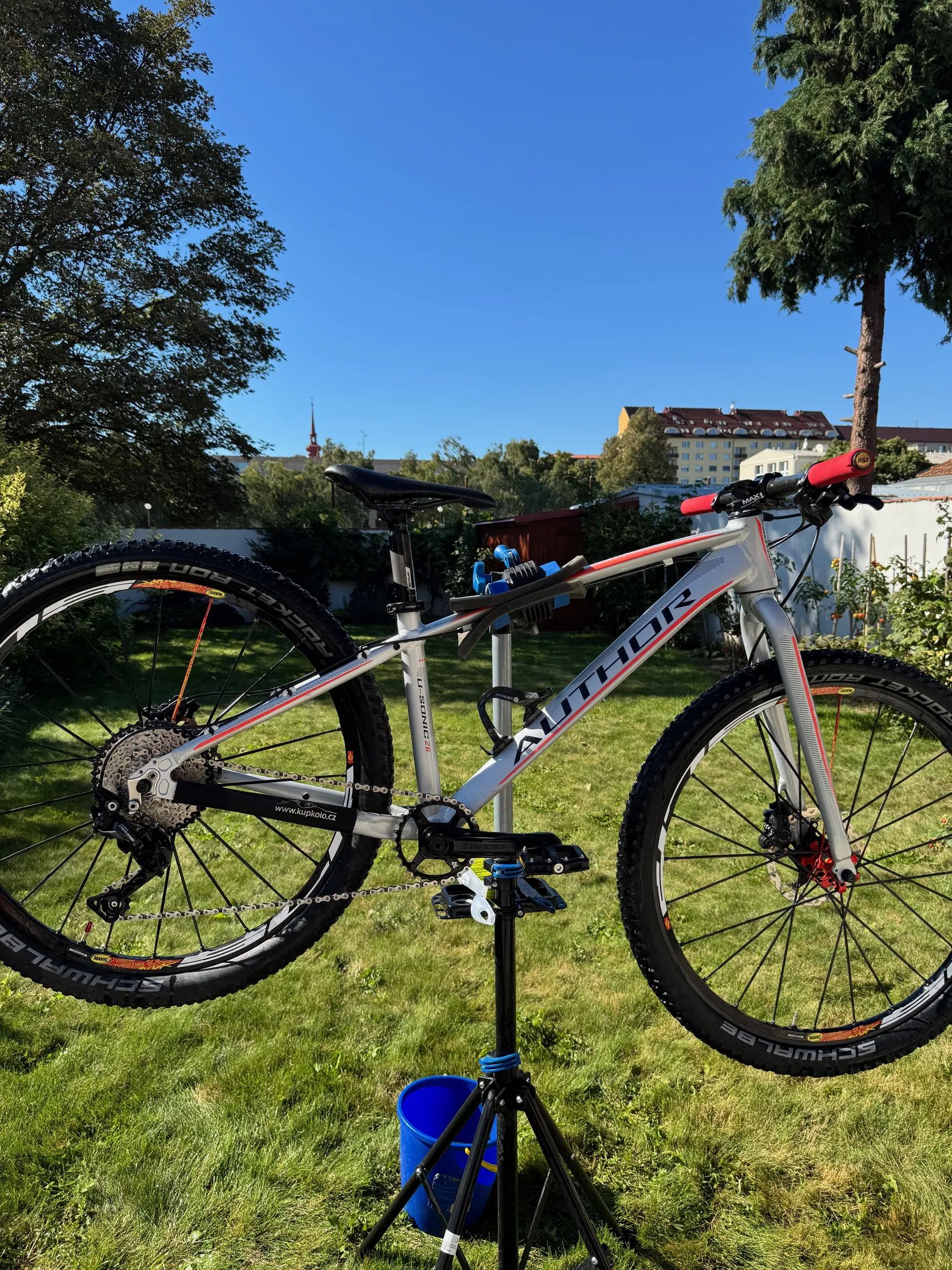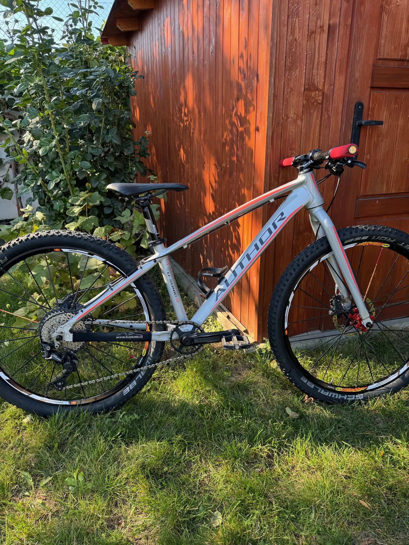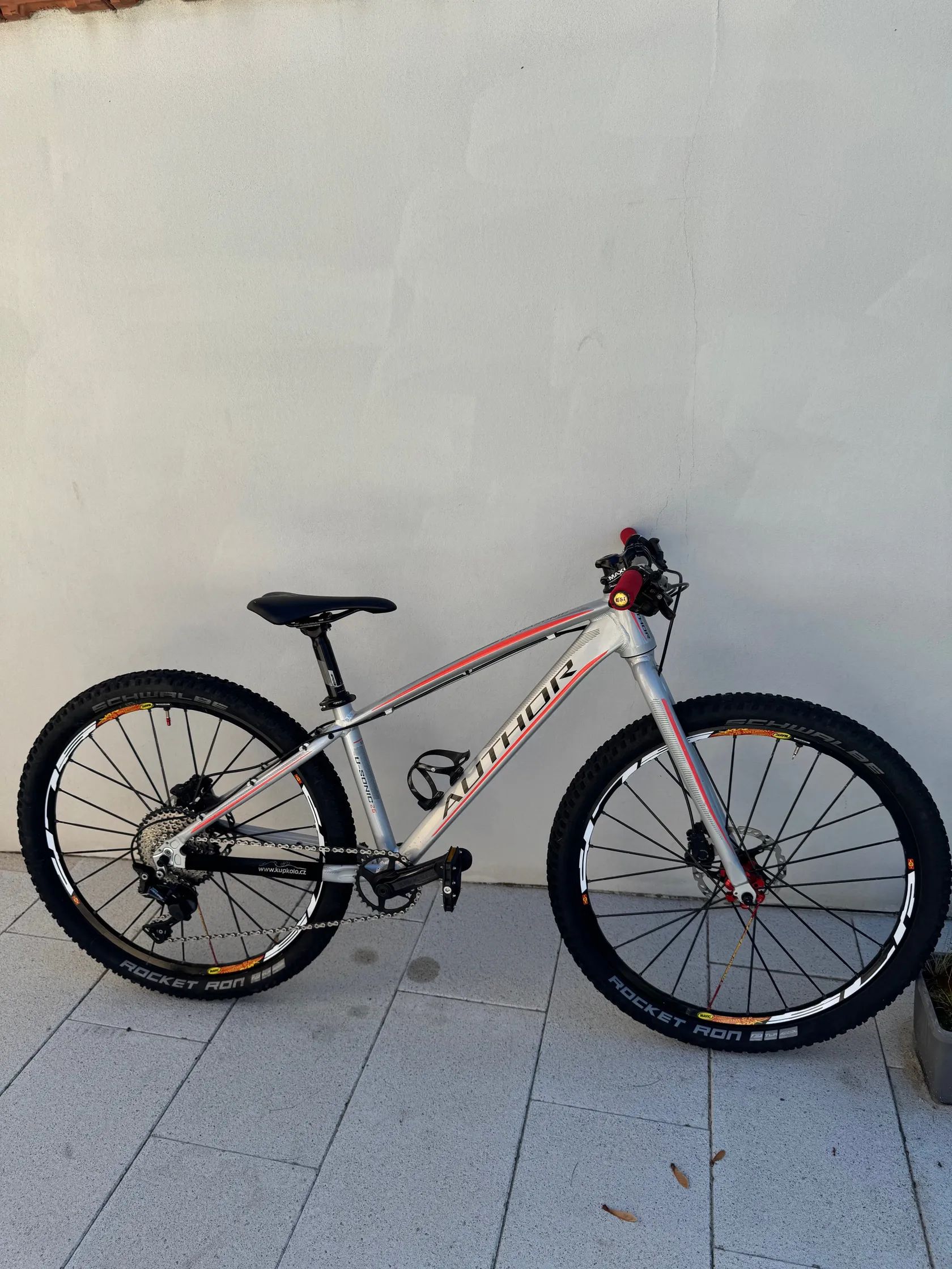 Prodám dětské horské kolo AUTHOR Ultrasonic 26. Jedná se o individuální stavbu pro dcerku. Technická specifikace Rám: Ultrasonic Triple Butted Alloy 6061 vel. 13,5 Vidlice: Ultrasonic Al Zapletená kola: MAVIC Cosmic SLR Kotoučové brzdy: SH MT 501 Brzdové kotouče: SH XT SM-RT86 Ice-Tech 160 /160 mm, 6 děr Kliky: RACE FACE Aeffect 155 mm (servisně zkracováno) Převodník: RACE FACE 30 T Krytky klik: ZÉFAL Pedály: VP – 227 (nebo – 600,- Kč plastové) Řazení: SH Deore 10 Sp. Přehazovačka: SH Deore GS 10 Sp. Kazeta: SH Deore 11-42, 10 Sp. Řetěz: SH + rychlospojka Středové složení: SH XT Hlavové složení: AUTHOR ŘÍDÍTKA: AUTHOR Carbon, 600 x 31,8 Gripy: ESI Red 130 mm Představec: MAX 1, 45 mm Sedlovka: FSA V-Drive, 31,6 / 350mm Sedlo: VELO MX, 125 x 250 mm Pláště: Schwalbe Rocken Ron Performance TLR Addix Duše: Bezduše Košík na bidon: AUTHOR Carbon