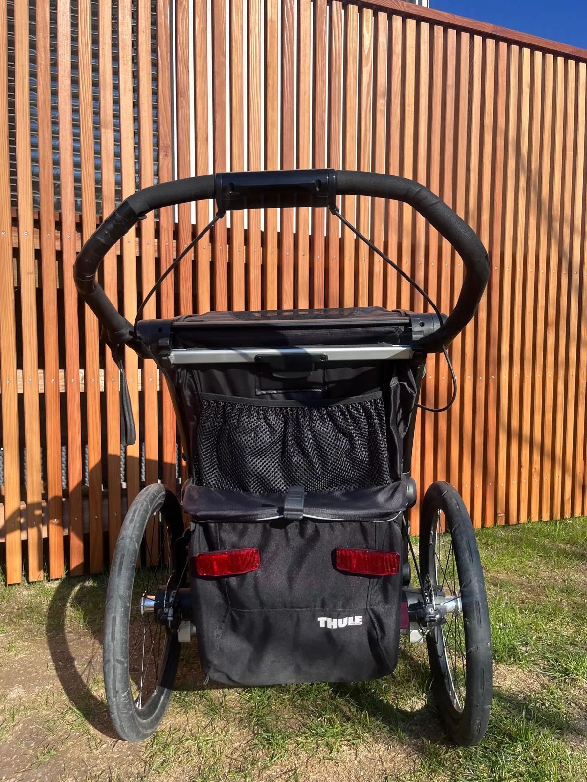 Součástí je bohaté příslušenství- kromě výše uvedeného i boční pláštěnky, pláštěnka na přední díl, sluneční clona, prostorná brašna atd. Vše je výborném stavu, používáno jedním dítětem a využíváno pouze na běh a turistiku. Jedinou, spíše kosmetickou vadou, je prasklý molitan na madle- nevím, zda lze vyměnit, omotali jsme černou páskou. Set na kolo nepoužitý, ještě zabalený. Oproti předchozím modelům má vozík přidanou brzdu i na madle.