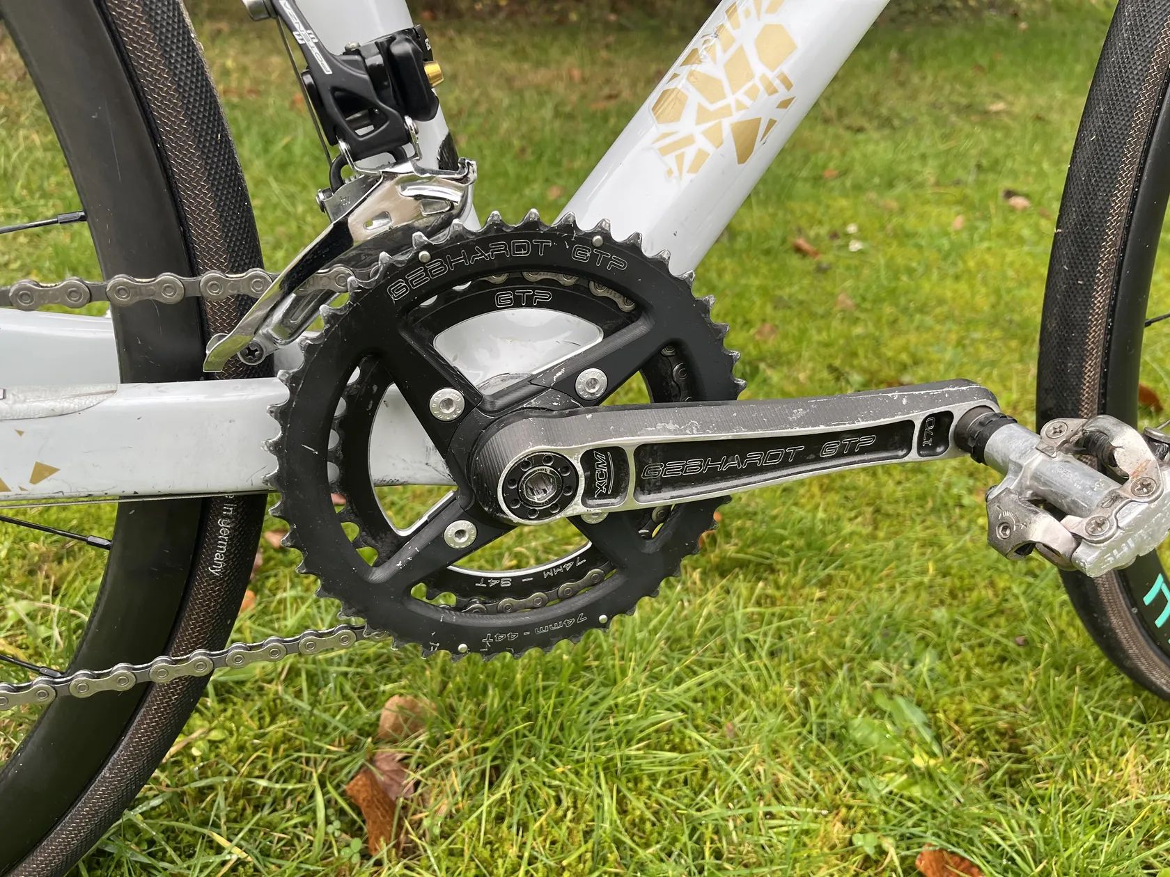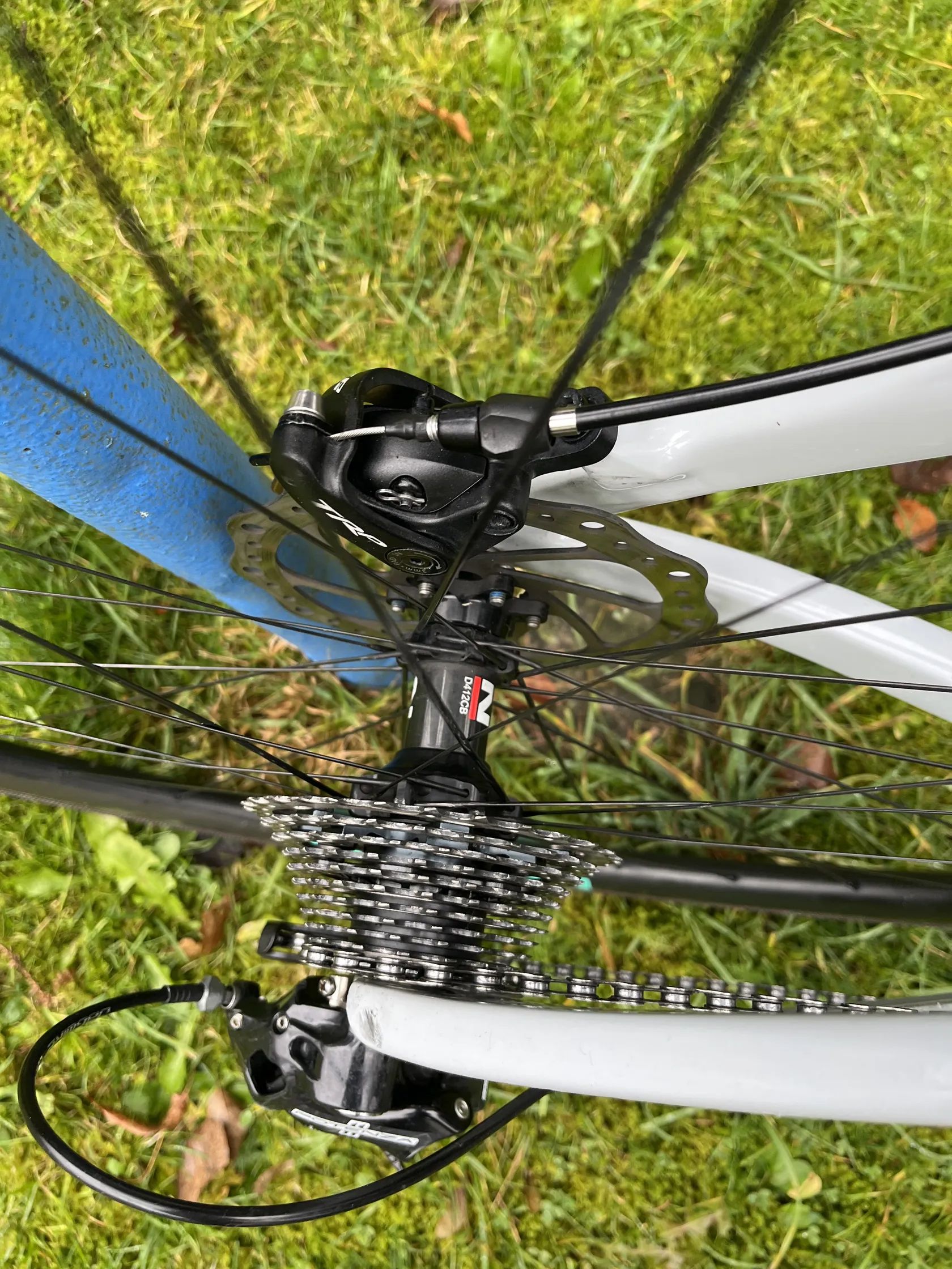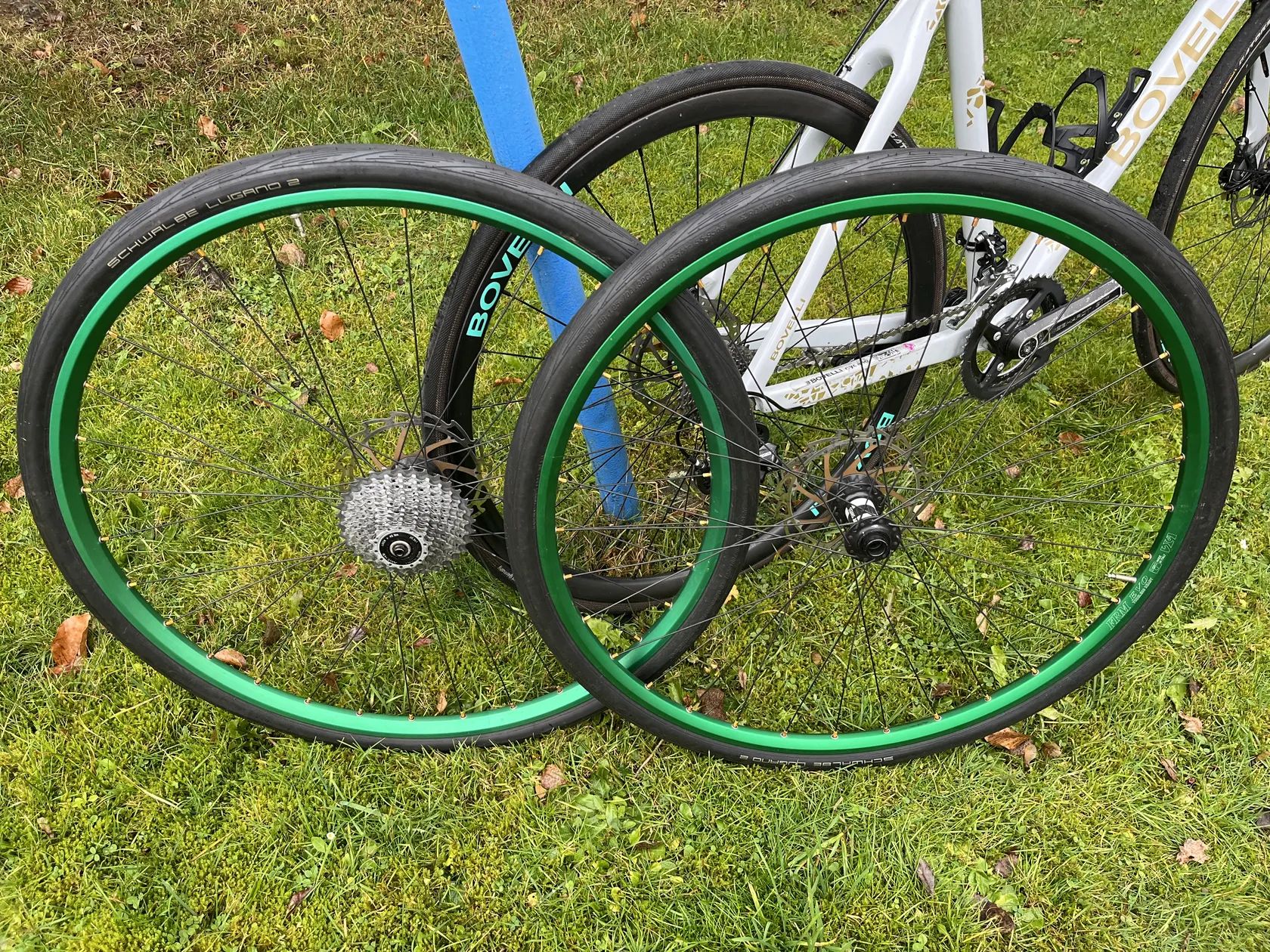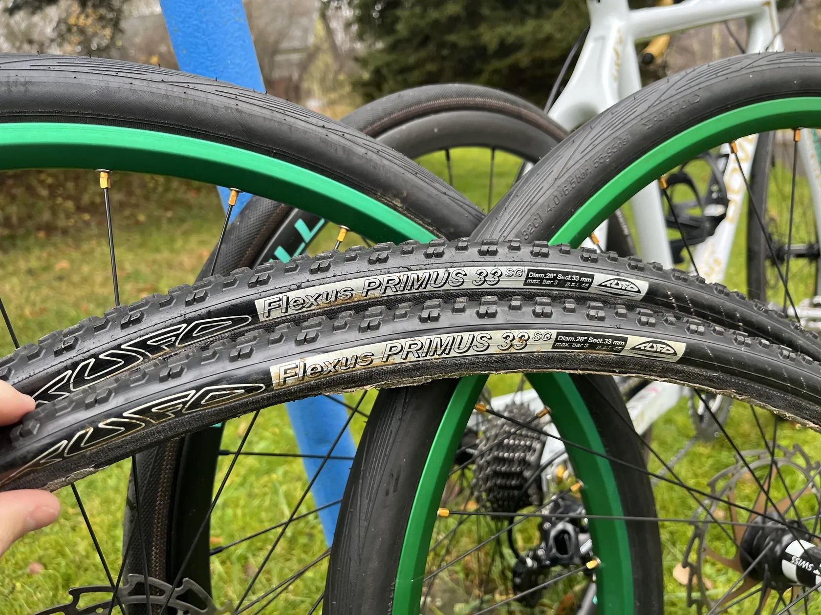 V ceně jsou 2x galusky Tufo na Cyklokros, dále v ceně 2x zapletená kola s lehkými alu ráfky FRM s náboji Dt Swis 350 a kazetou,kotouči a silničními plášti.