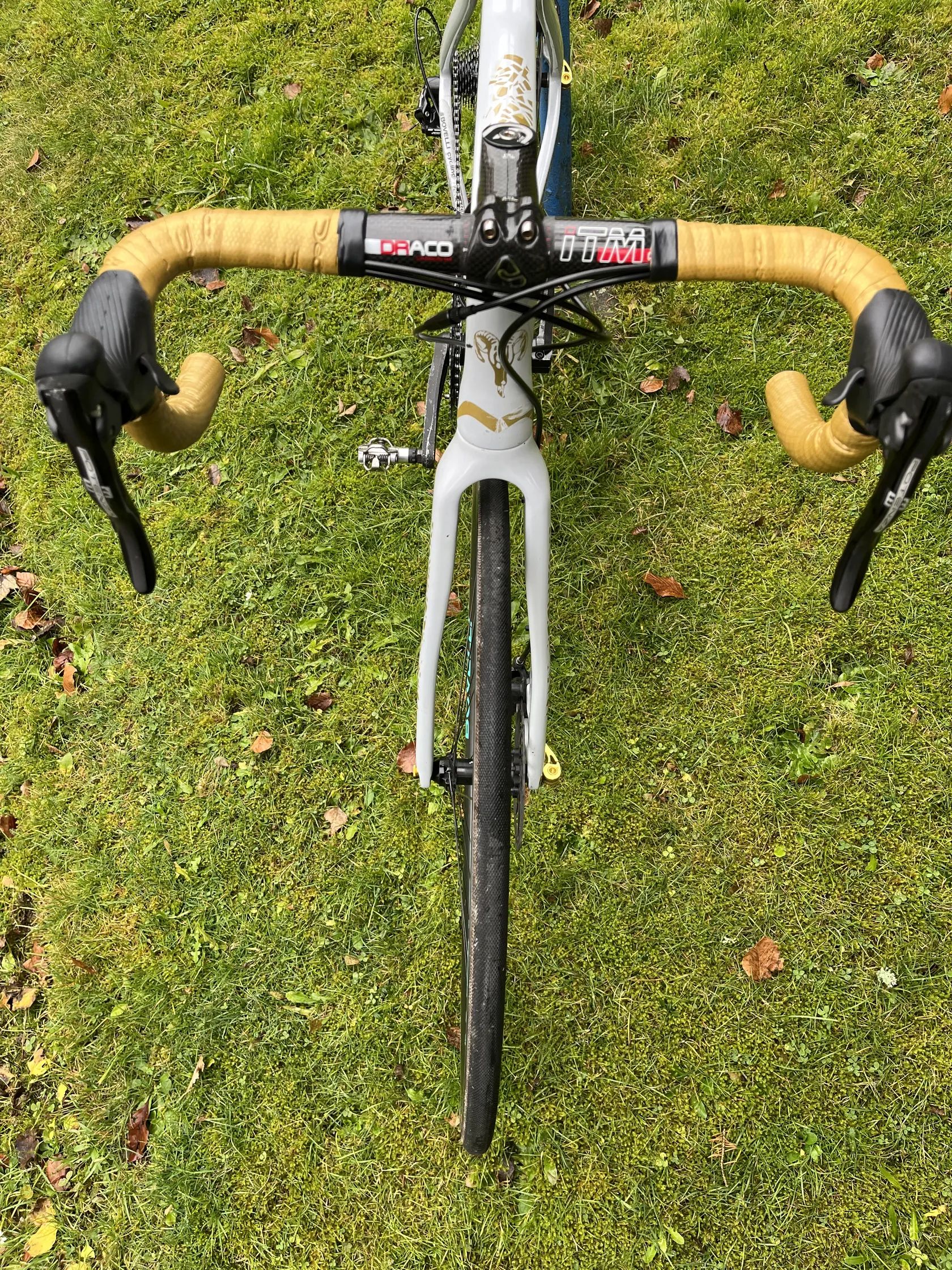 Karbonový rám+vidlice Karbon řídítka ITM Draco Představec ITM Pathom Karbon sedlovka+sedlo Karbonová kola s náboji Novatec s Titan upínáky. Koutoučové brzdy TRP Spyke Gebhart CNC kliky s převodníky 44/34zubů Kompletní osazení Campagnolo Potenza