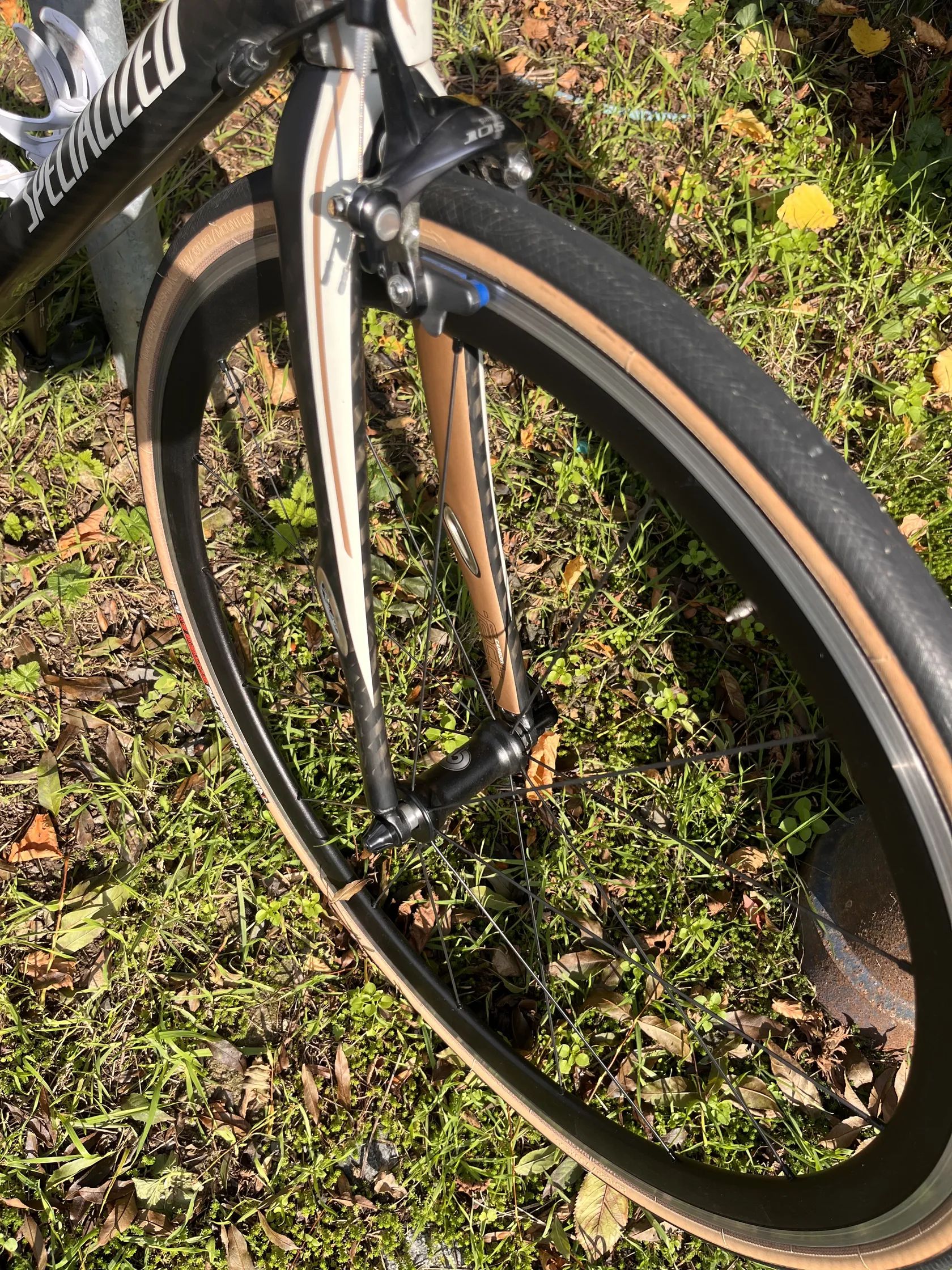 Menší karbonové závodní silniční kolo Specialized Ruby Comp, na foto nastaveno na 143cm. Na kole jsou žákovské převody, lze prohodit za klasickou Shimano kazetu.