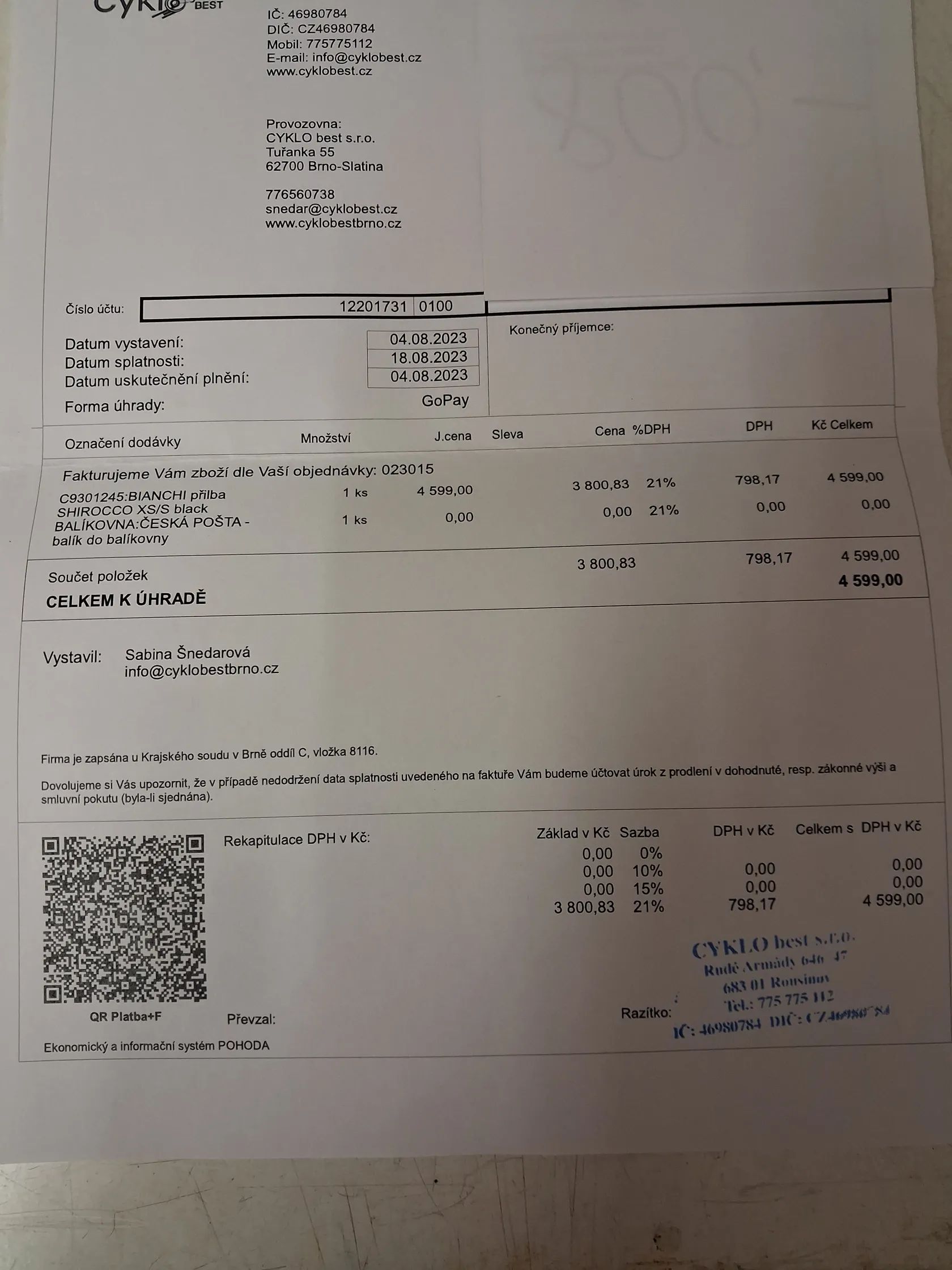 Dobrý den, mám zájem o Vámi nabízený inzerát Casco Bianchi