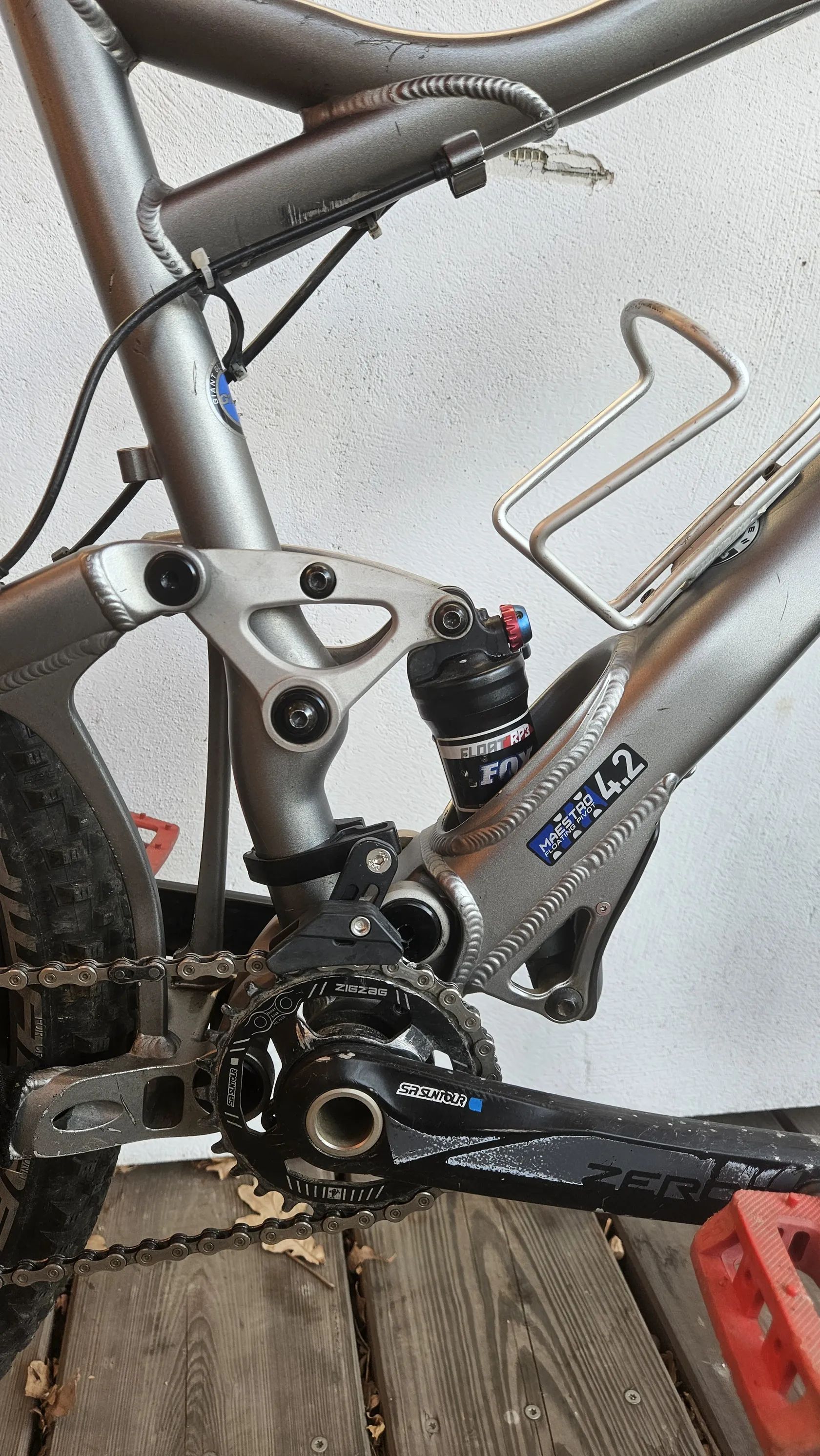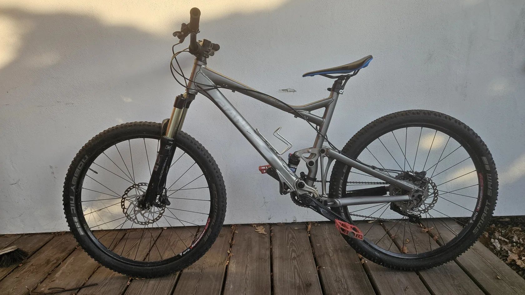 Trailové celoodpružené horské kolo Giant Trance 26', velikost papírově M, ale je to starší kousek a po upgradu by to bylo na dnešní poměry spíše S. Nové brzdy Shimano SLX, pohon předělaný na 1x10. Lehké. Vhodné na začátky na traily i do bike parku.