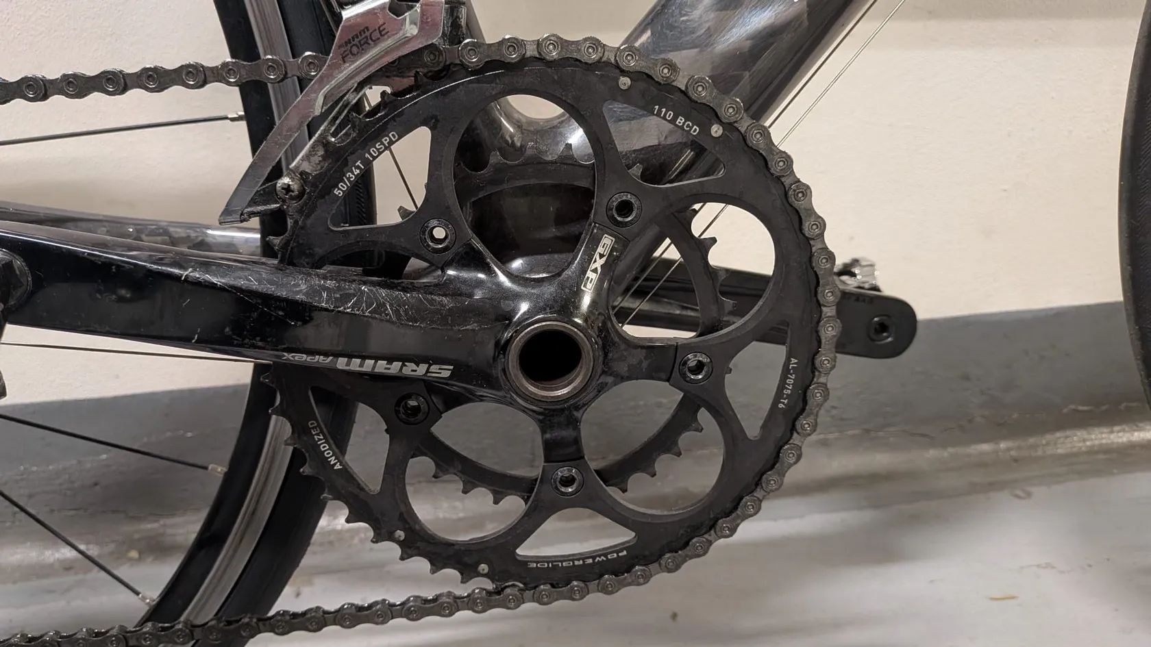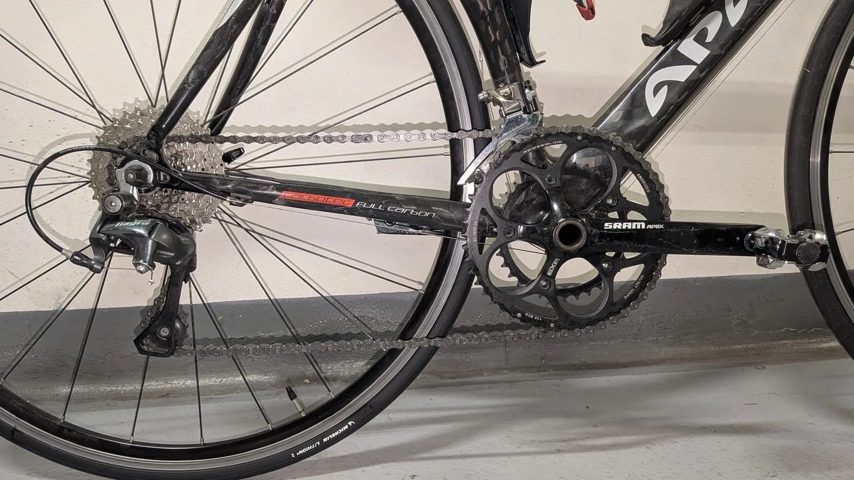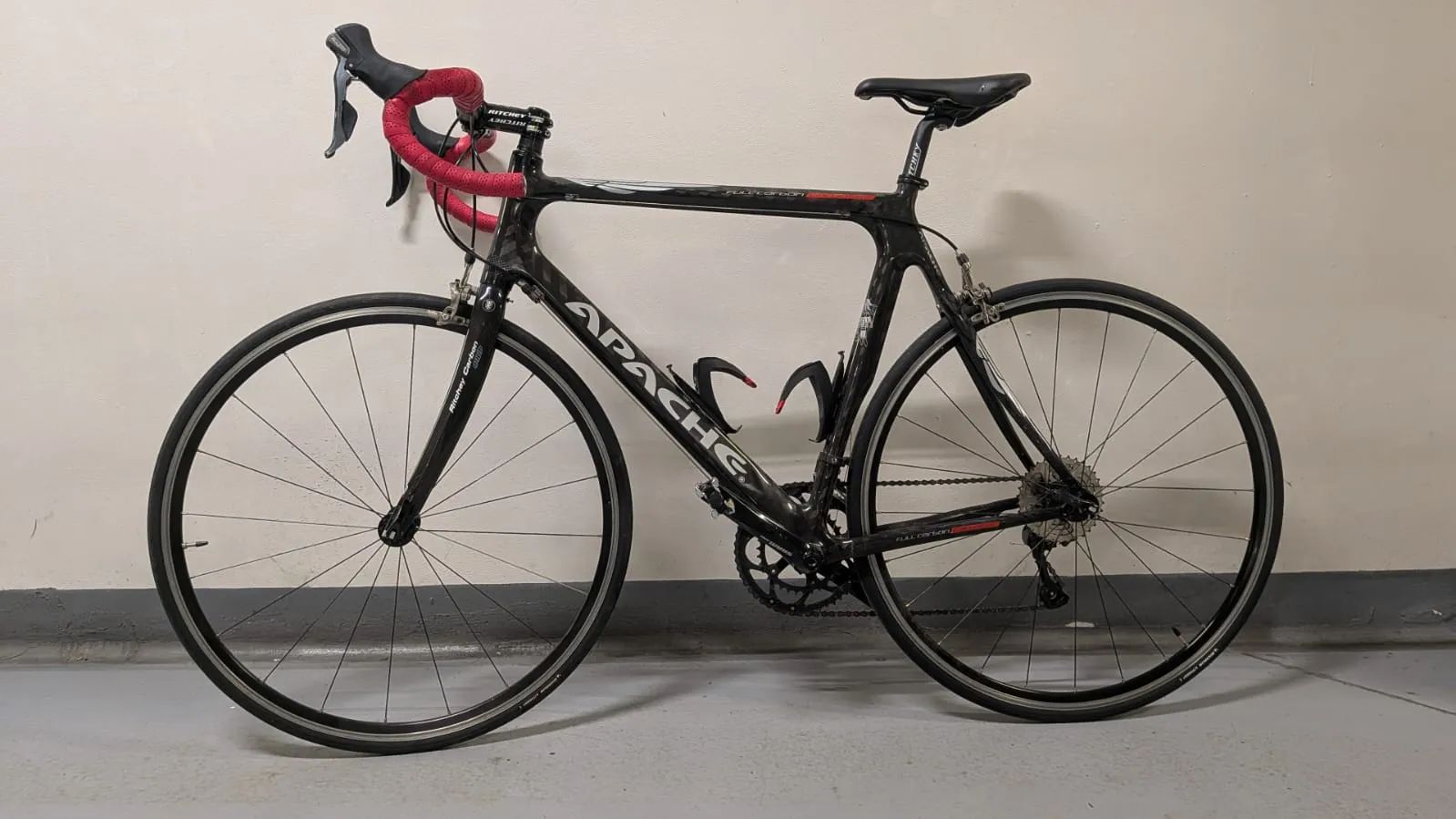 Rám: Apache, karbon, vel. 54 (oni sami už neví, jak se jmenuje, zkoušel jsem k němu sehnat dokumentaci, cca 2011) Vidlice: karbon, Ritchey Přehazovačka: Shimano Tiagra RD4700, mechanická, 10 rychlostí Páky: Shimano Tiagra 4700, nové gumové gripy a kabely Kazeta: Shimano CS-HG500, 11-34 zubů, 10 rychlostí Středové složení: SRAM GXP Team, BSA závit, nové Řetěz: 10-speed, najeto cca 600 km Přesmyk: SRAM Force, mechanický Kliky a talíře: SRAM Apex 50/34, 170 mm Brzdy: SRAM Force, mechanické, špalíky nové (zadní vypodložkovaná o 2 mm) Kola: Fulcrum racing evolution 7, hliník, quick-release (nálepky sloupané pro estetiku, brzdná plocha má ukazatel opotřebení a ještě dlouhý život před sebou) Pláště: Michelin lithion 4, 25 mm (přední najeto 450 km, zadní 30 km, stáří předního cca 8 měsíců, zadní nový) Řidítka: B-Twin, 42 cm, hliník (Decathlon) Představec: Ritchey, 90 mm, karbon Sedlovka: Ritchey, hliník Sedlo: Selle italia Stray Flow Držáky na bidony: Elite, plast (natřené na černo pro estetiku) Pedály: Rockrider 520 (SPD kufry) - ložiska to mají za sebou, ale klidně přihodím, mně k ničemu už nejsou