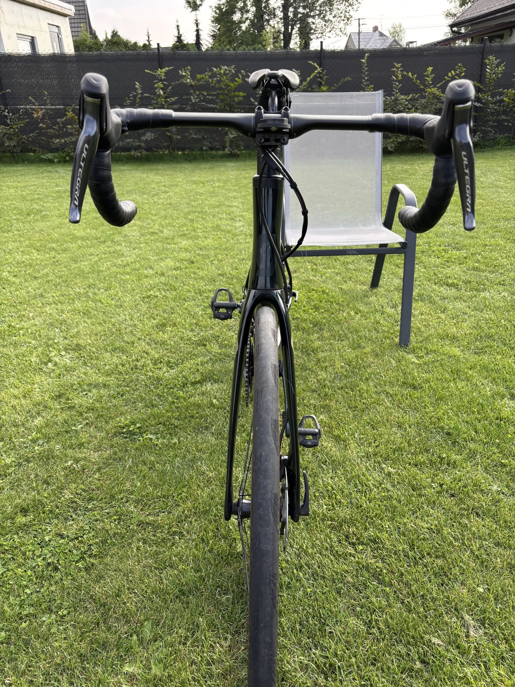 Komplet Shimano Ultegra Di2 + jednotka Bluetooh pro apku v telefonu, S-Works Aerofly karbonové řídítka a sedlovka, karbonový držák Garmin, brašna Syncros, košíky Syncros.