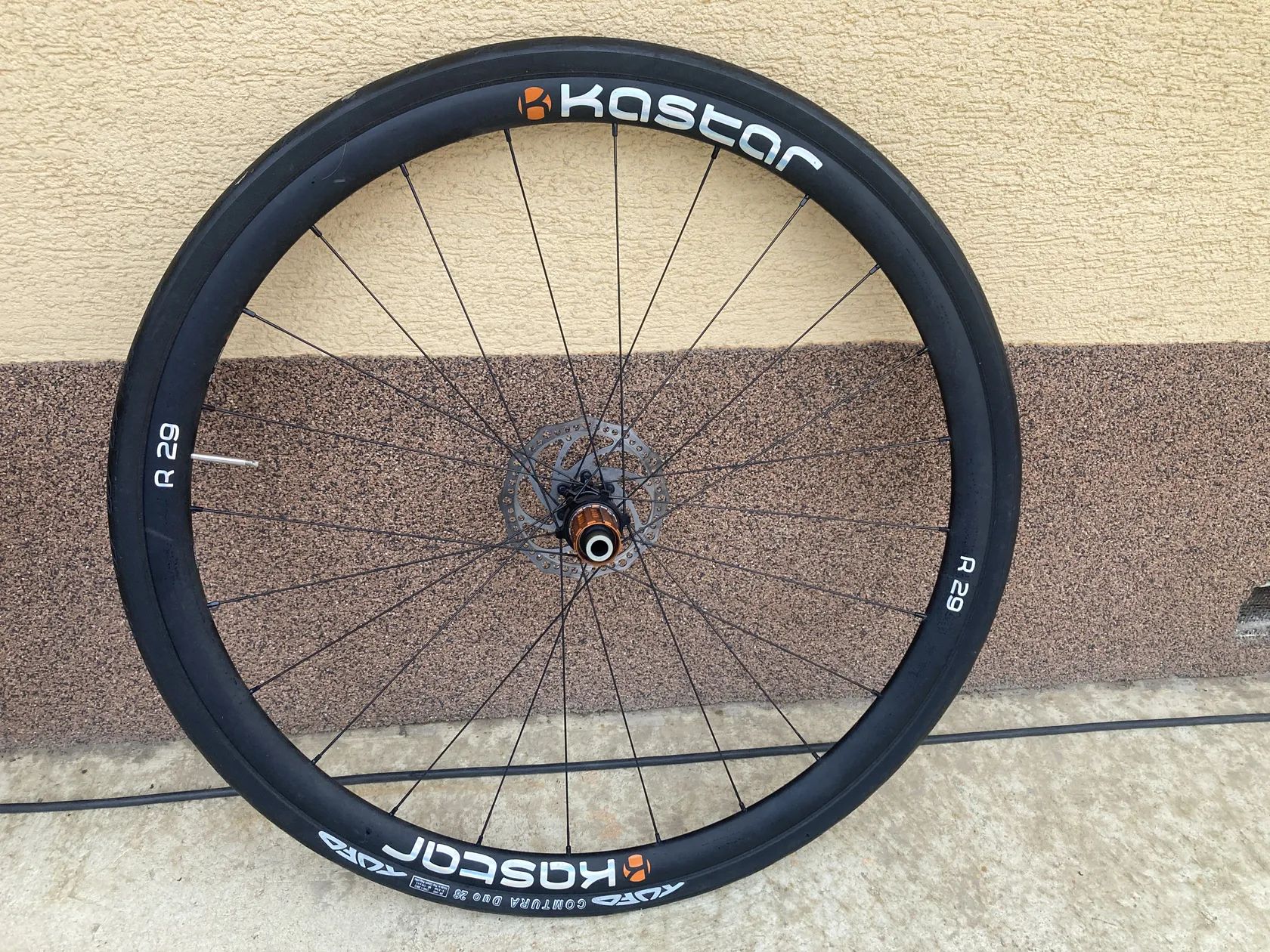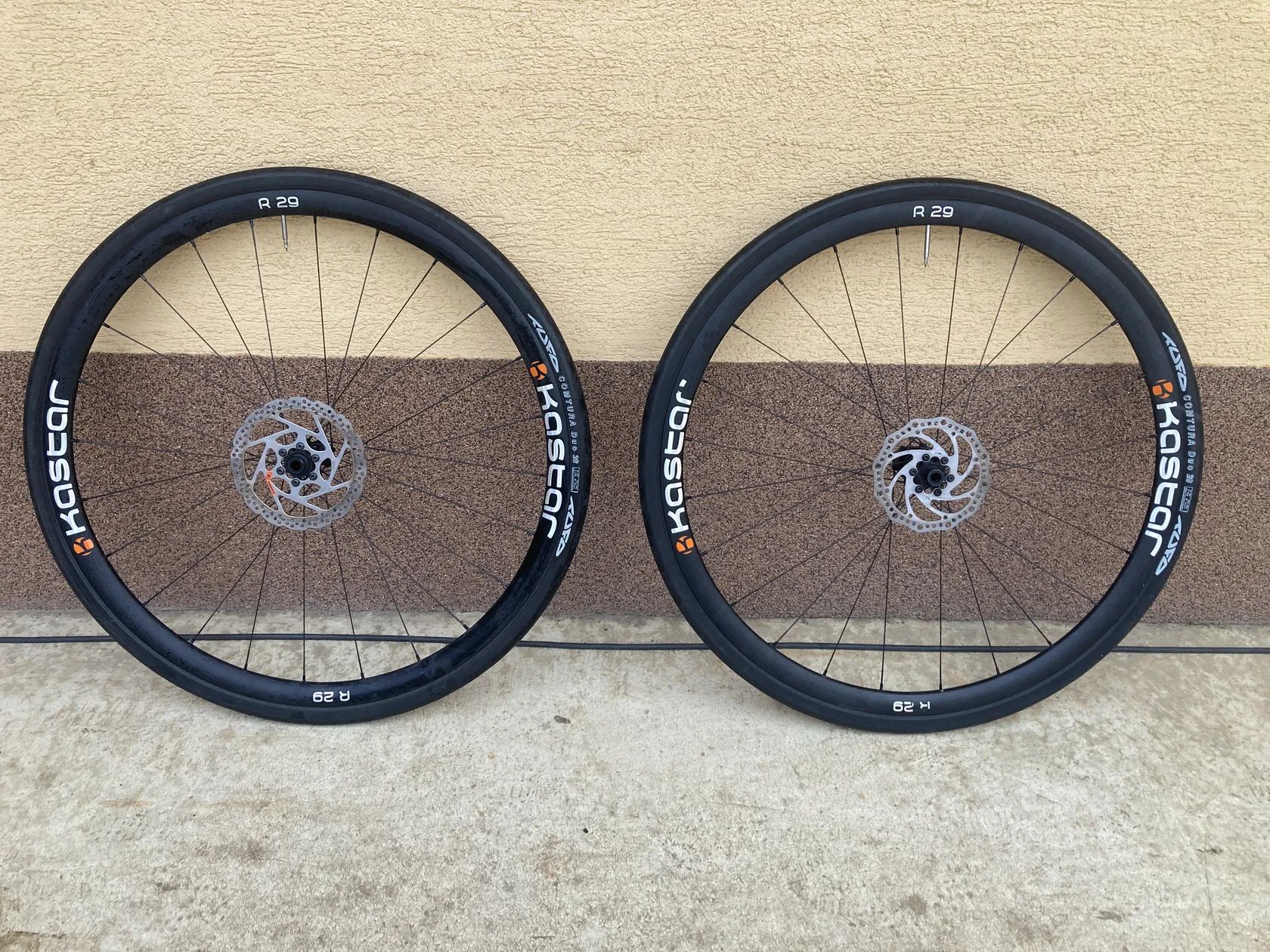 Prodám silniční kola české výroby Kastar R29 Disk. Kola byly ježděny dvě sezony jako tréninkové kola. Váhu výrobce uvádí 1480g. Ořech Shimano HG. Kotouče Shimano 160mm a Force 140mm. Pláště Tufo Comtura Duo 28. Kola jsou v perfektním technickém stavu. Bohužel mají pár drobných přepravních oděrků (viz foto), ty ale na funkci nemají vliv. Při seriózním a rychlém jednání sleva možná. K předání ve Zlíně a okolí, po domluvě možné zaslání Zásilkovnou.